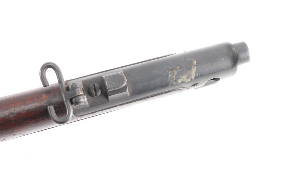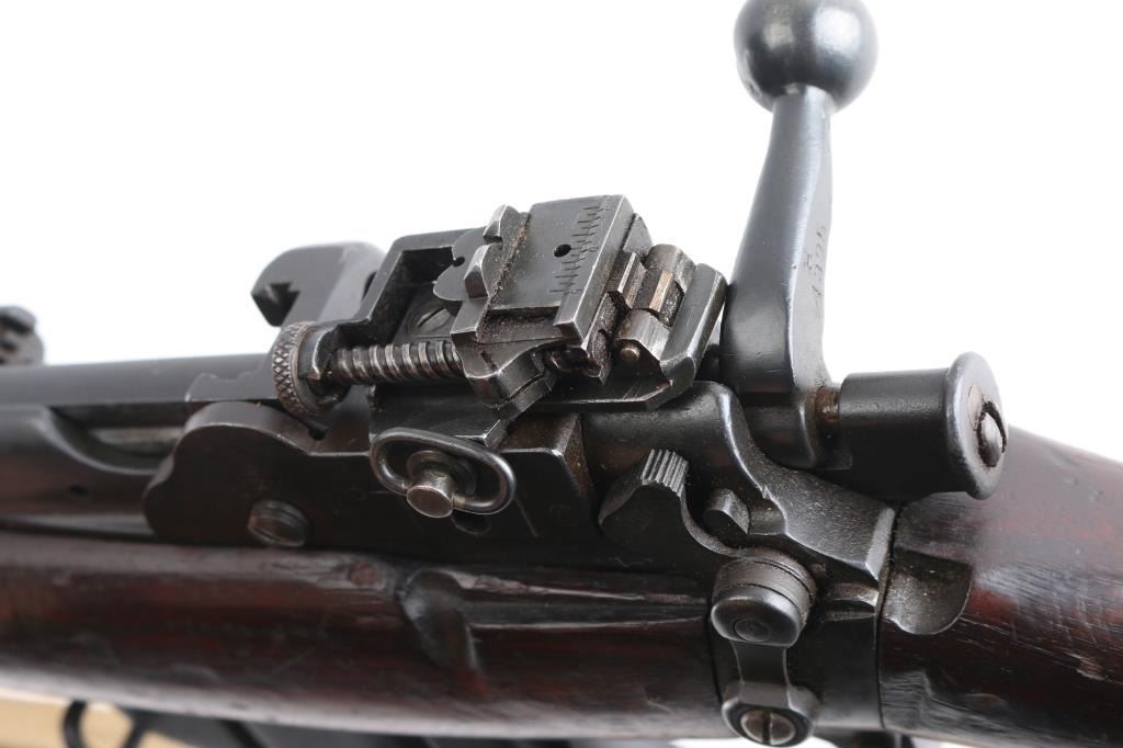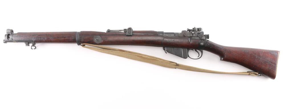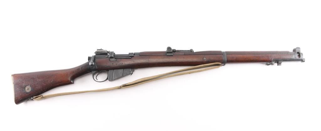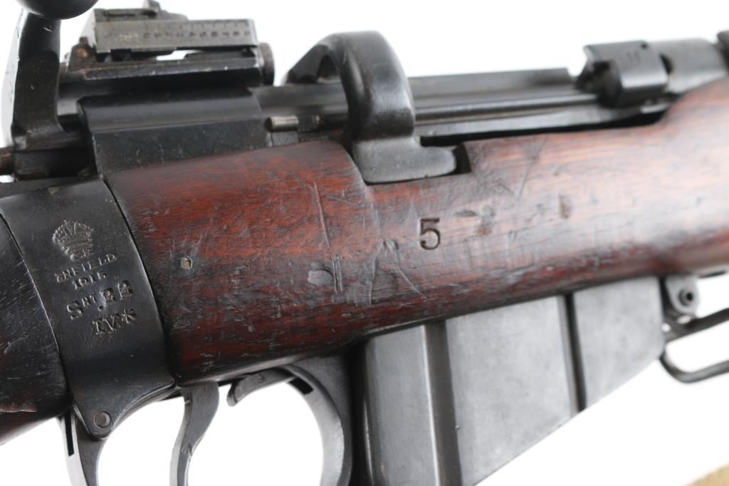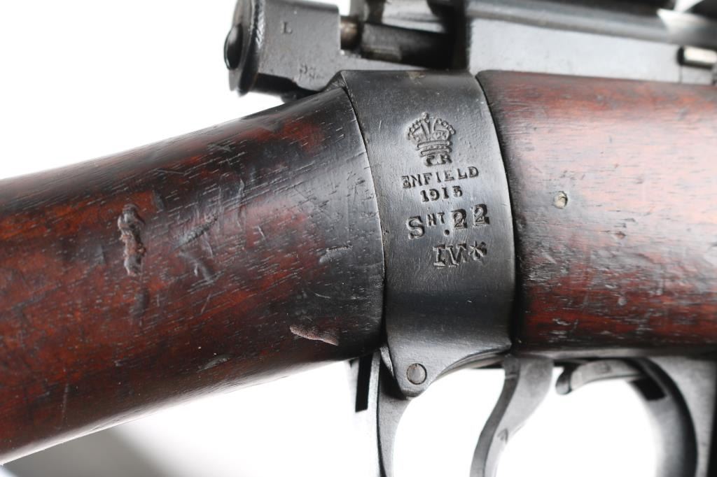 British military single shot bolt action training rifle chambered in .22 caliber rimfire. Features a dark blue finish, 25.2" barrel, raised patridge front sight, leaf style rear sight graduated to 2,000, metal nose cap with protective front sight ears, bayonet lug with piling swivel, serrated trigger, "22" marked hollowed magazine that acts as a brass collector, manual safety on the left side of the receiver, integral charge loading bridge on the receiver, smooth full-length wood handguard & forend and straight grip shoulder stock with brass trapdoor buttplate, brass disc inletted in right buttstock, volley sight on the left fore stock.. The right side of the butt socket is marked "Crown Enfield 1915 SHT. 22 IV," Rifle retains approximately 92% of it's blued finish showing handling/edge wear. Action is smooth, the bore is excellent and the wood stocks are very good/Sound. Comes with correct canvass sling.