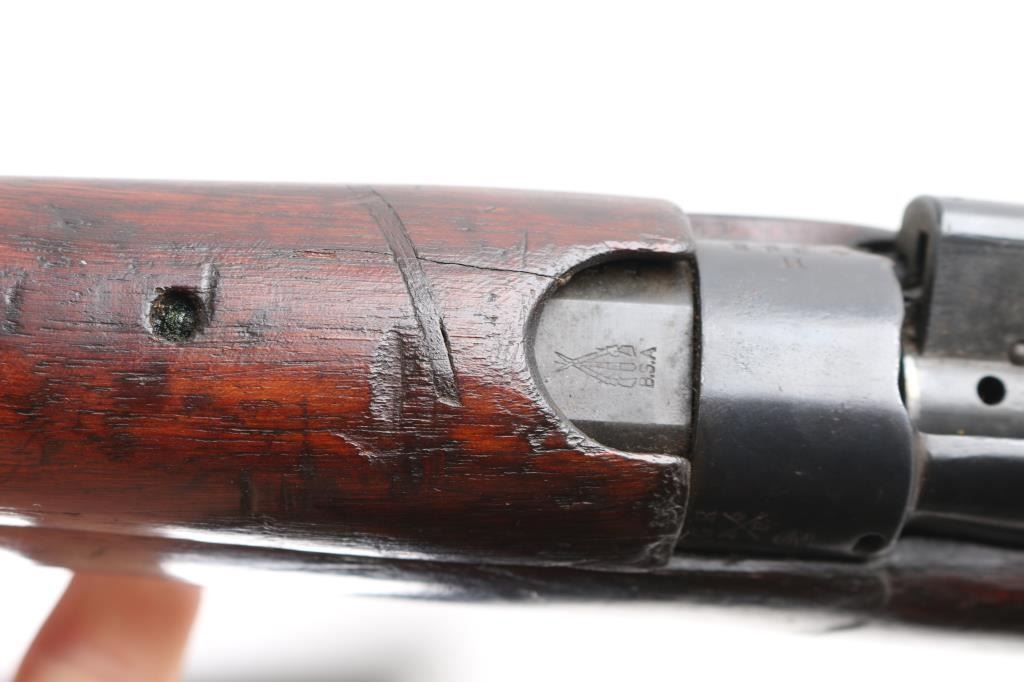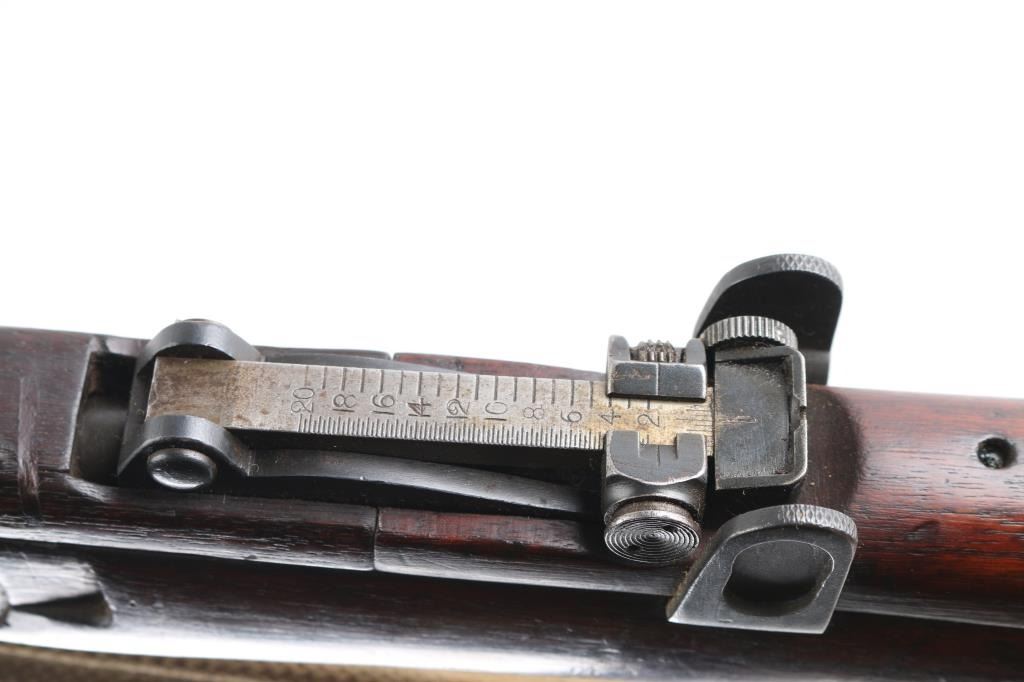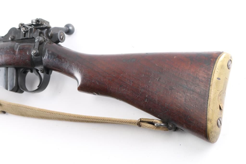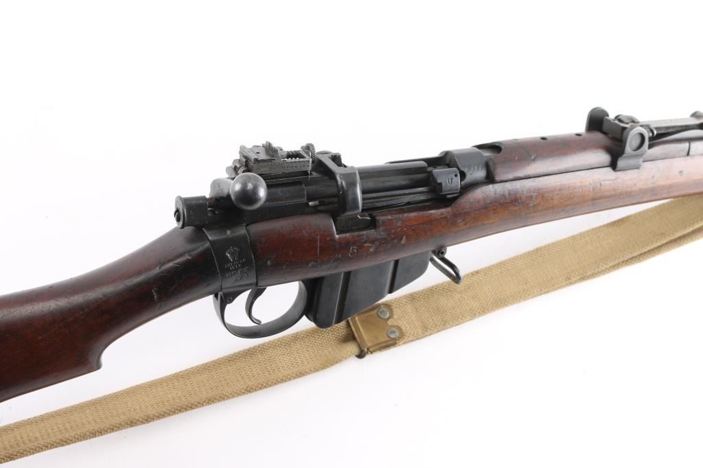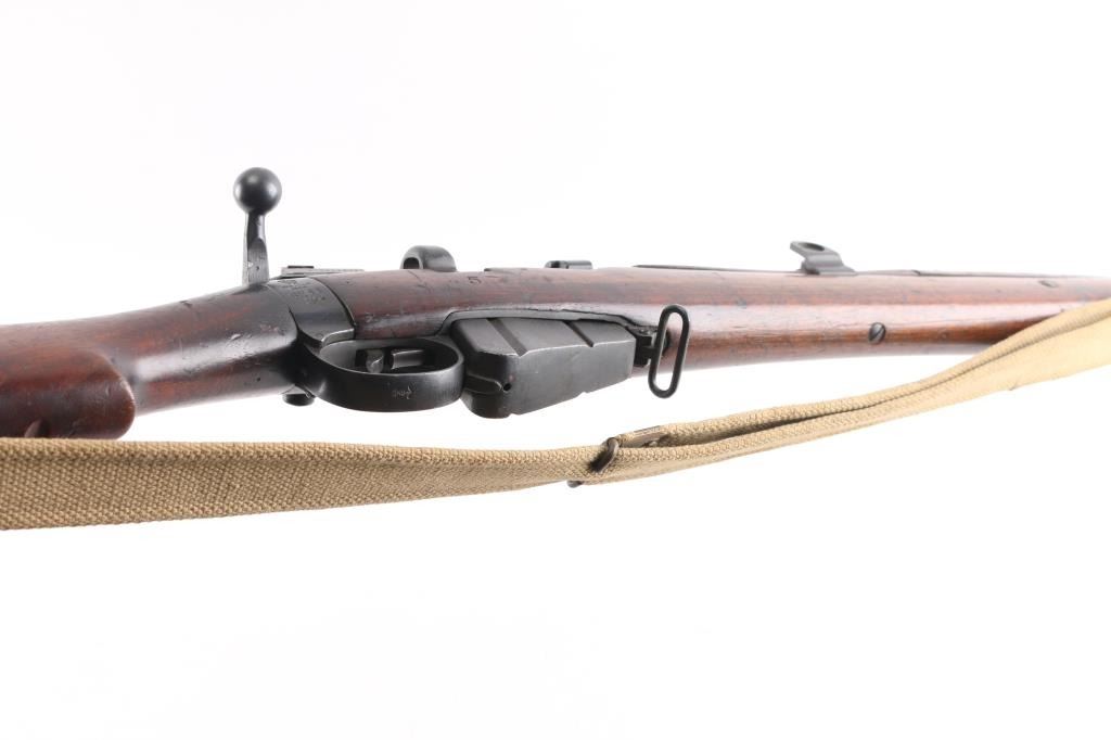 British military single shot bolt action training rifle chambered in .22 caliber rimfire. Features a dark blue finish, 25.2" barrel, raised patridge front sight, leaf style rear sight graduated to 2,000, metal nose cap with protective front sight ears, bayonet lug with piling swivel, serrated trigger, "22" marked hollowed magazine that acts as a brass collector, manual safety on the left side of the receiver, integral charge loading bridge on the receiver, smooth full-length wood handguard & forend and straight grip shoulder stock with brass trapdoor buttplate, brass disc inletted in right buttstock, volley sight on the left fore stock.. The right side of the butt socket is marked "Crown Enfield 1915 SHT. 22 IV," Rifle retains approximately 92% of it's blued finish showing handling/edge wear. Action is smooth, the bore is excellent and the wood stocks are very good/Sound. Comes with correct canvass sling.