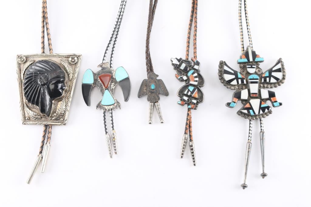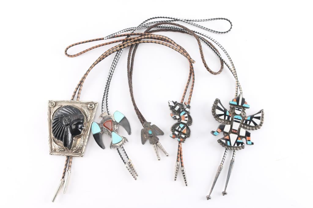 (1)Inlaid mother of pearl, coral, and turquoise kachina dancer bolo.