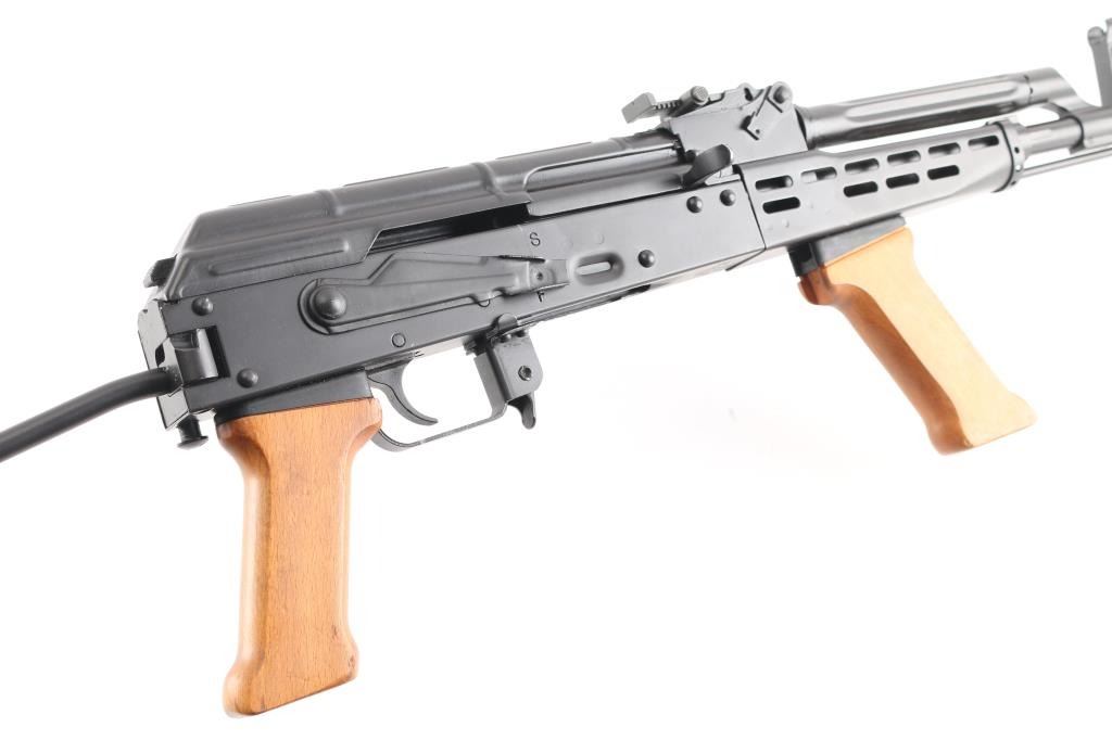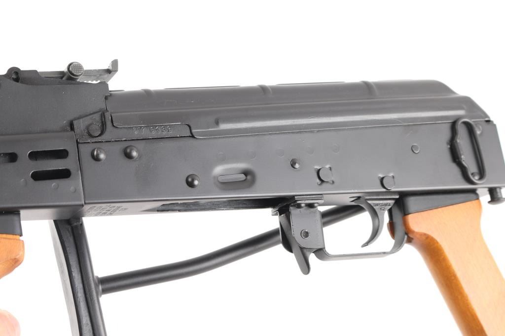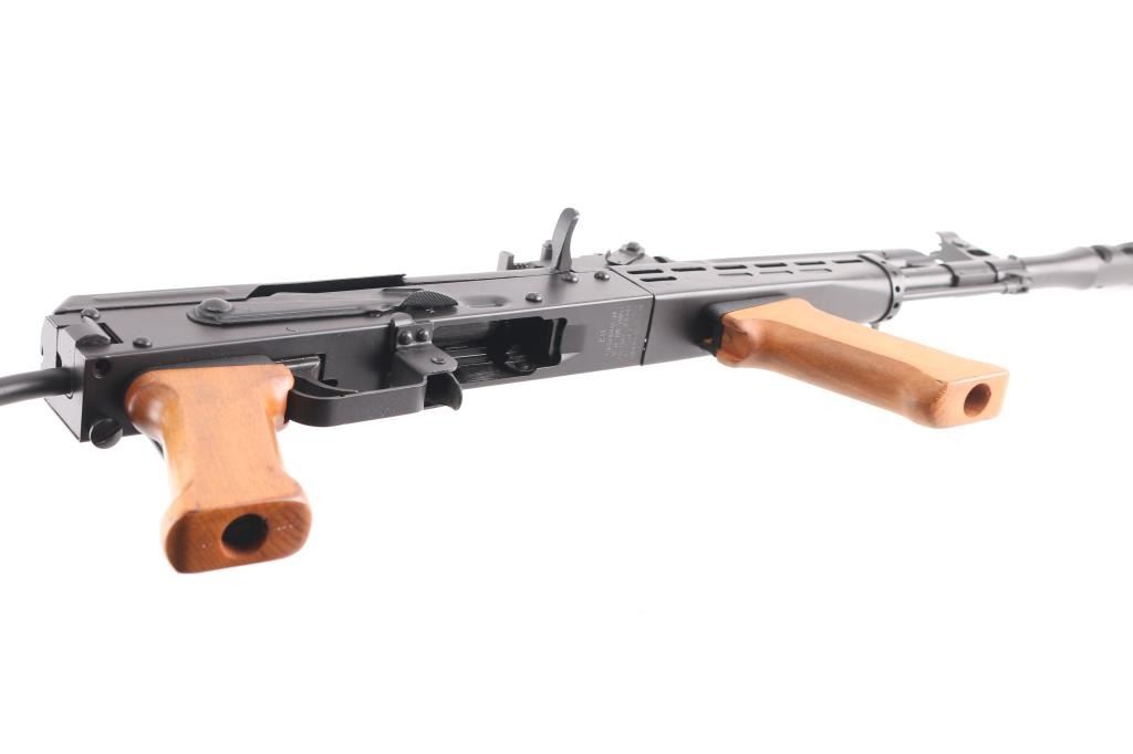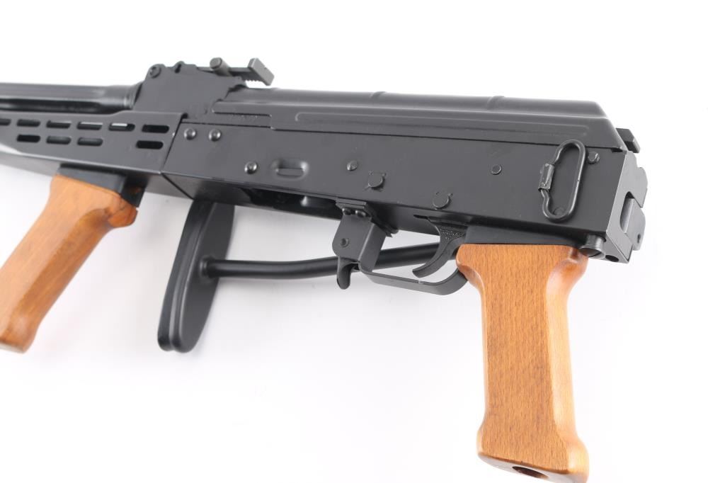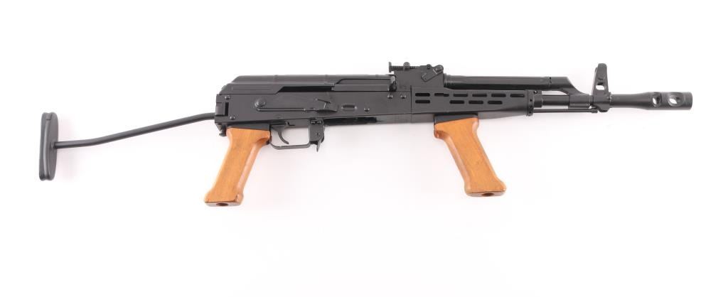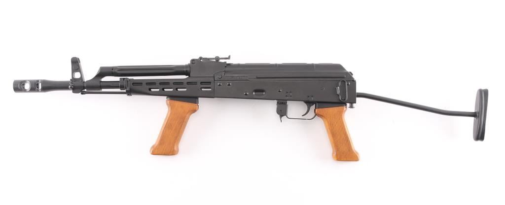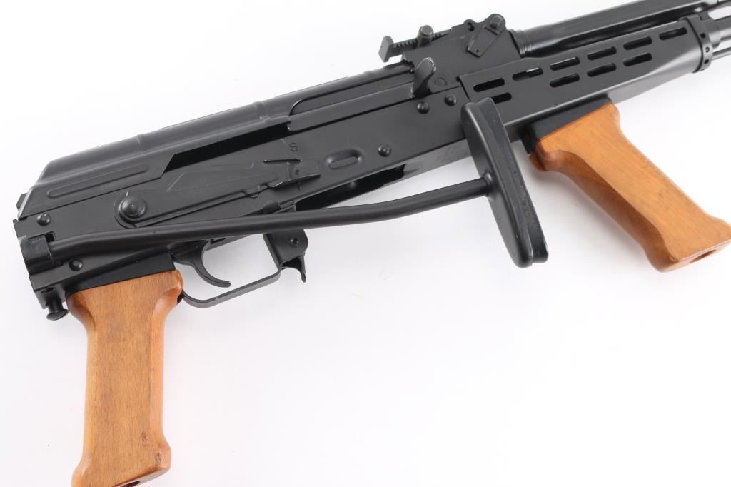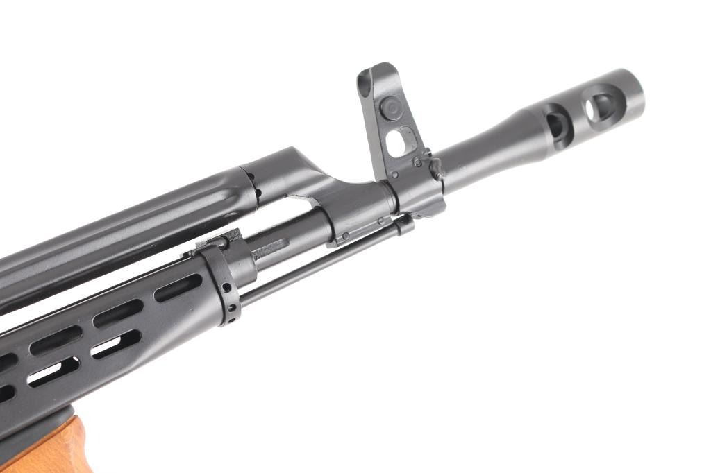 Semiautomatic rifle built on a US made receiver, using Hungarian military rifle parts. Has the likeness of the AMD-65, an AKM variant rifle. Pinned and welded 4.5" muzzle brake to achieve over 16" of barrel length, original barrel is 12.5" long. Features matte black finish, adjustable front sight post, tangent rear sight, manual safety, ventilated steel handguard, wood pistol grip & fore grip, side folding wire stock, sling swivels. Bore is very good. Retains 95% finish with handling marks. Wood is very good. No magazine.