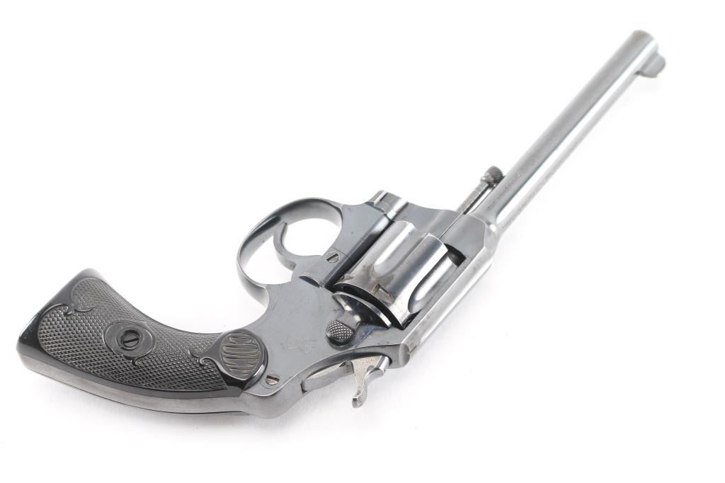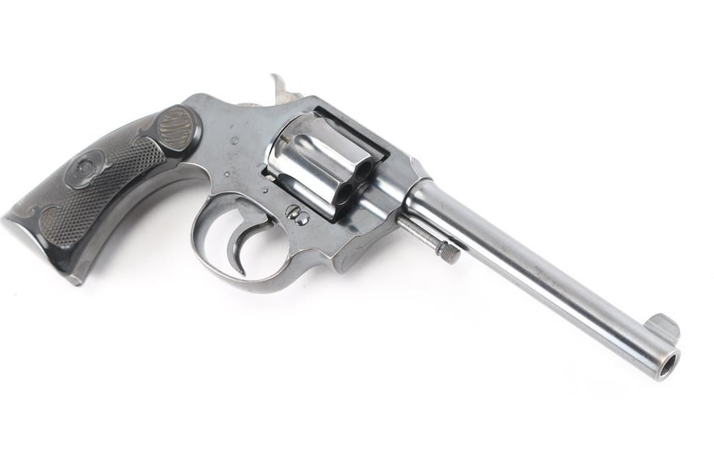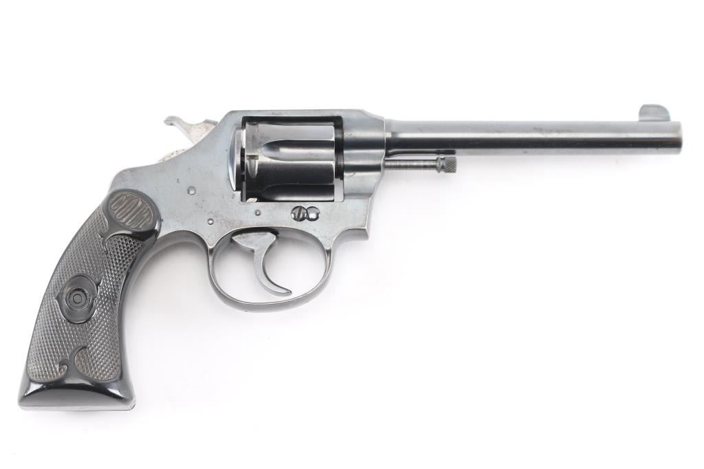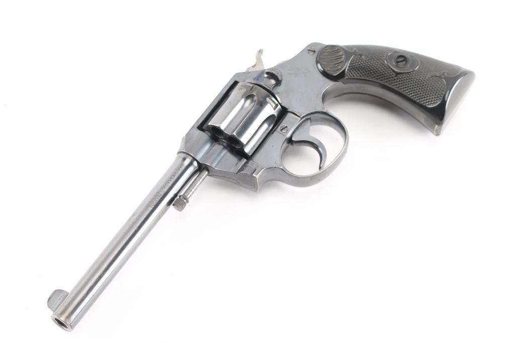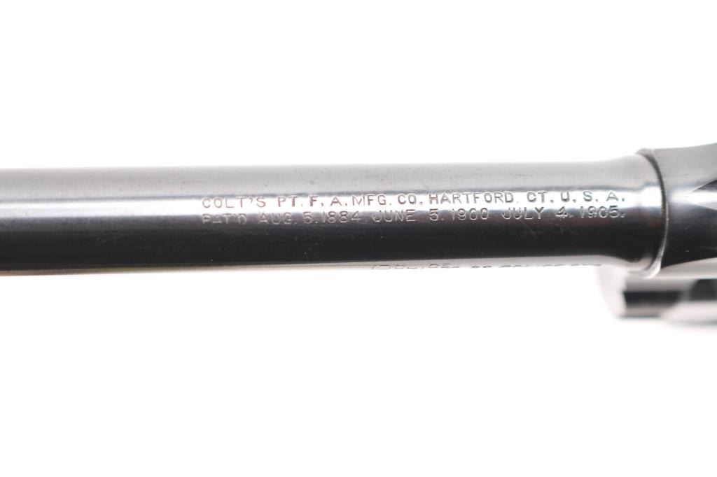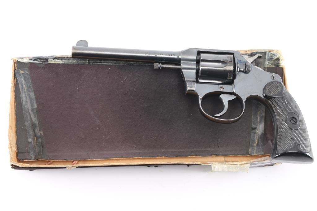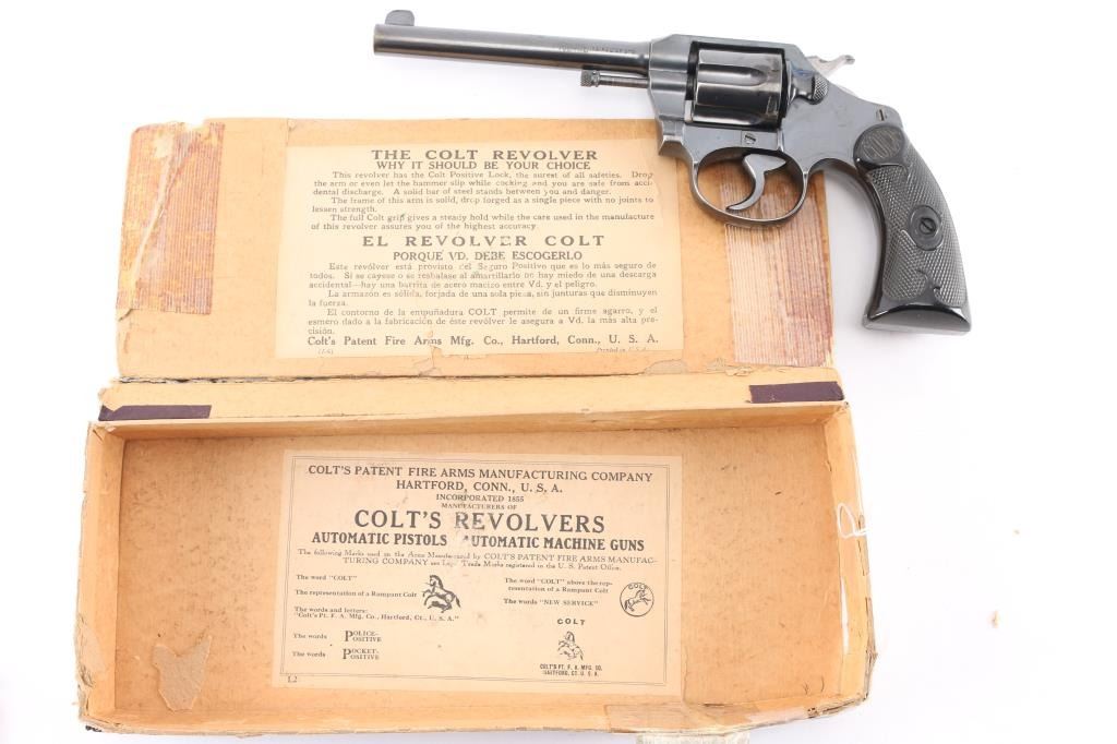 SN: 164257. Vintage double action six-shot revolver chambered in .32 Police, manufactured circa 1920. Features blued finish, checkered hard rubber grips with "Colt" motifs, fixed sights, 4 3/4" barrel, 6 shot swing-out cylinder, checkered hammer spur, smooth trigger, fires in double or single action mode. Bore is in excellent, bright with strong rifling. Charge holes are in excellent condition; need cleaning. Retains 94% coverage of original blue finish, with some minor edge wear, handling wear on the back strap, and minor scratches. All markings are crisp. Grips are in very good condition, no visible shrinkage. Action is smooth and lock-up is tight. Comes in original blue cardboard factory box with matching Police positive labels two on the inside (One in Spanish), and outside. Edges are scuffed, edges missing from the front lid, some separations, taped repairs.