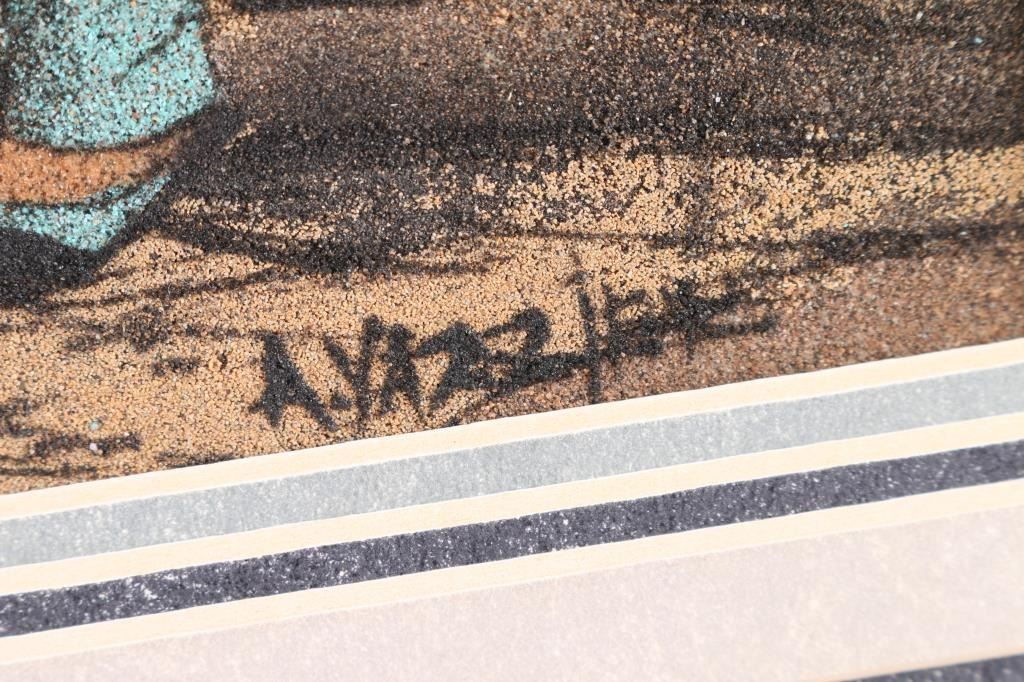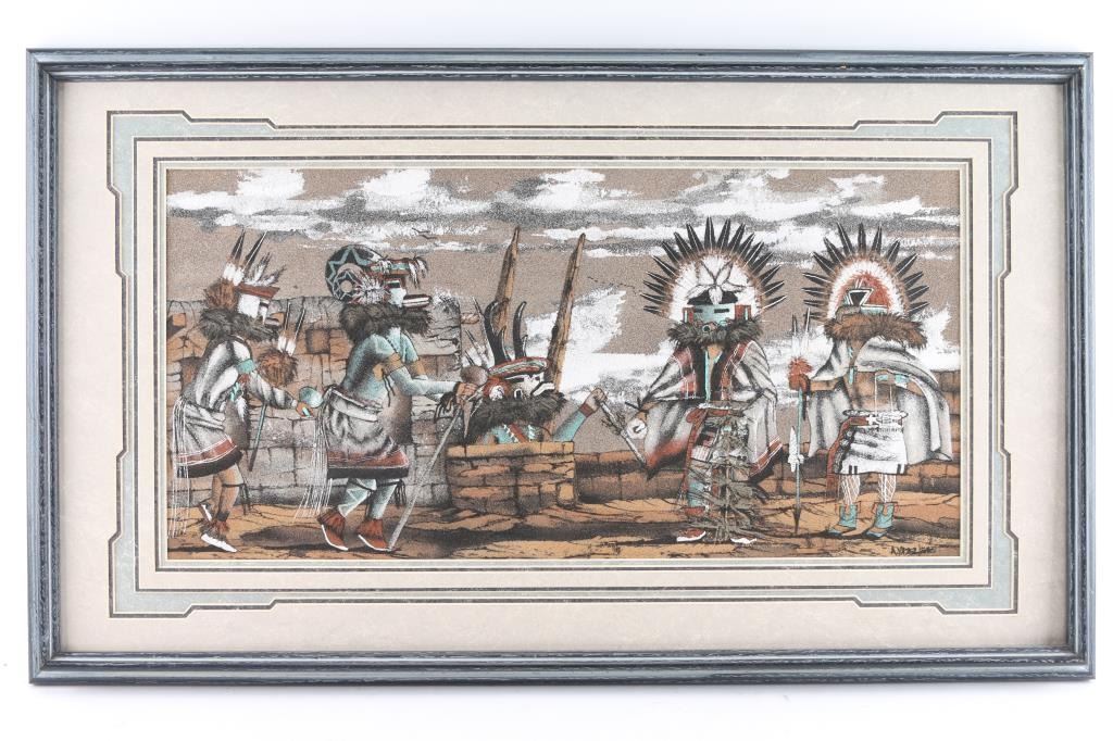 Depicting Kachina Dancers, signed by A. Yazzie, triple matted and framed, measures 24"x12".