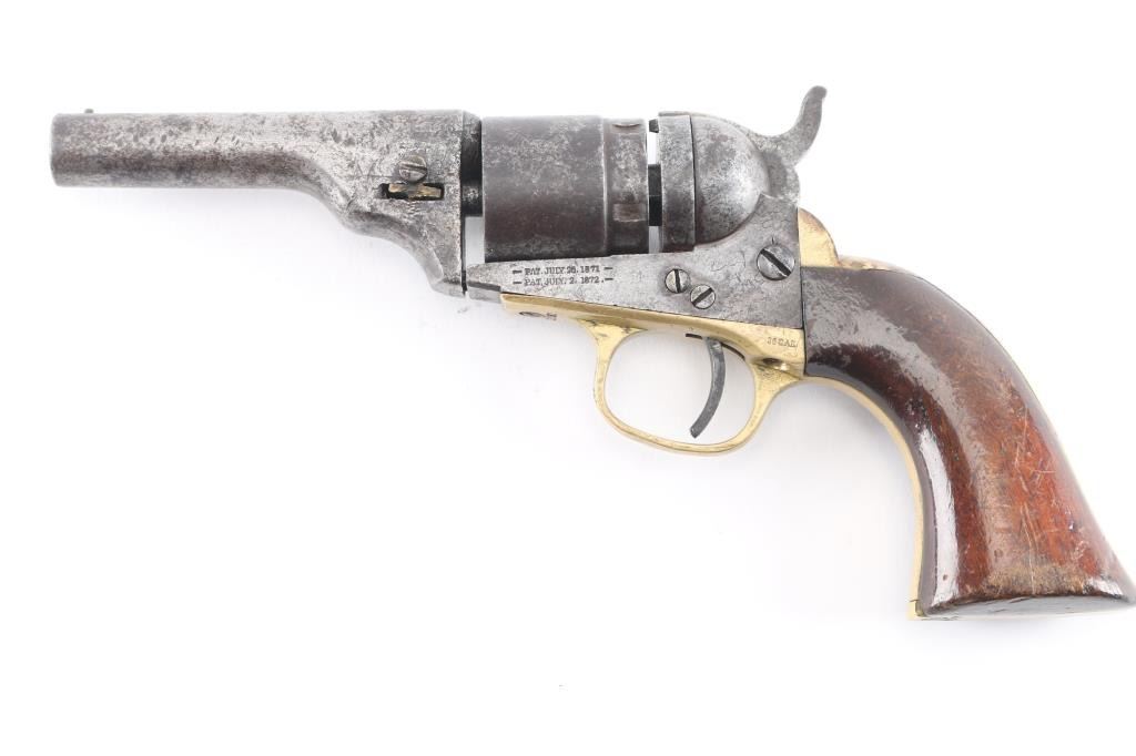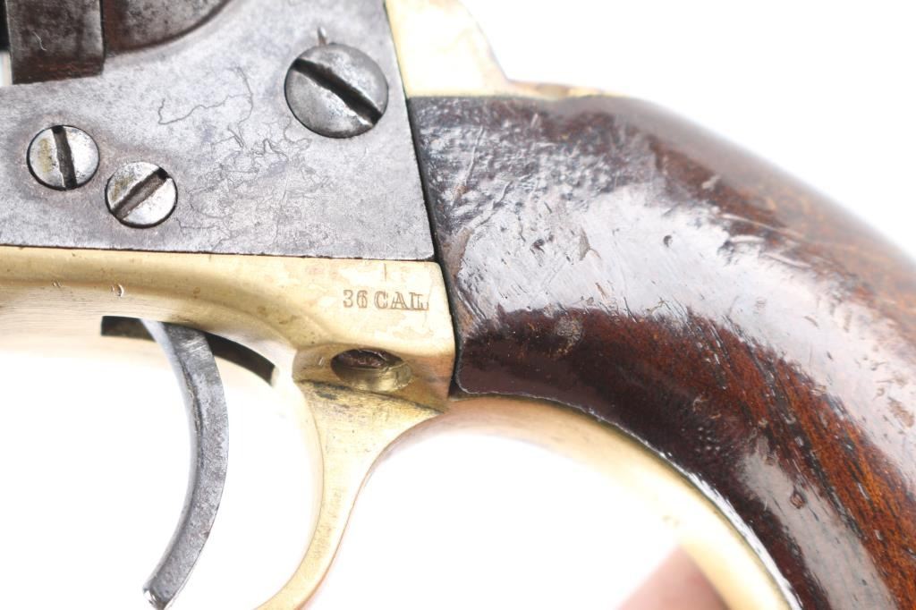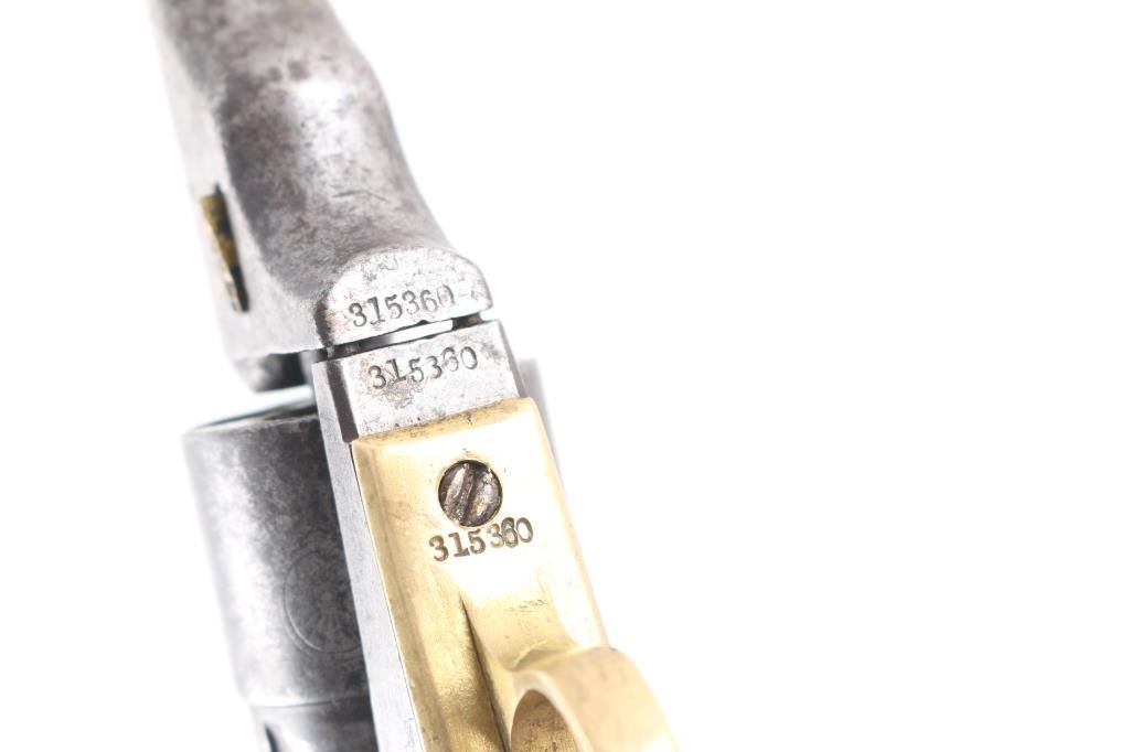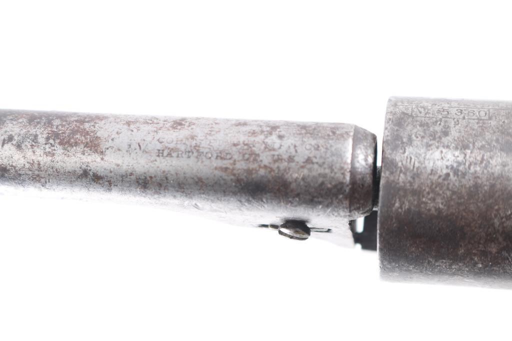This is a model 1849 Pocket revolver factory converted to .38 RF, manufactured in 1869 and later one of approximately 6,500 converted c. 1873-1875. The barrel has the two-line Hartford address, two line conversion patents "-Pat, July 26, 187-,& -Pat. July 2, 1872-" " marked on the left of the frame, "36 CAL" on the left of the trigger guard, and the stagecoach hold up scene roll engraved on the cylinder. (very feint) Matching visible serial numbers including "5360" partial number on the cylinder. Modified RF hammer, & recoil shield with loading gate. Finish has turned a molted gray/brown patina, action works well, grips are good/sound with minor scratches, have been varnished, brass grip strap has brown discoloration, the bore is fair, strong rifling, light pitting, and the wedge is broken.