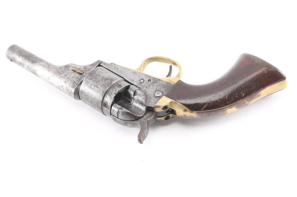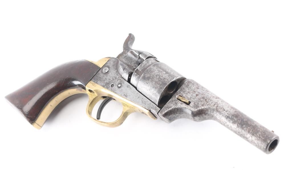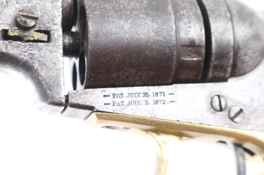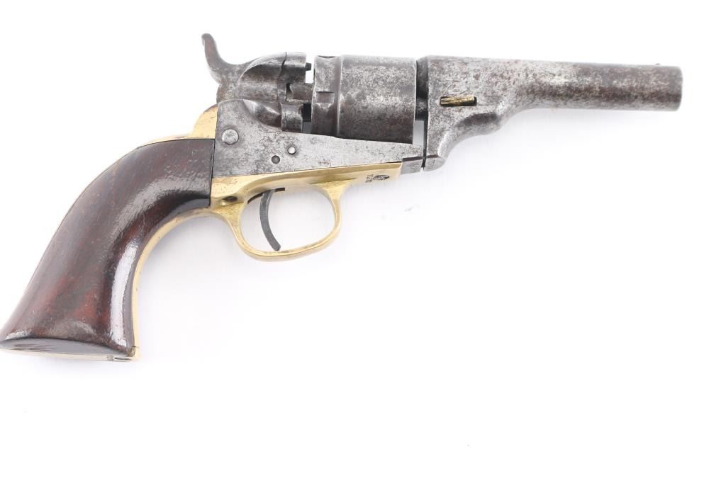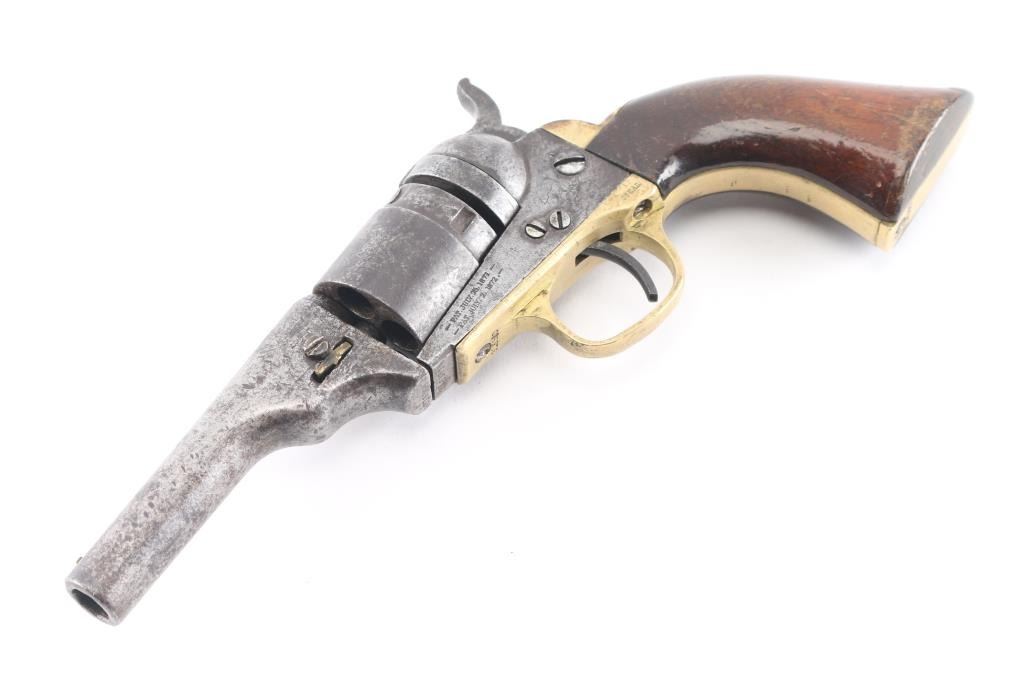 This is a model 1849 Pocket revolver factory converted to .38 RF, manufactured in 1869 and later one of approximately 6,500 converted c. 1873-1875. The barrel has the two-line Hartford address, two line conversion patents "-Pat, July 26, 187-,& -Pat. July 2, 1872-" " marked on the left of the frame, "36 CAL" on the left of the trigger guard, and the stagecoach hold up scene roll engraved on the cylinder. (very feint) Matching visible serial numbers including "5360" partial number on the cylinder. Modified RF hammer, & recoil shield with loading gate. Finish has turned a molted gray/brown patina, action works well, grips are good/sound with minor scratches, have been varnished, brass grip strap has brown discoloration, the bore is fair, strong rifling, light pitting, and the wedge is broken.