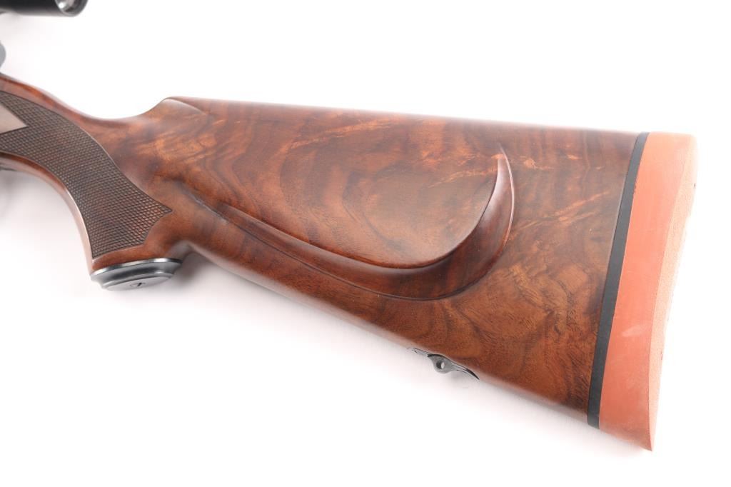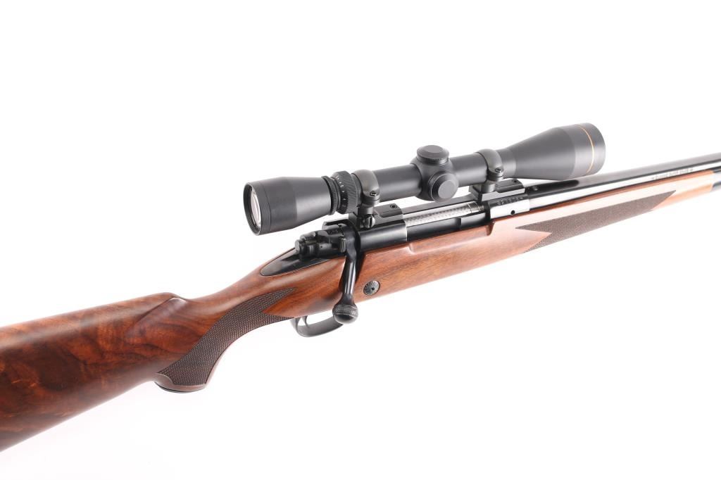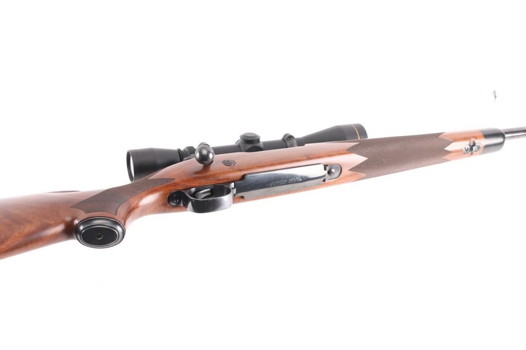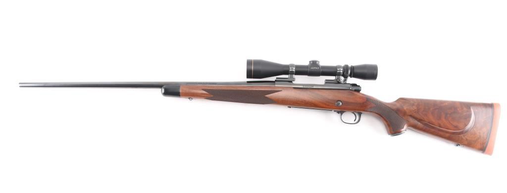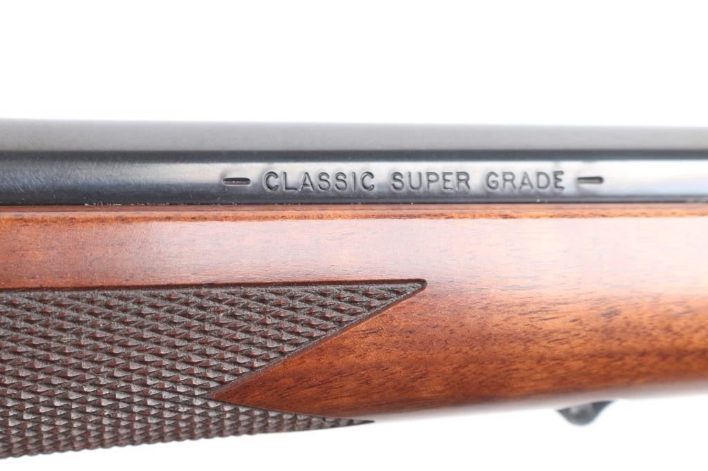 'Classic Super Grade' bolt action rifle with controlled round feed, Mauser type claw extractor, steel recoil lug with engraved heads. "SUPER GRADE" engraved on floorplate. Features blued finish, fancy figured walnut stock with checkered panels at wrist & forend, right handed cheek piece, contrasting black forend tip (appears to be ebony), factory red rubber recoil pad, 26" barrel, no sights, European style inlet oval base sling studs, three position safety on bolt shroud, hinged floorplate, two piece Leupold bases & rings. Jeweled bolt body, swept-back bolt handle. Bore is excellent. Overall condition is excellent with minor handling marks. Mounts a very good condition Leupold Vari-X IIc 3-9x scope, duplex reticle, clear view.