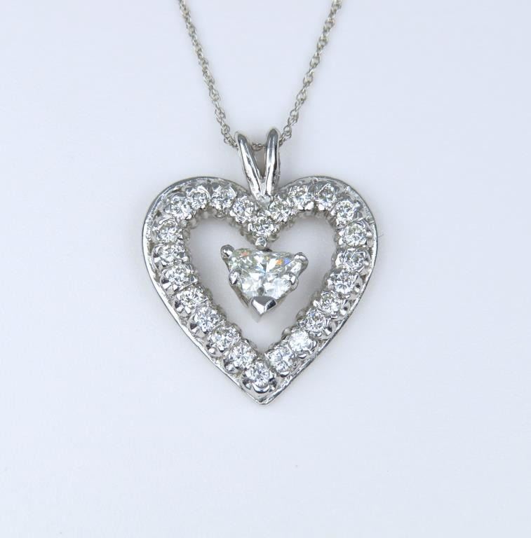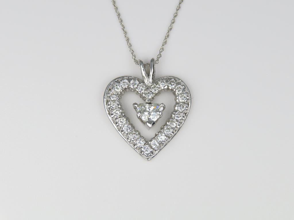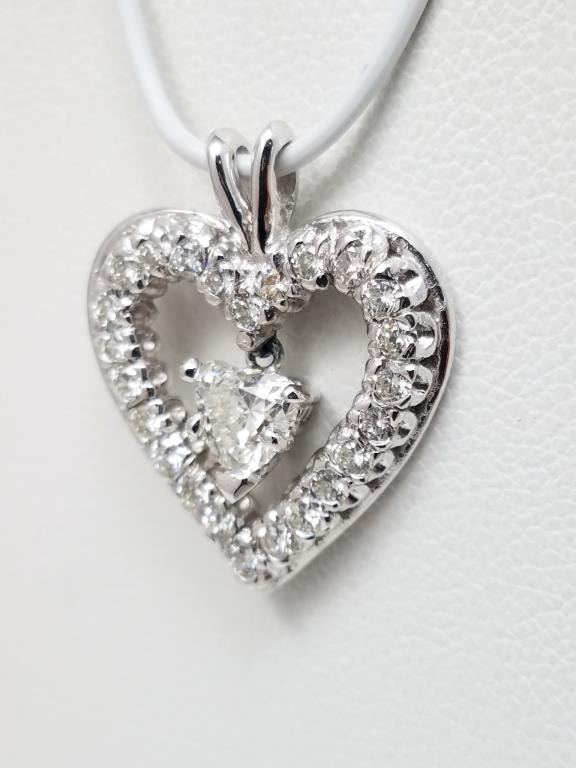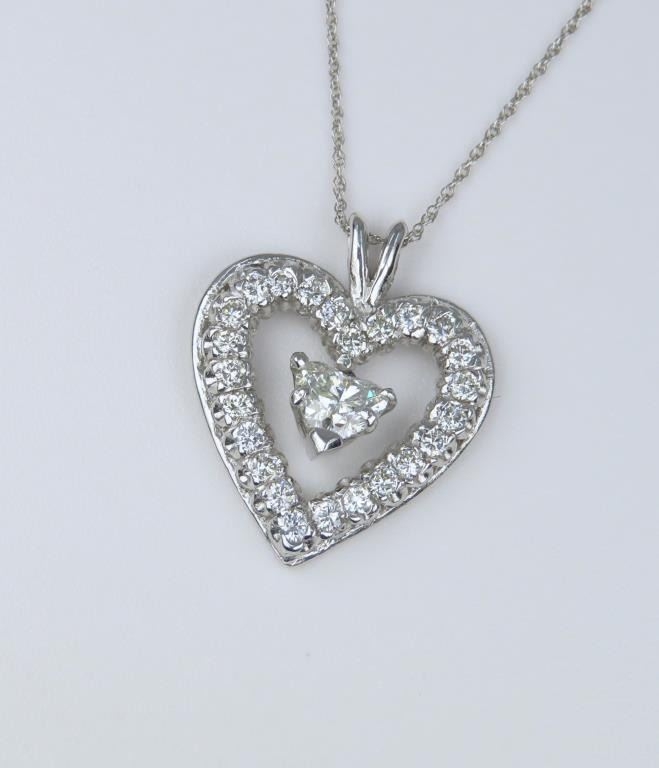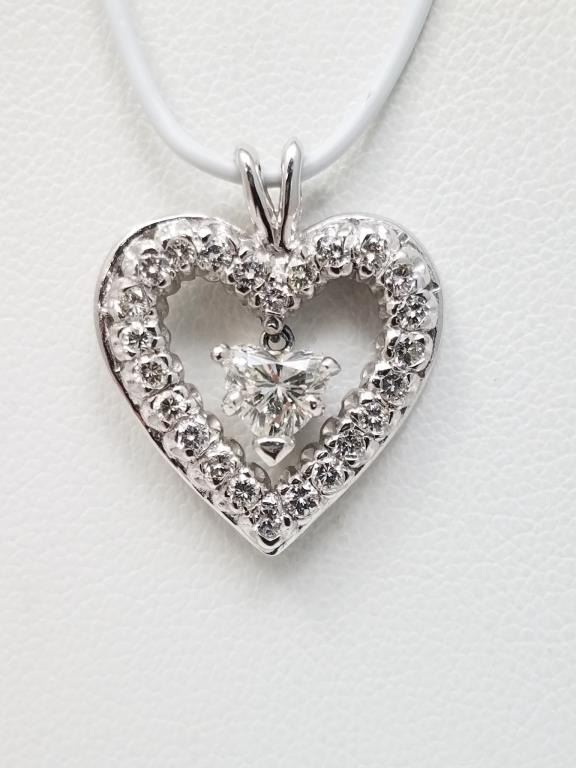 Pendant featuring a center Heart Shape Diamond weighing approx. 0.75 carats with F-G color and VS clarity accented with 24 round ‘IDEAL’ cut Diamonds weighing approx. 1.00 carat with F-G colors and VS clarity set in a 14 karat white gold custom setting. Retail $5,000-$6,000