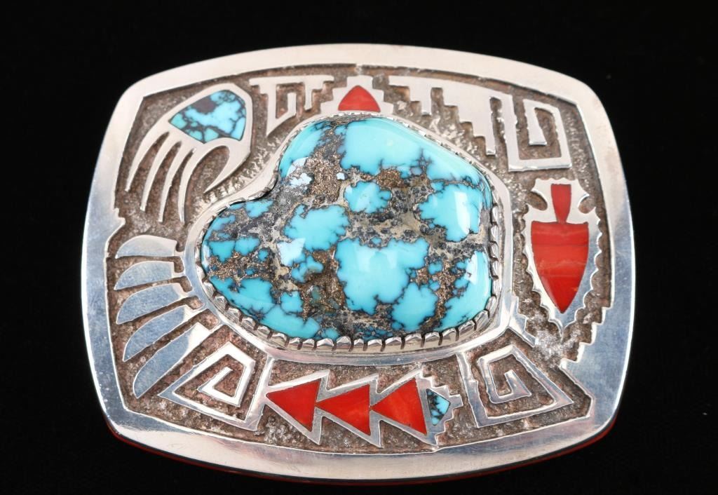 Large turquoise nugget surrounded by engraved design, inlaid with coral and turquoise. Maker marked "MP". Size: 3 1/2"X 2 1/2".