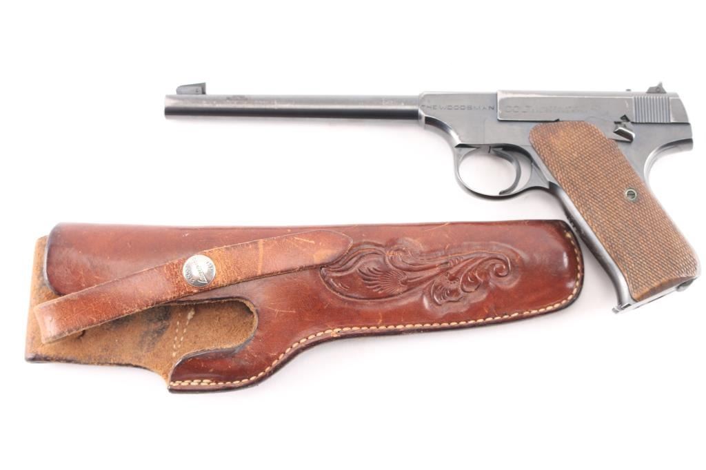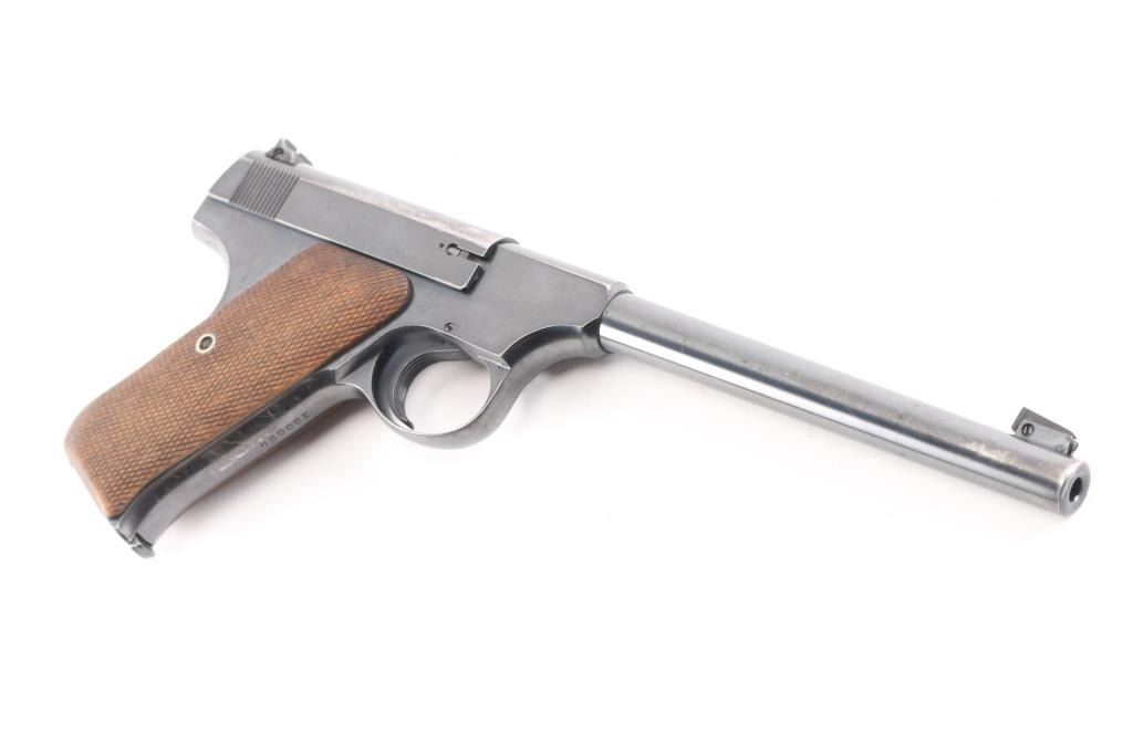 Semiautomatic rimfire pistol manufactured circa 1939. Features blued finish, checkered walnut grips, 6.75" barrel, blade front sight, rear sight in dovetail with adjustment screws, heel magazine release, manual safety. Bore is very good condition. Retains 75% blue, with edge losses, scratches, thinning and fading along barrel, several small areas of pinprick pitting. Grips are good condition with handling wear to checkering points. Includes good condition Lawrence belt holster, one magazine.