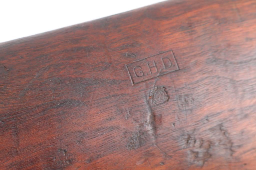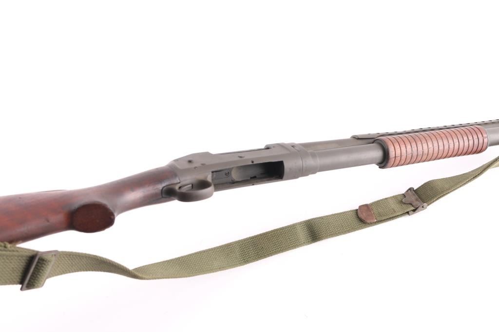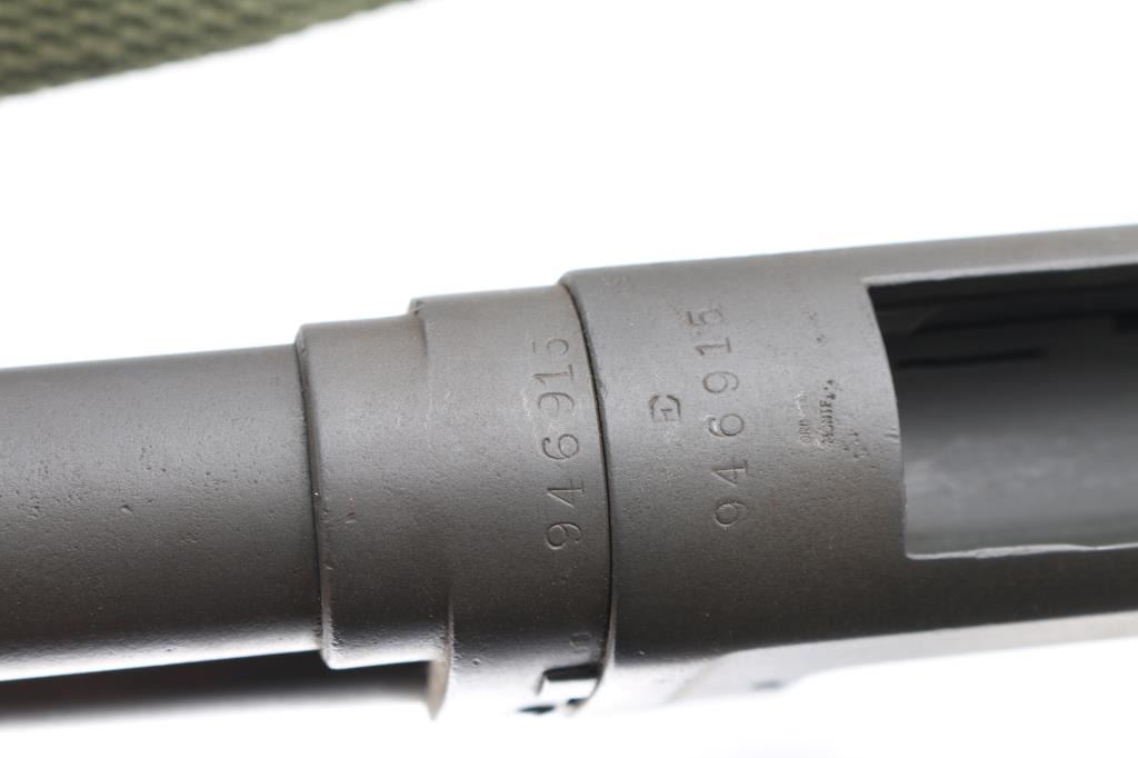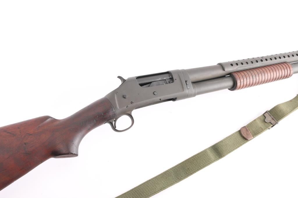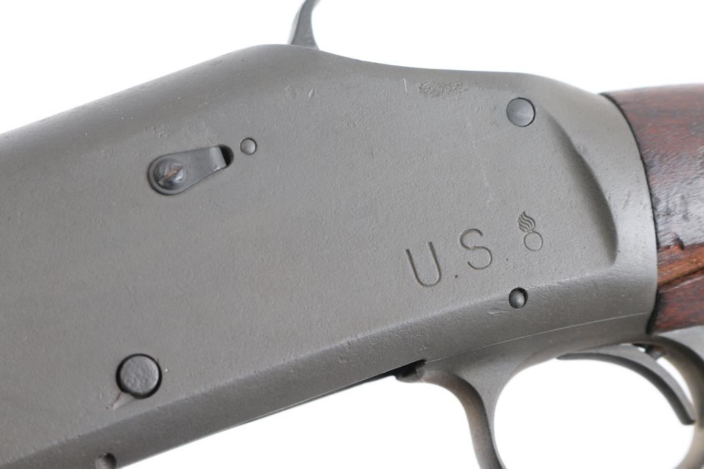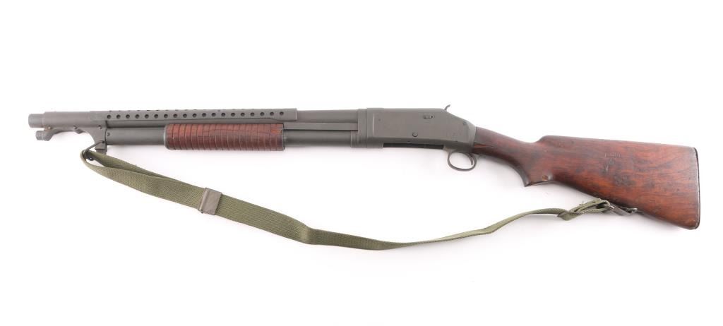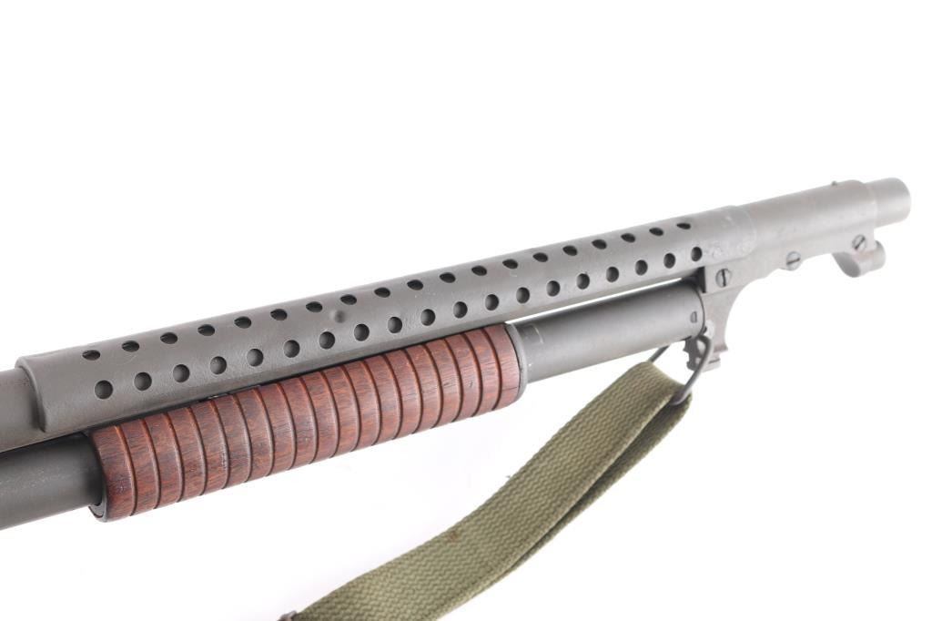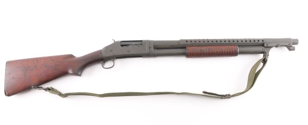 SN: 946915 Vintage slide action repeating shotgun chambered for 2 ¾” 12 Gauge shells. Manufactured in New Haven, CT circa 1948 and reimported by Federal Ordnance of El Monte, CA with small partial stamps on the receiver.. This shotgun is configured as a US Trench Gun and is in the correct serial number range to be one. It features a parkerized refinish, 20 ¾” cylinder bore barrel, all steel type “W” bayonet attachment with bead sight & ventilated heat shield (4 rows of 19 holes), 5 round tube magazine, take-down receiver, smooth curved trigger, knurled hammer spur, green canvas sling, grooved walnut slide hande and smooth semi-pistol grip shoulder stock with smooth steel buttplate. Markings: Barrel - standard commercial markings, [Winchester proof] & [flaming bomb]. Receiver - “U.S.” & [flaming bomb] (both approximately .26” tall) & Buttstock: “G.H.D.” inside a rectangle and [crossed cannons]. Matching serial numbers are found on the receiver and receiver extension. Shotgun retains approximately 95% of its parkerized refinish showing a moderate amount of scattered pitting underneath. The action is mechanically sound, the bore is good showing some light erosion & creases from the bayonet attachment installation, the markings are very good and the walnut stocks are fair to good with hairline cracks & small losses.