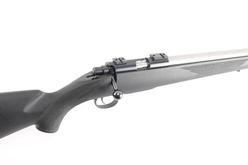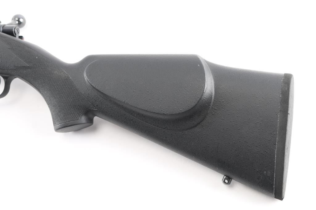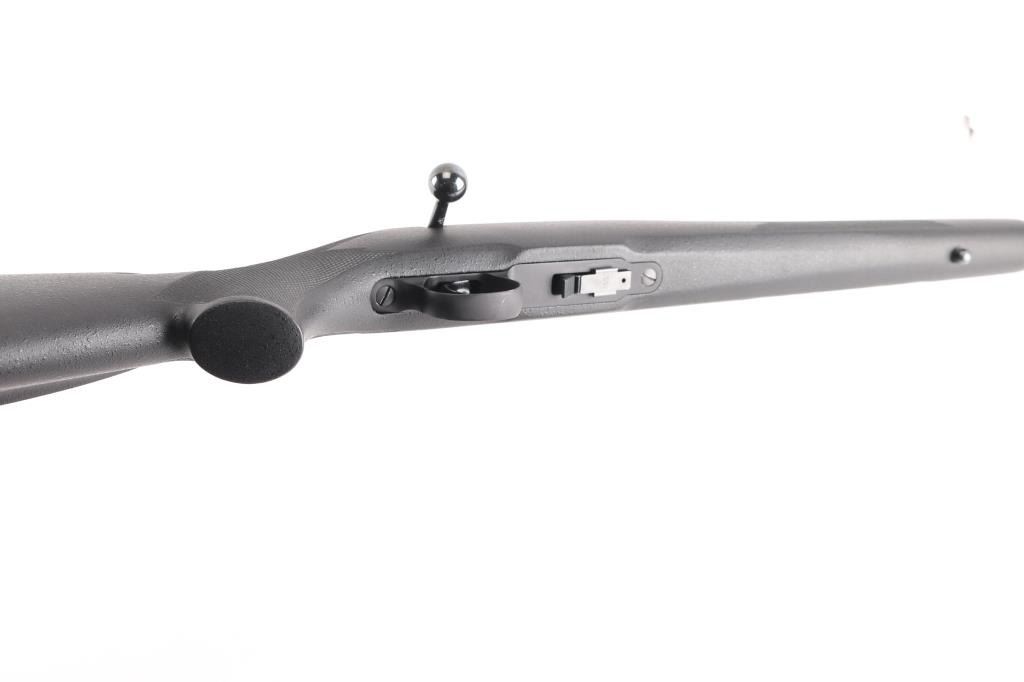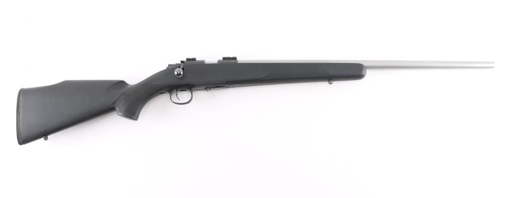 Desirable bolt action rimfire rifle. Features blued action, 24" stainless steel barrel, black polymer stock with right hand cheek piece, sling studs, no sights, Weaver bases on receiver, sliding manual safety on right side of tang, 5 rd detachable magazine, thin rubber butt pad. Like new condition with few handling marks.