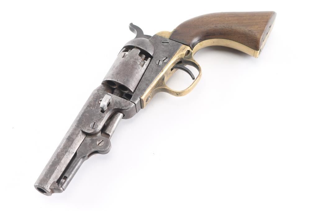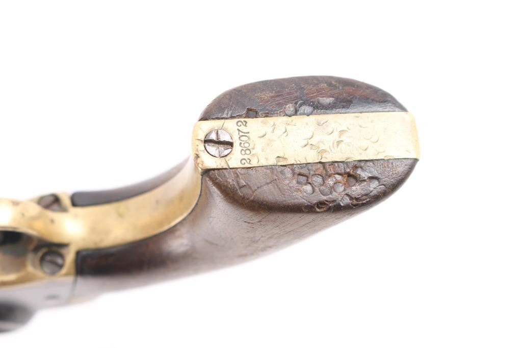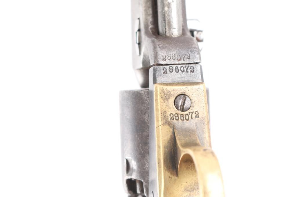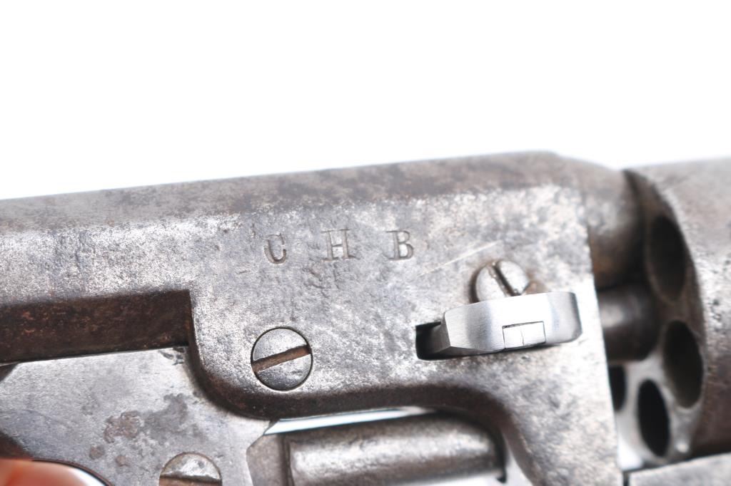 Antique single action cap-n-ball black powder percussion revolver. Manufactured circa 1866. Features an 4" octagon barrel, brass bead front sight, 'v' notch rear sight cut into the hammer lip, smooth thin trigger, knurled hammer spur, non-fluted six shot cylinder with roll stamped Stagecoach scene is not visible, loading lever, one line New York address on barrel flat, round brass trigger guard, brass backstrap, one-piece oil finished smooth walnut grip. Bore is good, fairly bright with sharp rifling, some light pitting throughout, dark grooves. Metal surfaces show mottled gray patina, over small areas of bare metal, minor loss of contours throughout. Engraved scene on cylinder is gone. Wood is good condition with slight scratches. Serial number repeated on barrel, partial on cylinder, triggerguard & back strap. Action is sound. Wedge is a newer replacement. Left side of barrel is stamped "CHB" in block letters, looks period done.