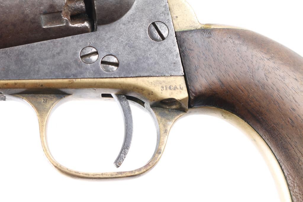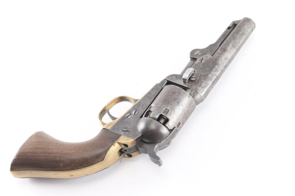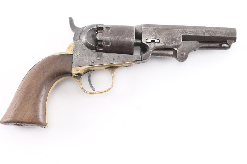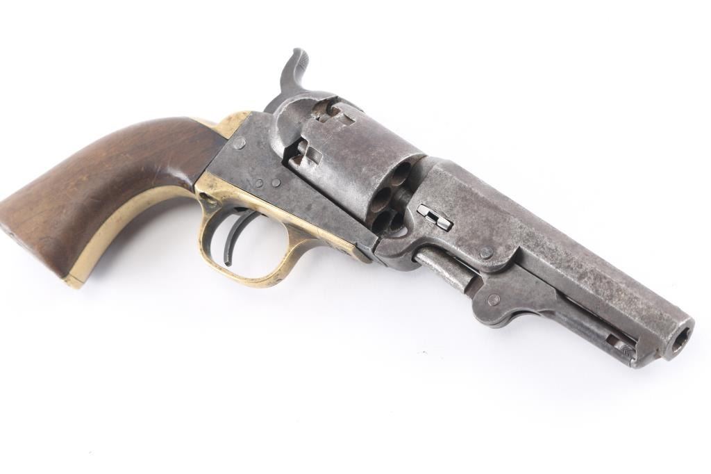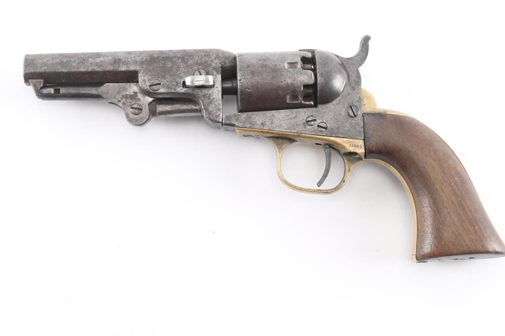 Antique single action cap-n-ball black powder percussion revolver. Manufactured circa 1866. Features an 4" octagon barrel, brass bead front sight, 'v' notch rear sight cut into the hammer lip, smooth thin trigger, knurled hammer spur, non-fluted six shot cylinder with roll stamped Stagecoach scene is not visible, loading lever, one line New York address on barrel flat, round brass trigger guard, brass backstrap, one-piece oil finished smooth walnut grip. Bore is good, fairly bright with sharp rifling, some light pitting throughout, dark grooves. Metal surfaces show mottled gray patina, over small areas of bare metal, minor loss of contours throughout. Engraved scene on cylinder is gone. Wood is good condition with slight scratches. Serial number repeated on barrel, partial on cylinder, triggerguard & back strap. Action is sound. Wedge is a newer replacement. Left side of barrel is stamped "CHB" in block letters, looks period done.