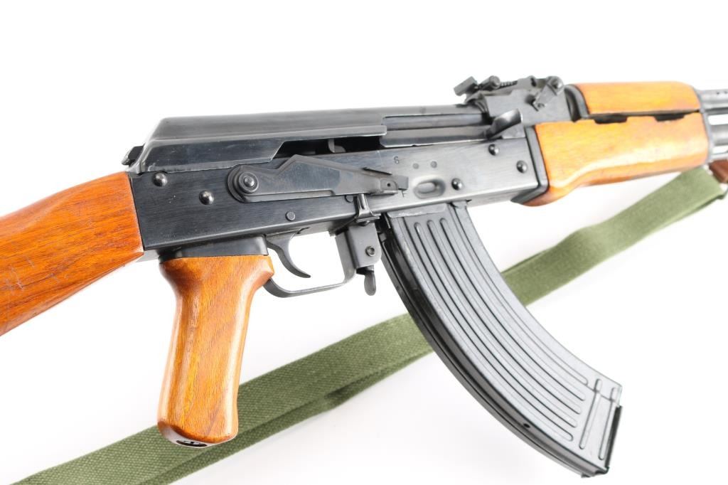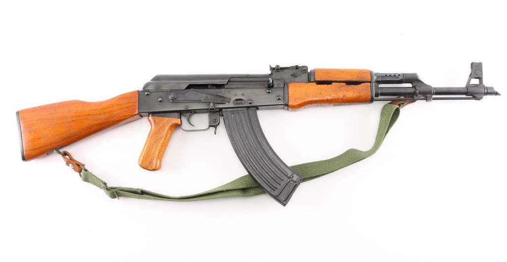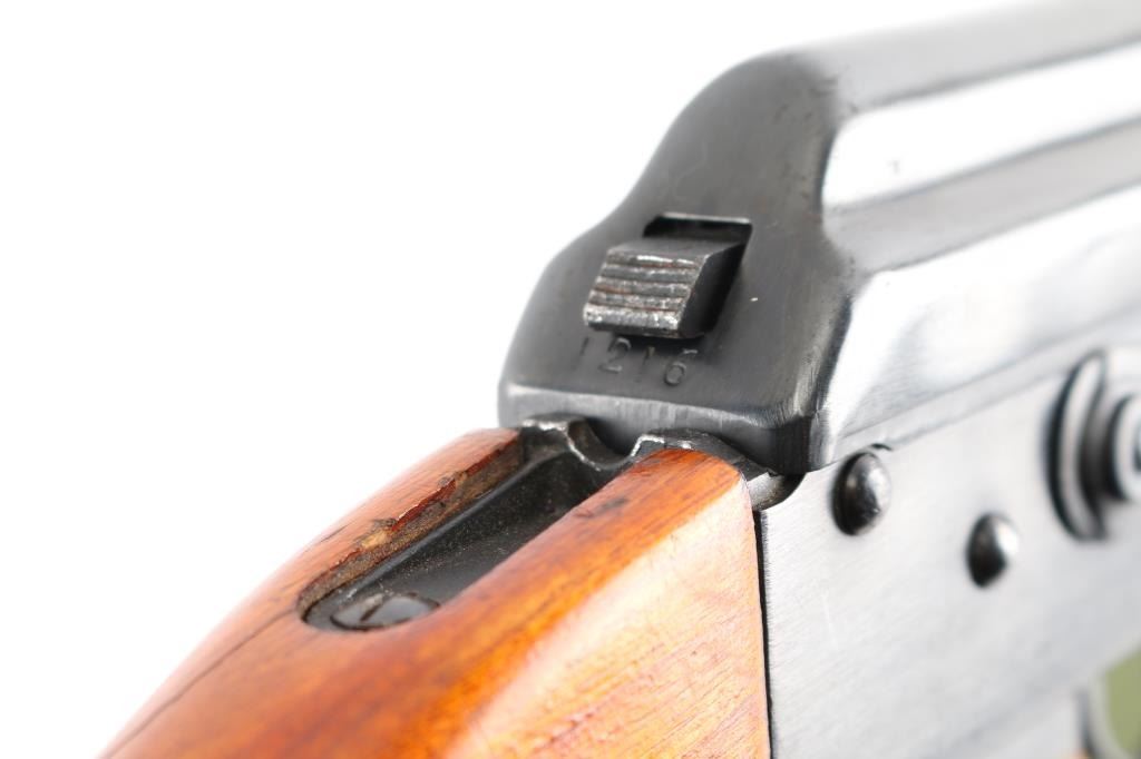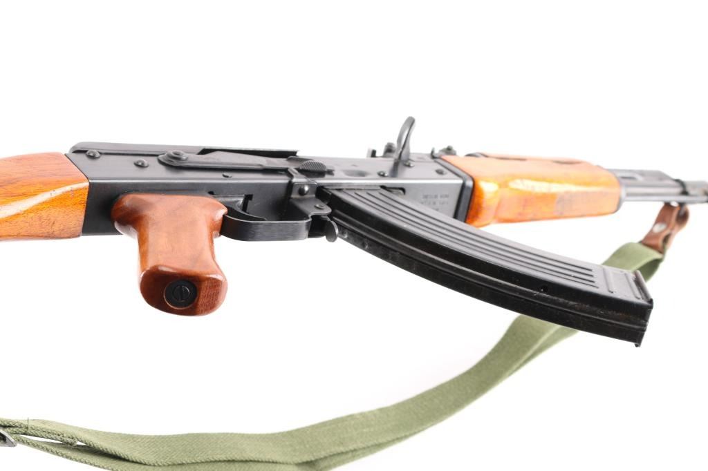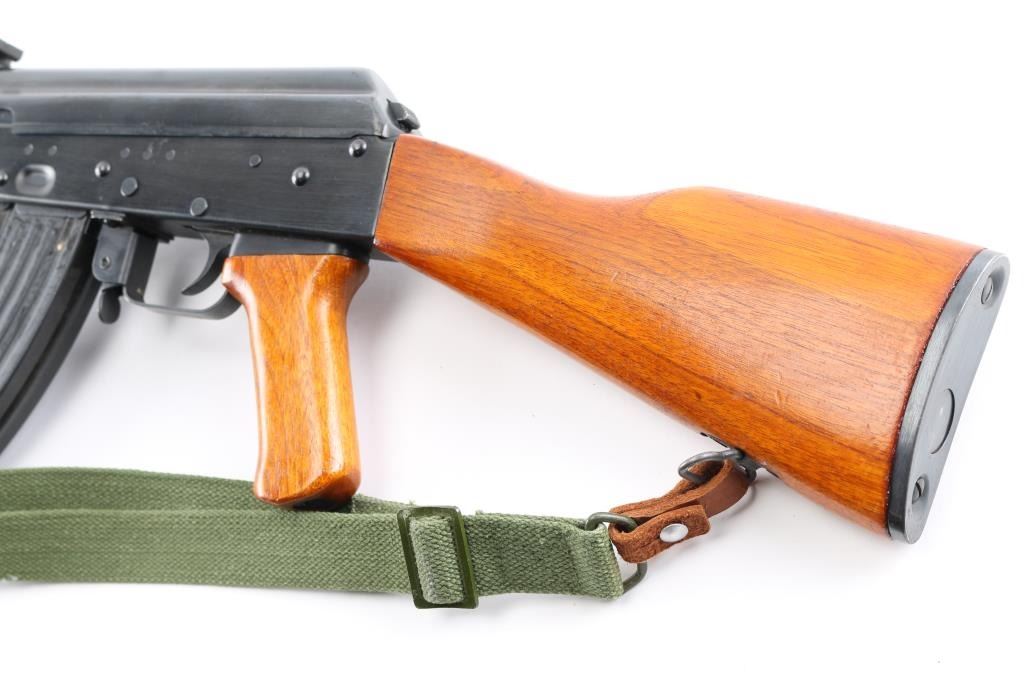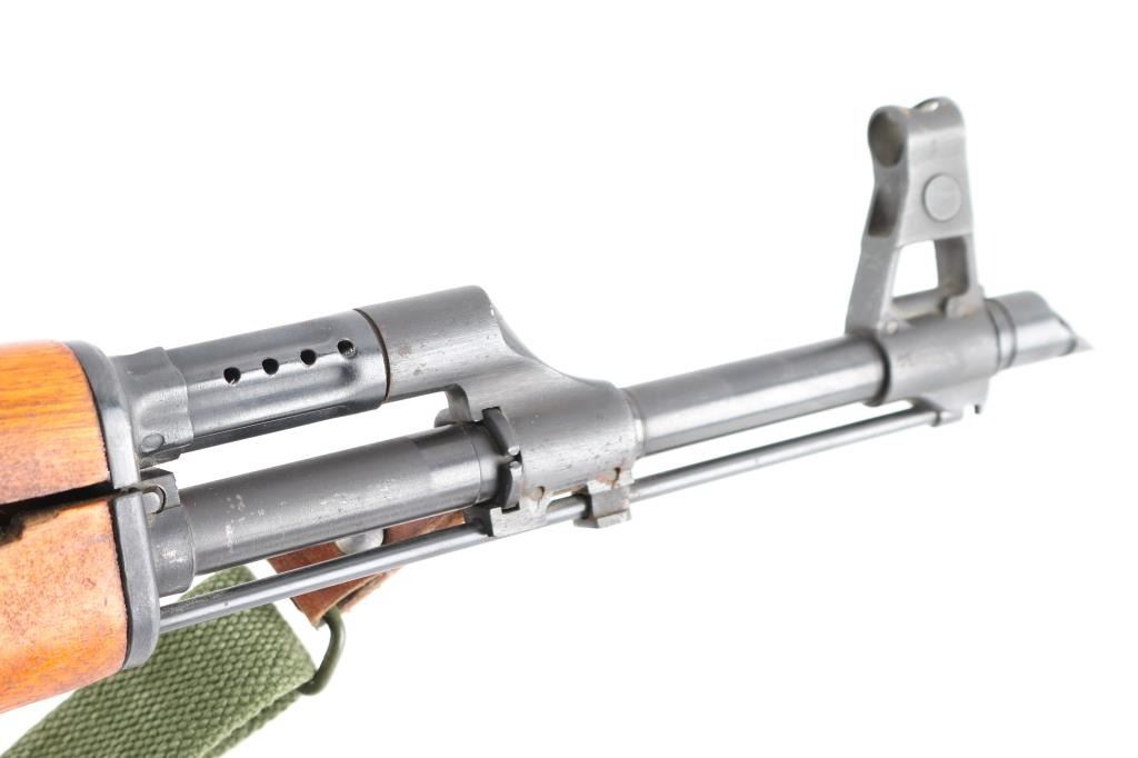 Pre-Ban Chinese semiautomatic rifle imported by Sile, NY NY. Based on AK-47/AKM type rifle. Features blued finish, smooth chu wood furniture with orange color varnish, 16" threaded barrel, slant muzzle brake, bayonet lug, cleaning rod, protected post adjustable front sight, tangent rear sight, manual safety, cleaning kit in butt trap. Bore is excellent condition, hard chrome lined. Retains 95% blue with handling marks, a few tiny spots of patina. Wood is very good condition, with scratches and dings. Observed numbers match. Includes one 30 rd magazine, green canvas web sling (Chinese, leather tabs on both ends, appears to be an SKS sling).