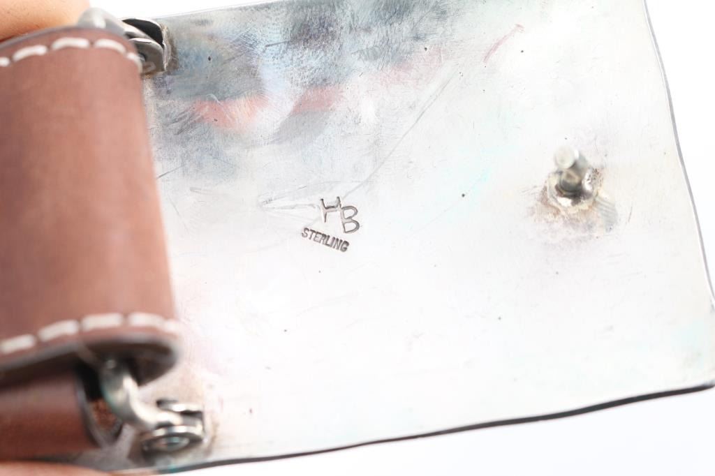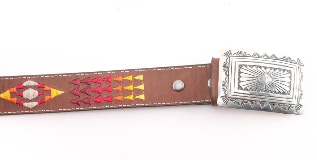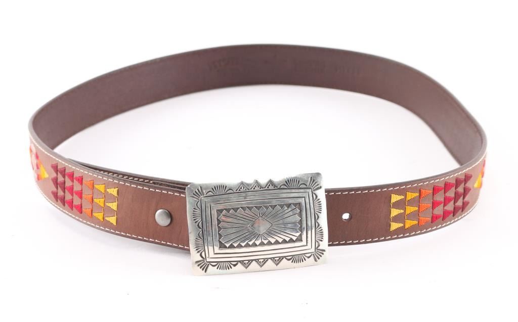 Square geometric buckle all sterling, maker marked "HB". Includes a brown leather belt embroidered with a southwest design. Measures 44" end to end.