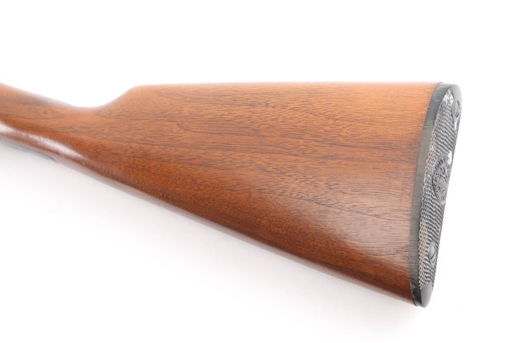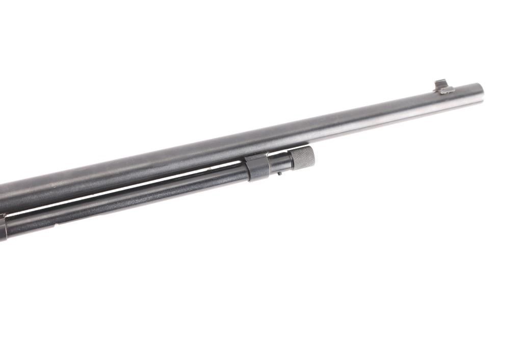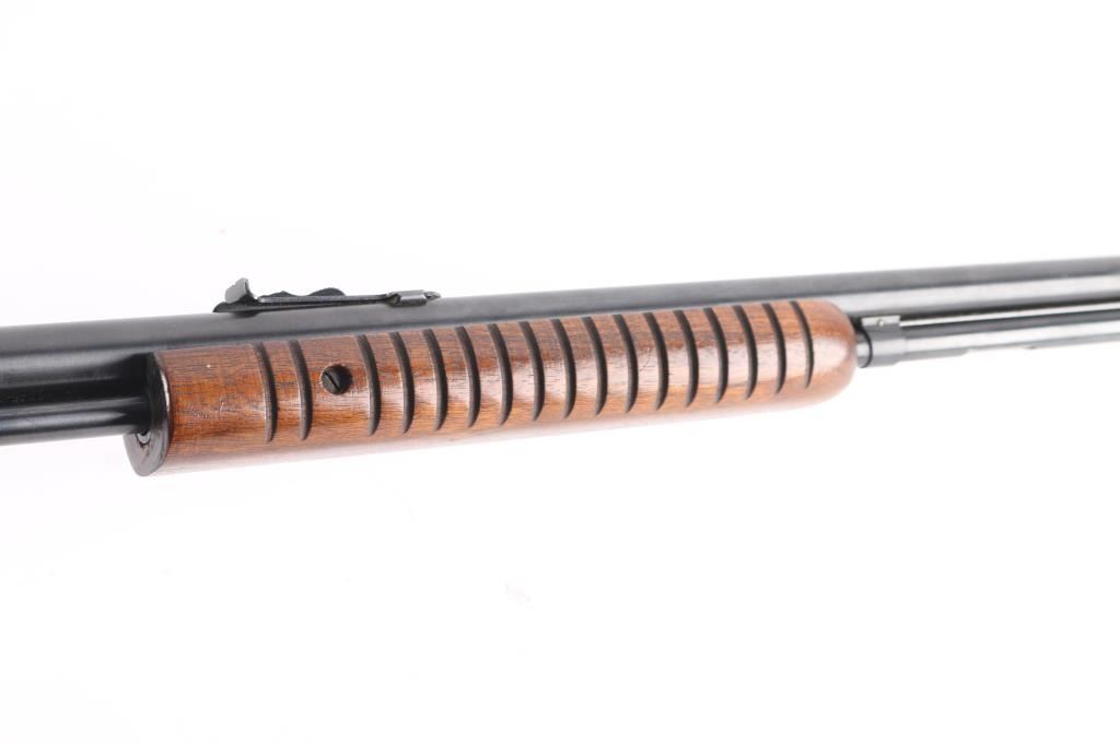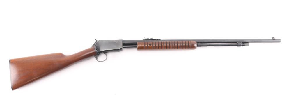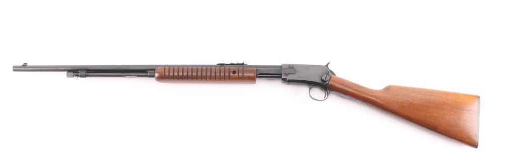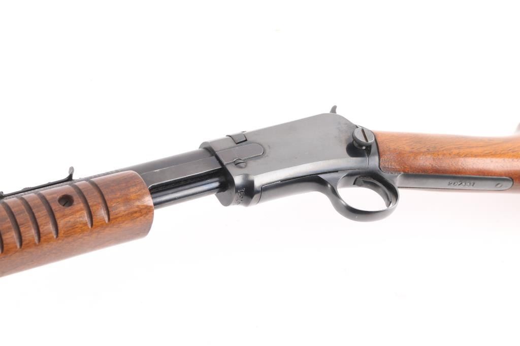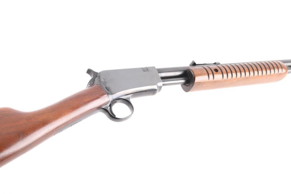 American made slide action, rimfire rifle chambered for .22 Short, Long and Long Rifle cartridges, circa 1949. It sports a 23" round barrel with 3/4 magazine tube, a blued finish, dovetailed blade/bead front sight, adjustable rear sporting sight, take-down receiver, serrated hammer spur, serrated trigger, grooved walnut slide handle and smooth straight grip shoulder stock with factory hard rubber buttplate. Bore is excellent/bright, original blue finish is about 98% with some very minor scratches, and a couple of rubs on top of the receiver, wood is excellent, action is crisp/smooth Rarely found in this condition. Matching serial number on receiver, & lower tang.