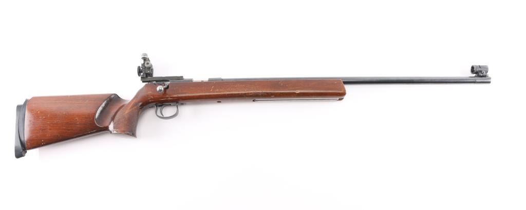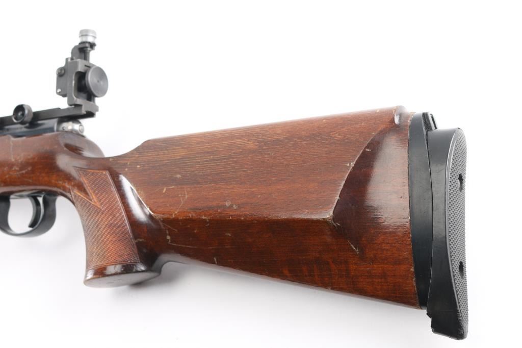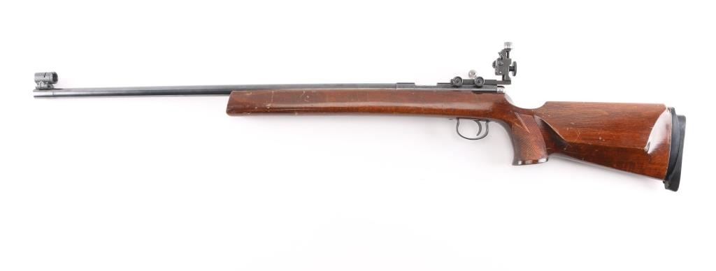 SN: 500679 High quality bolt action single shot match rifle chambered in .22 Long Rifle, manufactured in West Germany circa 1964. Features a blued finish, 26" tapered heavy barrel with recessed crown, hooded globe front sight, receiver mounted adjustable peep rear sight, adjustable serrated trigger, manual safety on right rear of receiver, right-handed pistol grip beechwood target stock with “T” slot accessory rail on the underside of the forend, stippled grip texture, cheek rest, high comb, adjustable sliding buttplate. Rifle retains approximately 85% of its original blued finish showing thinning, edge wear. Stock is good to very good with handling marks & scratches.