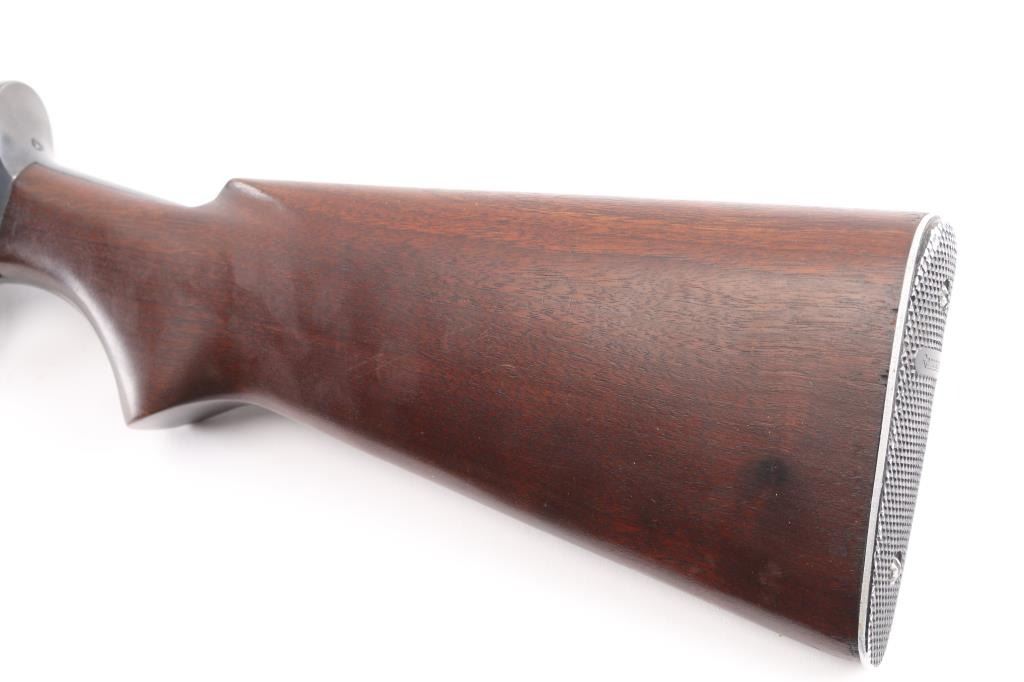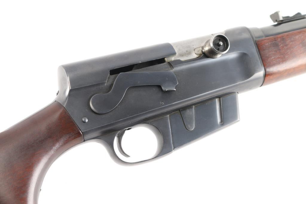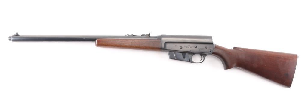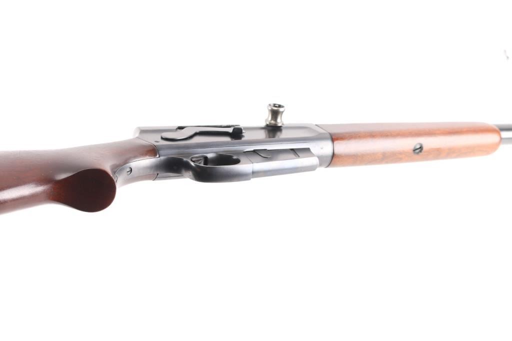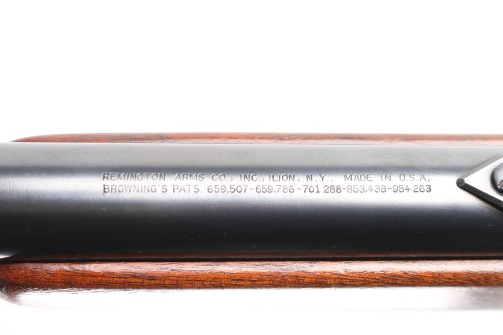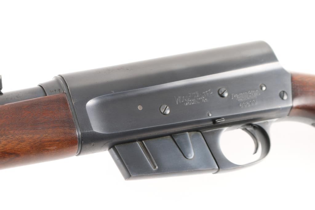 'The Woodsmaster' Vintage semiautomatic rifle with 1948 barrel date. Features blued finish, smooth walnut forend & semi pistol grip stock, checkered metal factory buttplate, 22.5" barrel, blade front sight with bead, sporting rear sight. Bore is excellent/bright. Retains 98% original blued finish, with very minor edge losses & scratches. Bolt assembly is in the white, very good bright condition. Wood is excellent. .Markings are sharp and even, except the "Woodmaster" is a little feint. Comes with a shirk wrapped 20 round box of vintage Remington Kleanbore .330 savage express cartridges. and a Winchester .300 Savage box containing 11 rounds. Don't see many in this condition.