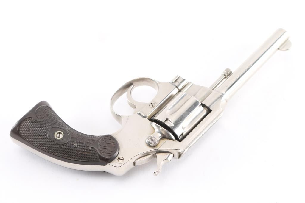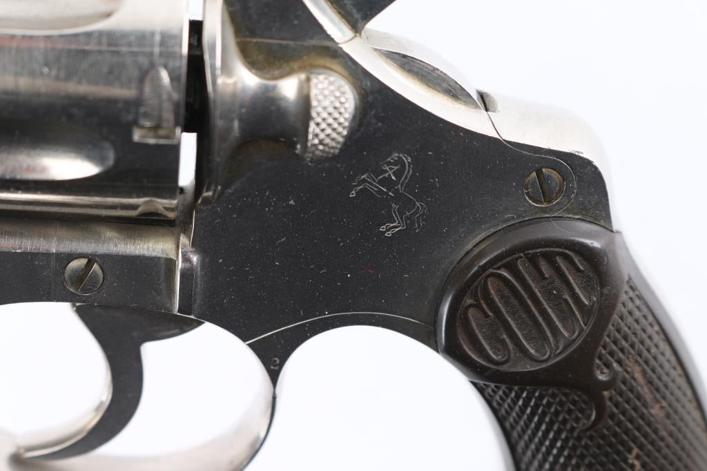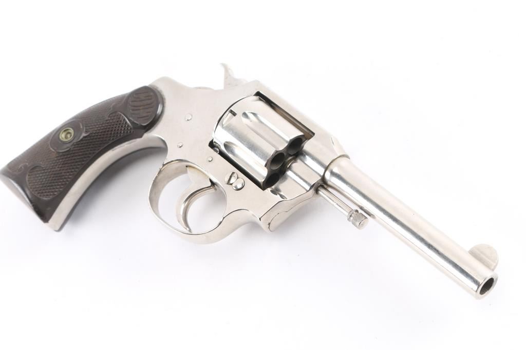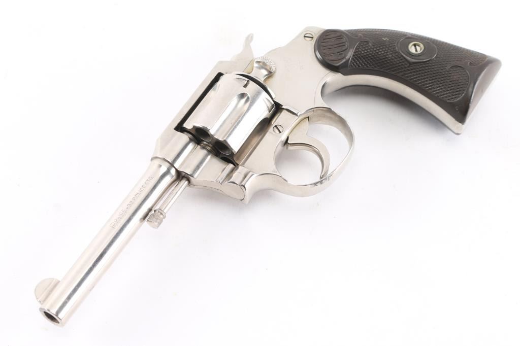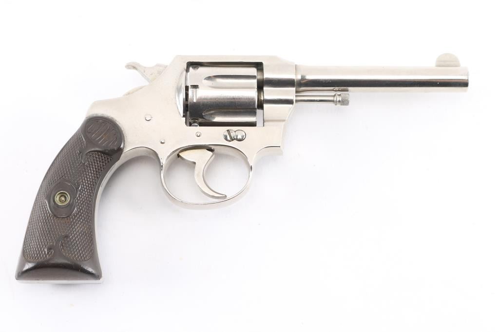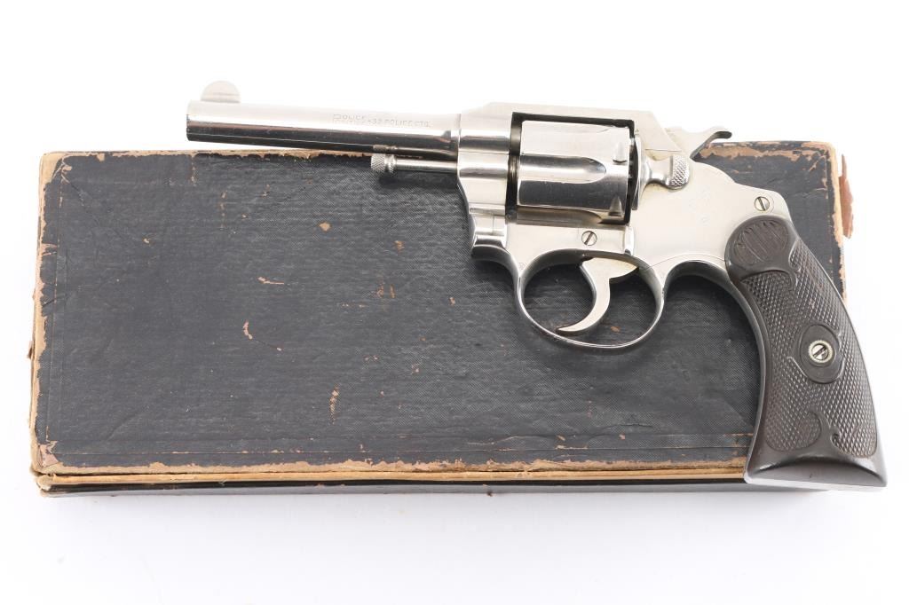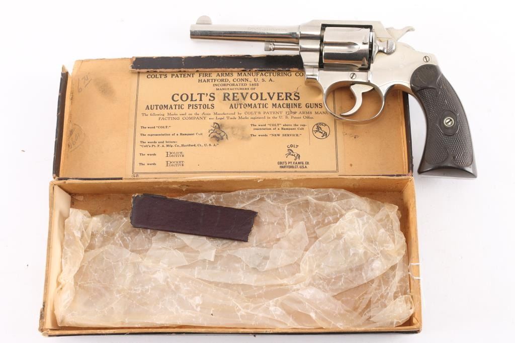SN: 164257. Vintage double action six-shot revolver chambered in .32 Police, manufactured circa 1935. Features nickel finish, checkered hard rubber grips with "Colt" motifs, fixed sights, 4" barrel, 6 shot swing-out cylinder, checkered hammer spur, smooth trigger, fires in double or single action mode. Bore is in excellent, bright with strong rifling. Charge holes are in excellent condition; need cleaning. Retains 98% coverage of original bright nickel, with some minor bubbling on the right frame. All markings are crisp. Grips are in very good condition, no visible shrinkage. Action is smooth and lock-up is tight. Matching serial number on frame, and crane. Comes in original blue cardboard factory box with matching Police positive labels on the inside, and outside. Edges are scuffed, 2" piece missing from the front lid, some separations, otherwise complete,