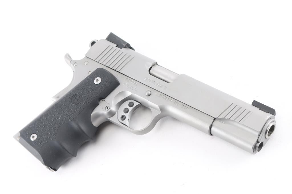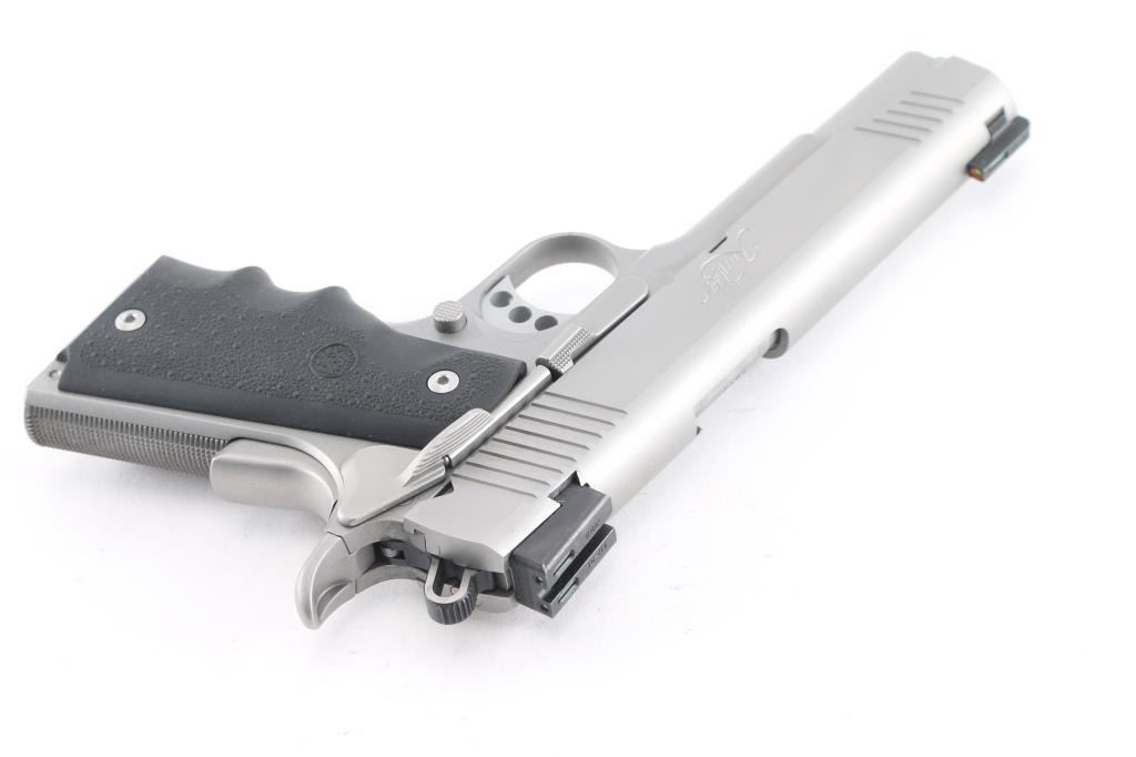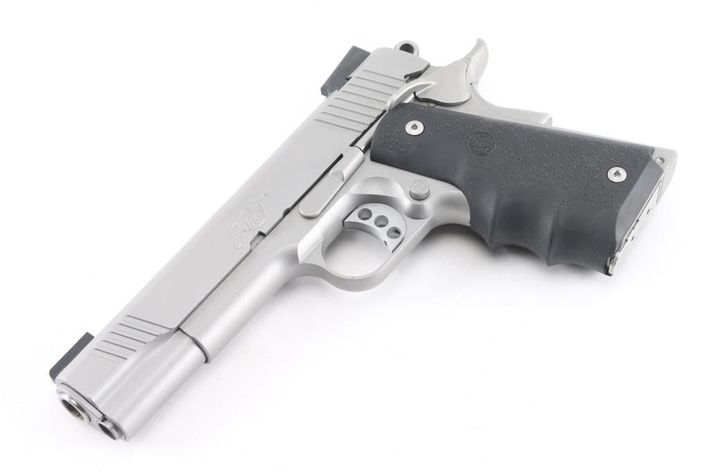 High quality stainless steel 1911 style single action semi-automatic pistol chambered in 10mm. Features a satin finish, 5" match grade barrel, Truglo 3-Dot Tritium Night Sights, Dual Illuminated Orange Front Sight Equipped with Tritium/Photoluminescent Glow Dot, dual cocking serrations on the slide, full-length steel guide rod, match grade skeletonized aluminum trigger and skeletonized hammer, thumb safety, upswept grip safety, push button magazine release, three (3) factory 7 round magazines, Four total. (One Mag has tag that reads "Function Issue") beveled magazine well, knurled flat mainspring housing and two-piece checkered Hogue black rubber grips. Includes the original factory hard case with documents, lock, take-down tool and 3 spare magazines. Pistol exhibits very light wear. Action is strong, bore is excellent/bright, and the rubber grips are fine. Condition is NRA Excellent. Modern Firearm.