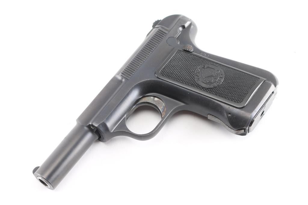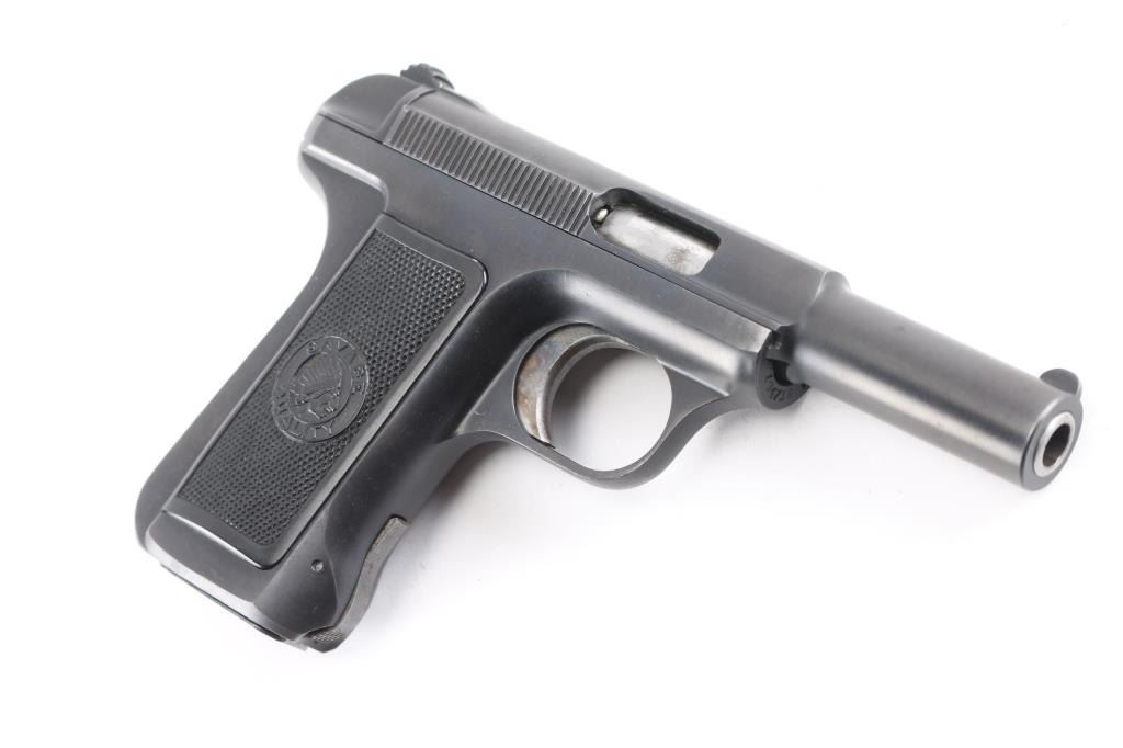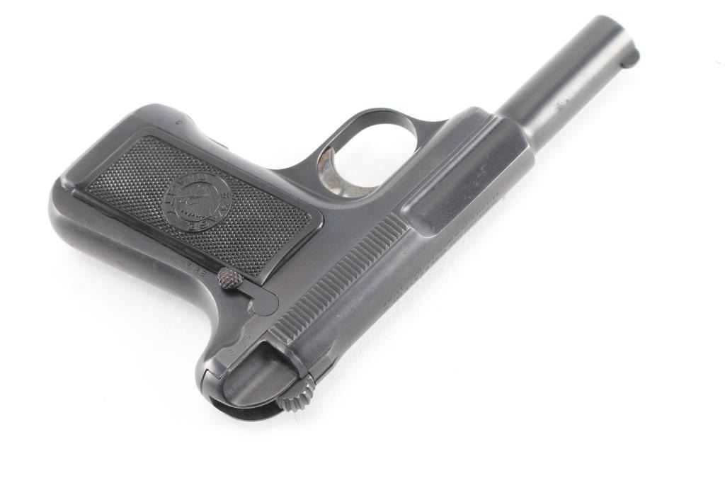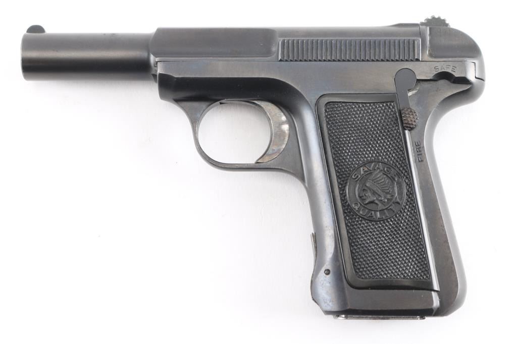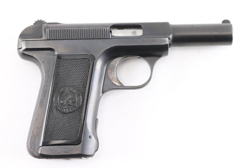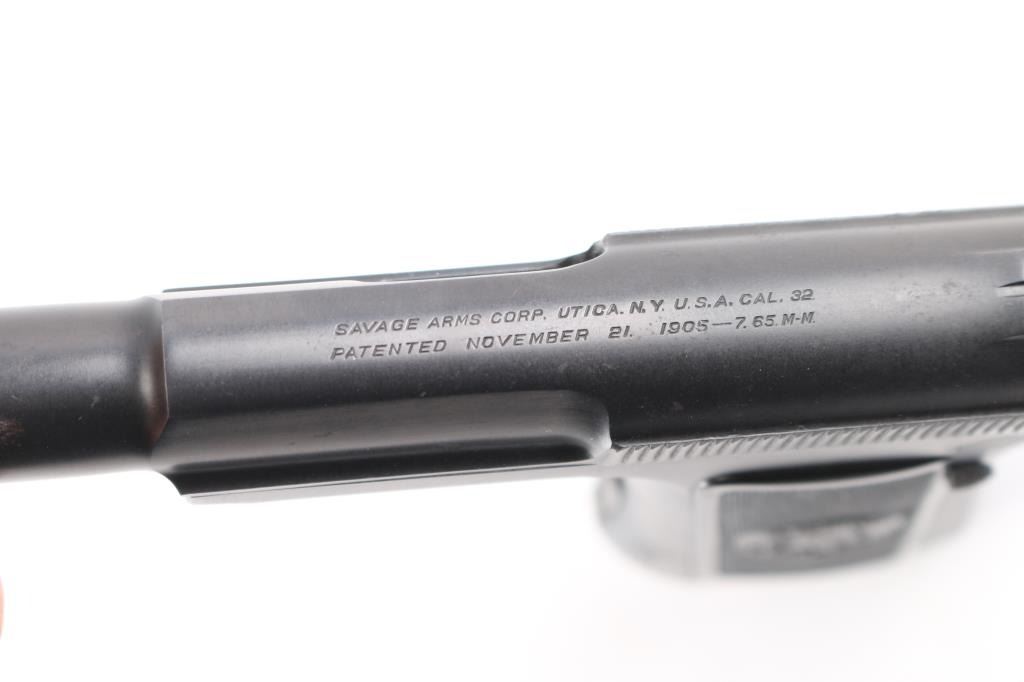 Vintage American made striker fired semi-automatic compact pistol manufactured circa 1919. Features a blued finish, 4" barrel, fixed blade front sight, fixed rear sight, smooth case colored trigger, serrated cocking lever, manual safety/slide catch on the left side of the frame, toe magazine release, 10 round magazine, steel frame and two-piece fancy checkered black synthetic grips with Savage insignias. Bore is excellent/bright. Retains 99% original blue, with some very minor spots of on the slide, & backstrap, case colored trigger is very good, action is smooth, and the grips are fine. Not to many out there in this condition.