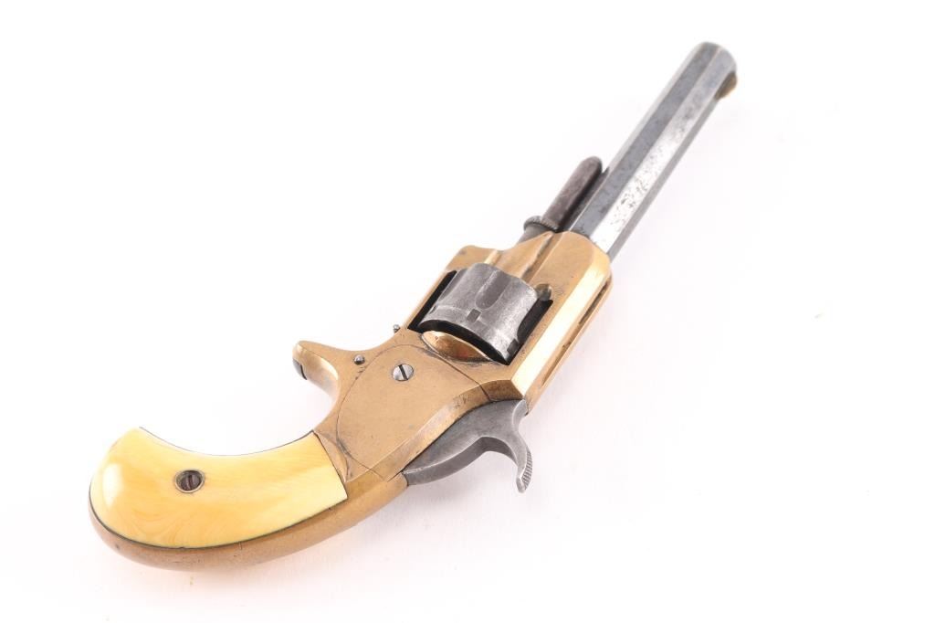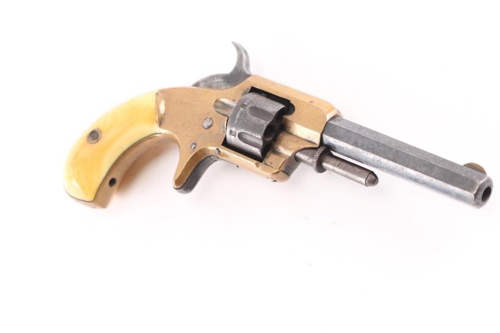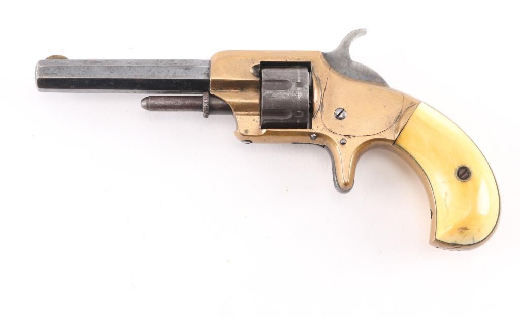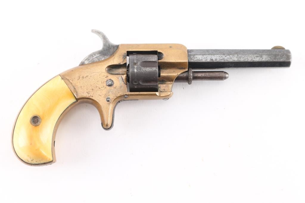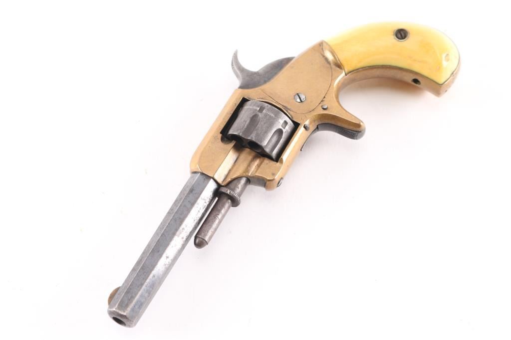 SN: 4187. Single-Shot. 7-rd Capacity. Produced 1871-79 " 3500 made. Pocket spur trigger Pistol". 3 1/8" barrel with blade/notch sights. Serial number on heel. Brass frame. Ivory grips. Stamped "Whitneyville Armory, Ct. U.S.A." on octagon barrel. Bore appears good, strong rifling, some scattered light pitting. Blued barrel, cylinder/pin, hammer, and trigger have have dulled somewhat but mostly all there. Ivory grips are very good with a nice yellow patina, brass frame has some minor scratches/dings.