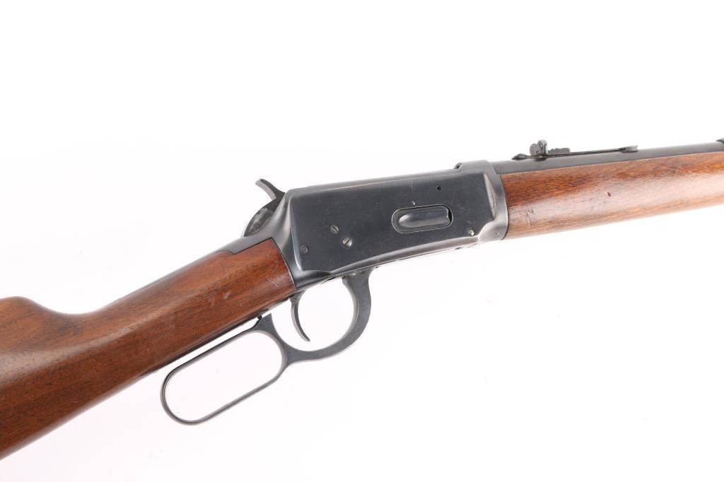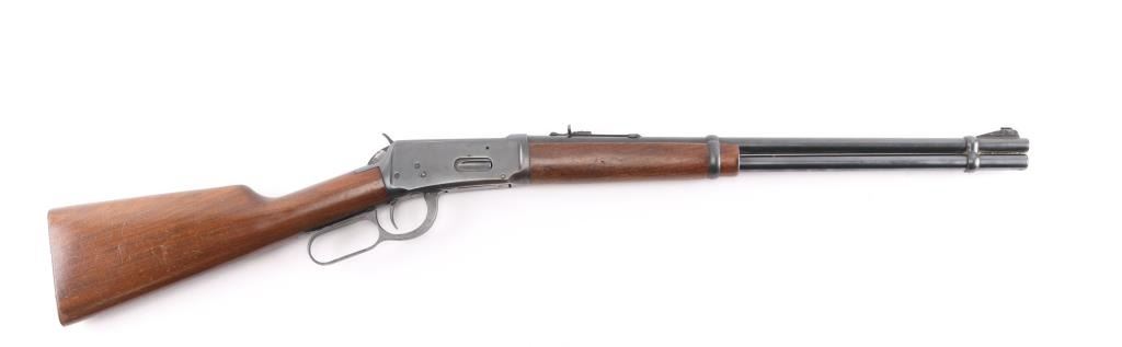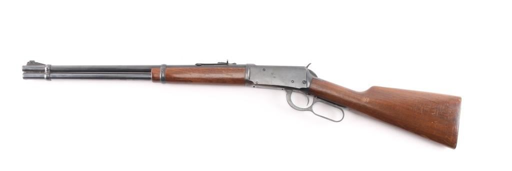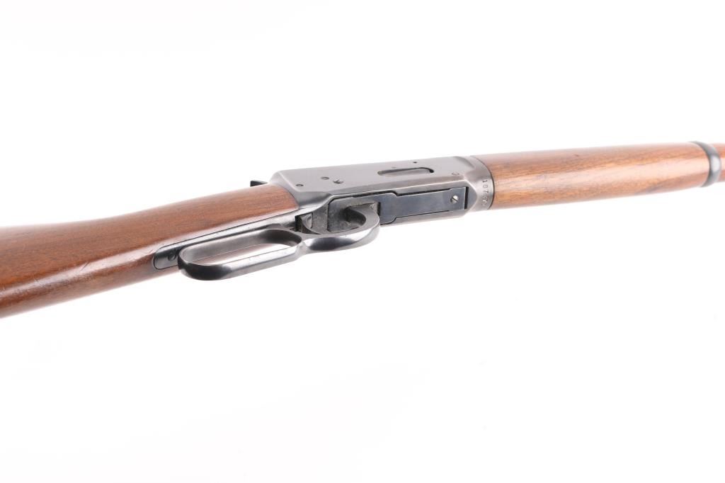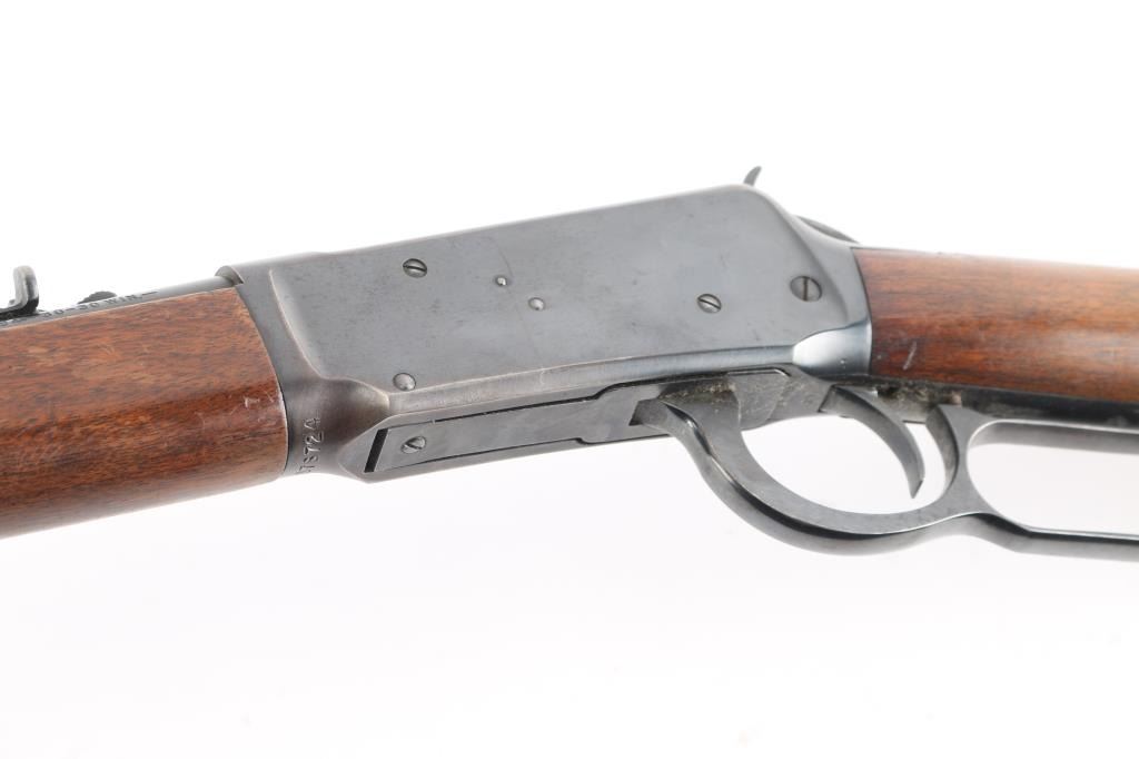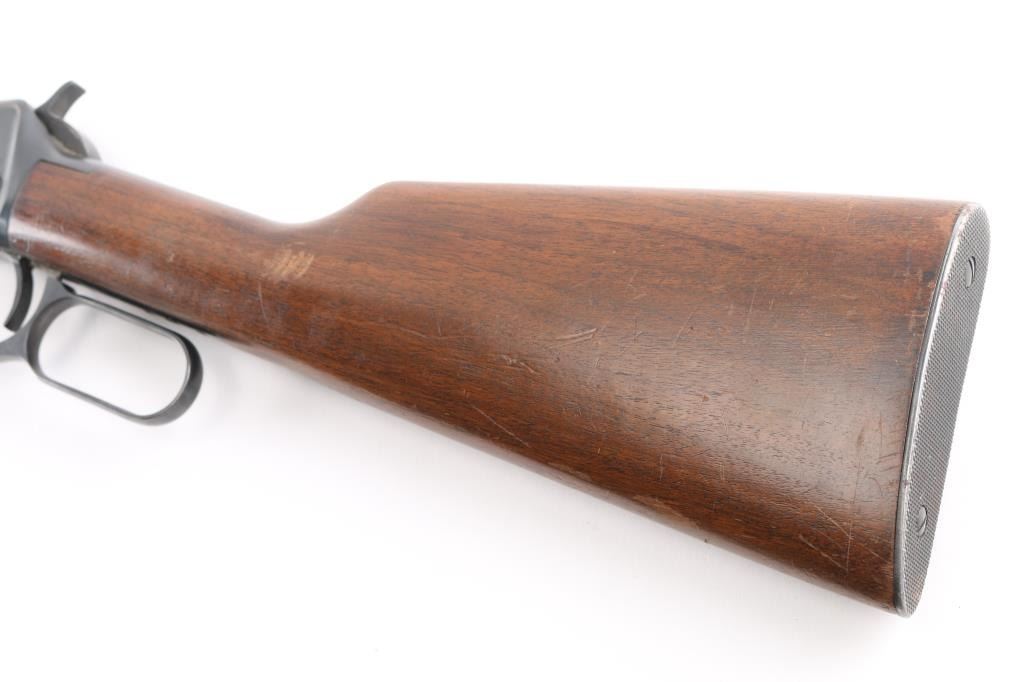 'Pre 64 Eastern Carbine' Vintage lever action rifle manufactured circa 1951. Features 20" barrel, full length magazine tube , dove tailed blade front sight, semi-buckhorn rear sight, smooth walnut forend & straight wristed buttstock, band at forend, knurled steel buttplate. Bore is excellent/bright. Metal surfaces retain 95% finish, edge wear, minor scratches. Action is crisp smooth. Markings are very good, readable. Wood is good /sound with many minor scratches, a couple of small gouges below the left wrist.