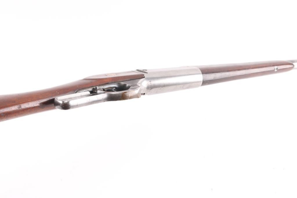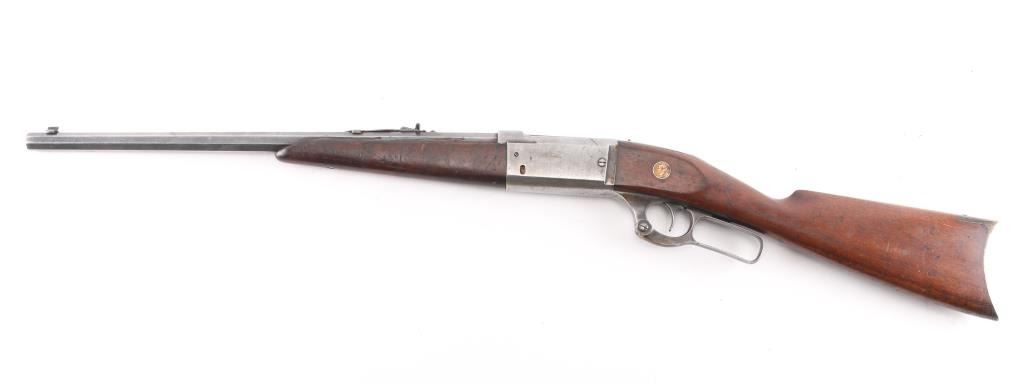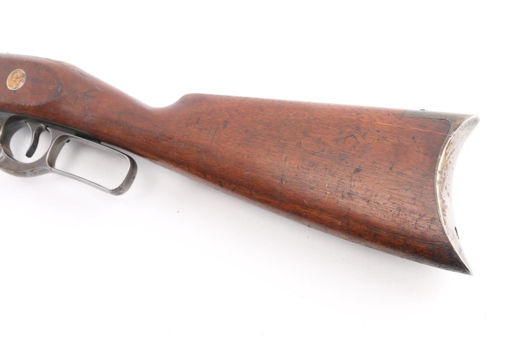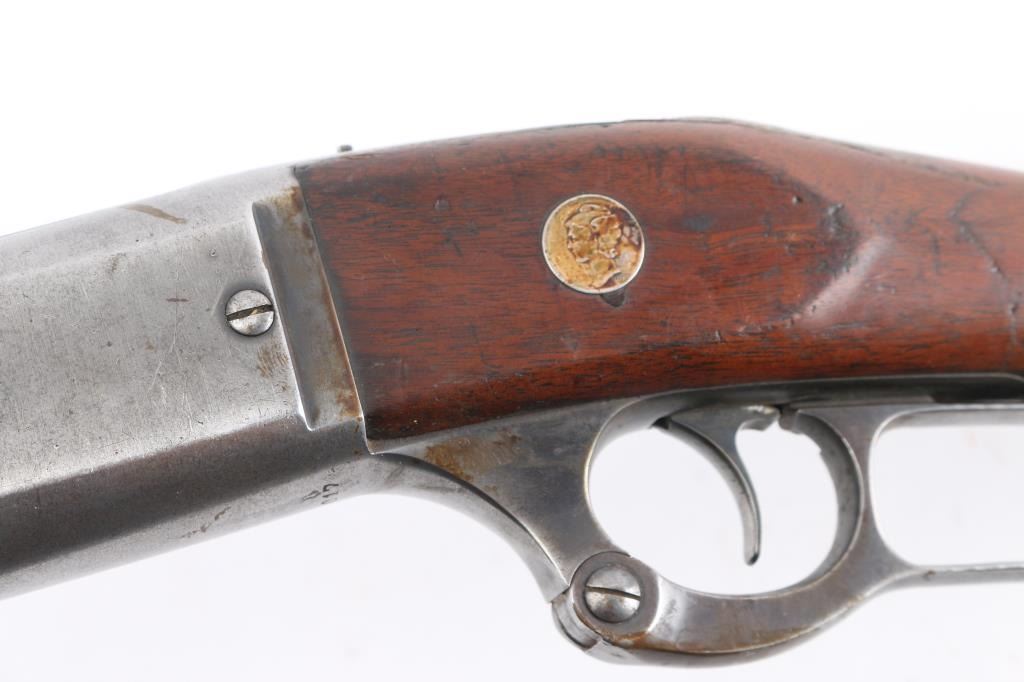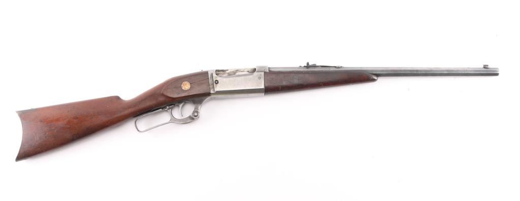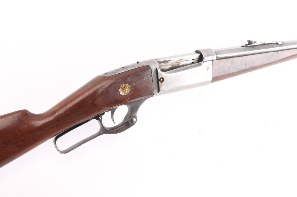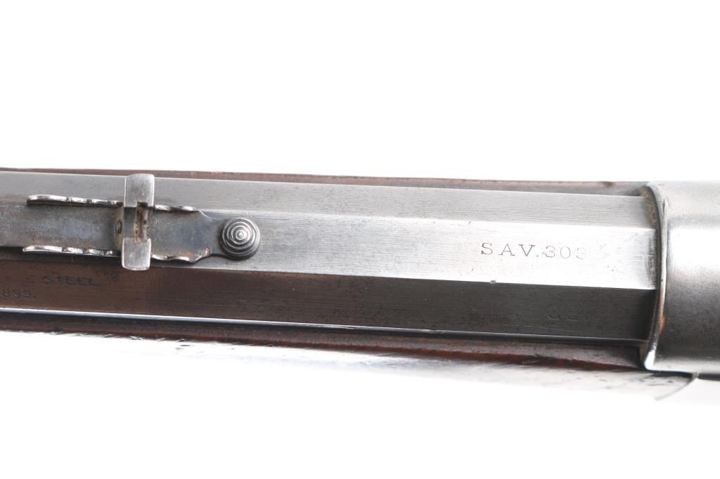 Vintage lever action repeating rifle chambered in .303 Savage caliber, manufactured circa 1910. Features a blued finish, approx 20" octagon barrel, beaded blade front sight in dovetail, King's sporting rear sight, internal rotary magazine with brass spool/round counter, cocked indicator on the upper tang, smooth trigger, straight finger lever, sliding safety (and lever lock) on the lower tang, smooth walnut forend and straight wrist shoulder stock with steel crescent buttplate. Bore is good condition, frosted, a bit dark, steady strong rifling. Retains under 10% finish, now mostly smooth bare metal, some patina and small areas of shallow pitting. Lever (probably case colored originally) shows some mottled gray colors. Wood is fair to good with repaired break at wrist, many scrapes and scratches. Two "Mercury" dimes inlet into sides of wrist. Missing small nut for the cross screw from the right side of receiver.