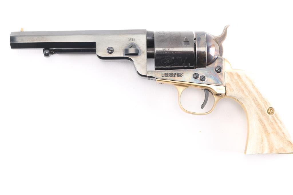 Sn: X26432. Sn:, Italian made reproduction of the Colt 1851 Navy percussion revolver, 1871 Richards Mason conversion that was converted to fire .38 Special, removing the loading lever, and adding a ejector rod.. manufactured in Italy circa 2012. Imported by Stoeger. Features a blued & case hardened finish, 5 1/2" octagonal barrel, conical brass post front sight, dovetailed v-notch rear in hammer, smooth thin trigger, knurled hammer spur, non- fluted 6 shot conversion cylinder, brass grip frame and faux stag grips. Naval battle scene on cylinder, "1871" stamped on left barrel. Revolver is in like new condition, appears unfired. Bore is excellent/bright, finishes, and wood are excellent. Comes in Uberti box with matching label, contains lock, manual. Matching serial Numbers.
