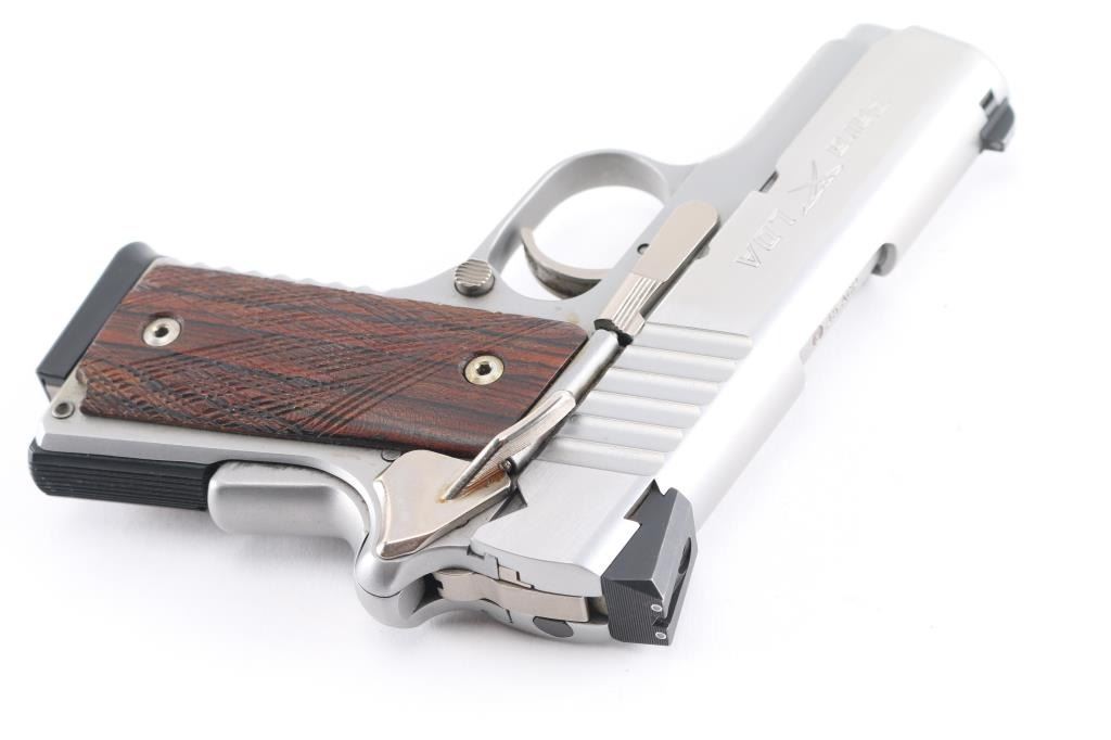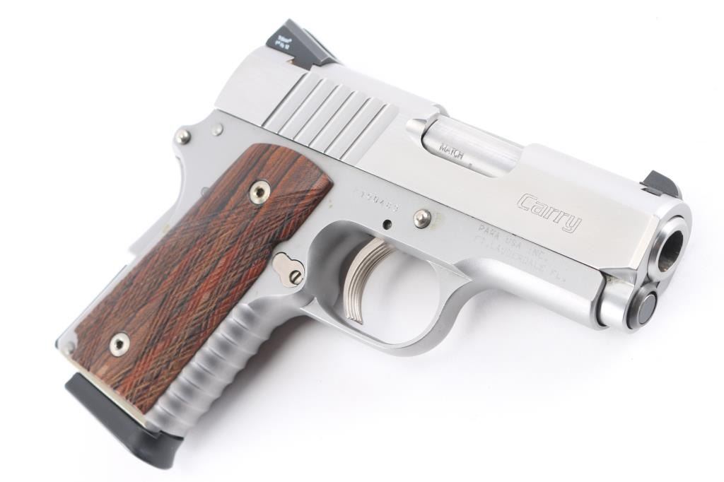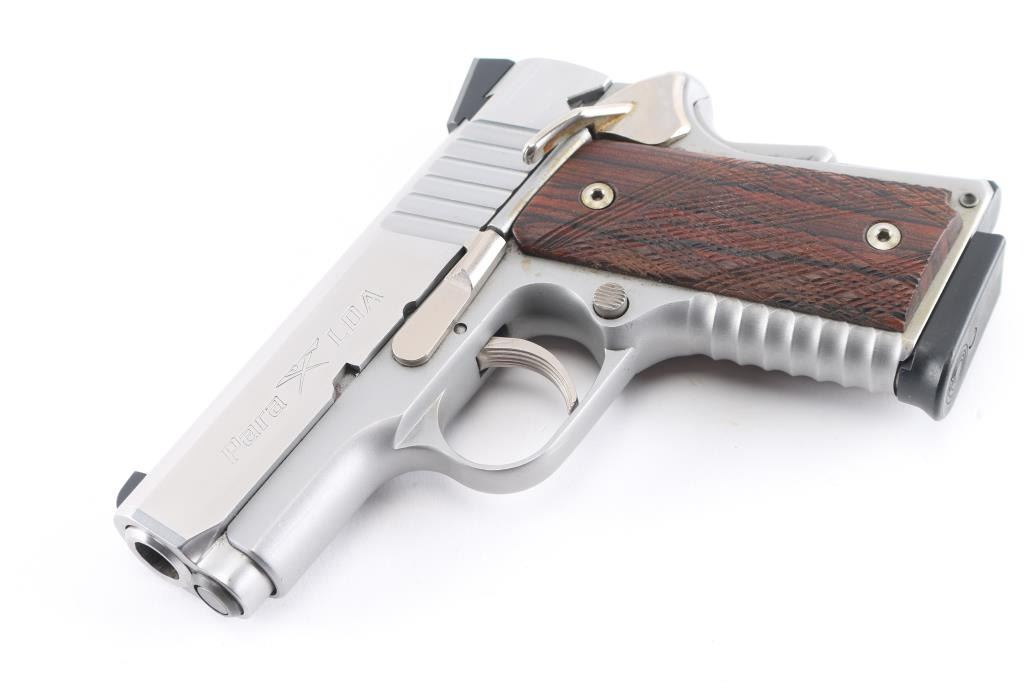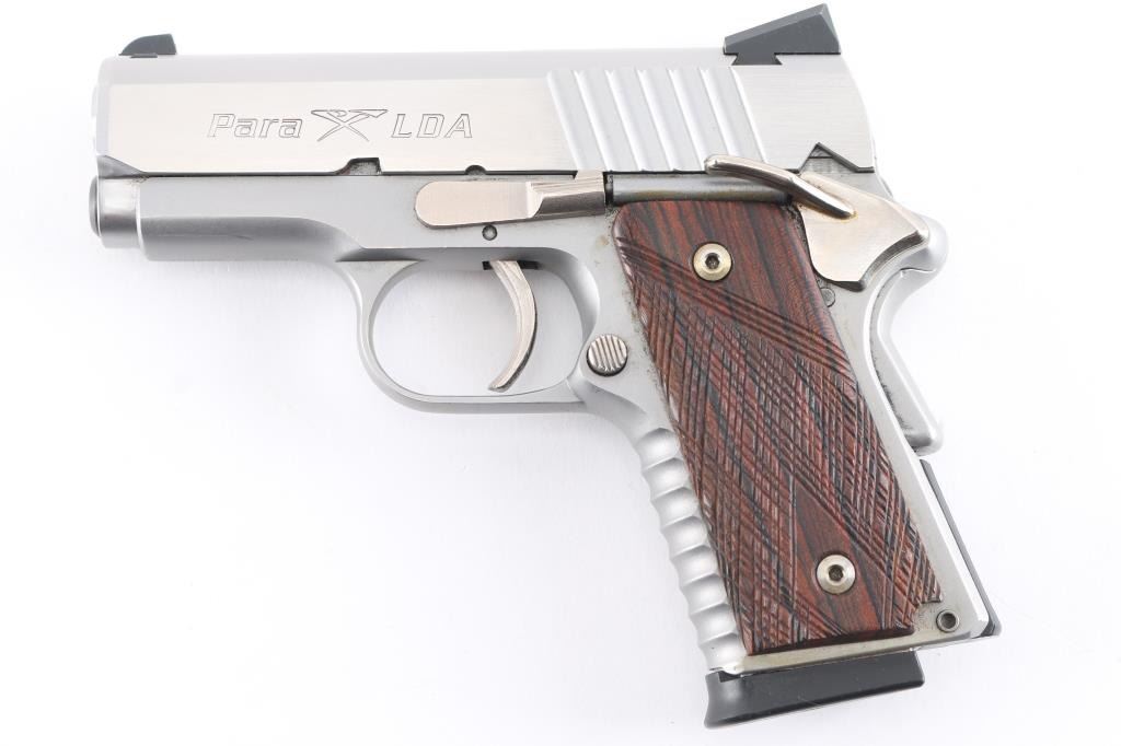 Canadian made semiauto pistol imported by Para USA Inc of Ft Lauderdale FL. Features slim frame with single stack magazines, matte stainless steel frame,aftermarket wood checkered grips with original grips in hard case. 3" barrel, manual safety and grip safety, polished and matte stainless slide with night sights. Operates using the Para-Ord LDA (light double action) trigger which provides a light and smooth trigger operation, no restrike capability. Bore is excellent. Retains 95% finish and shows very minor handling. Includes factory plastic box, manual, (2) magazines.