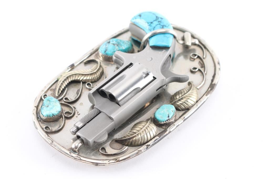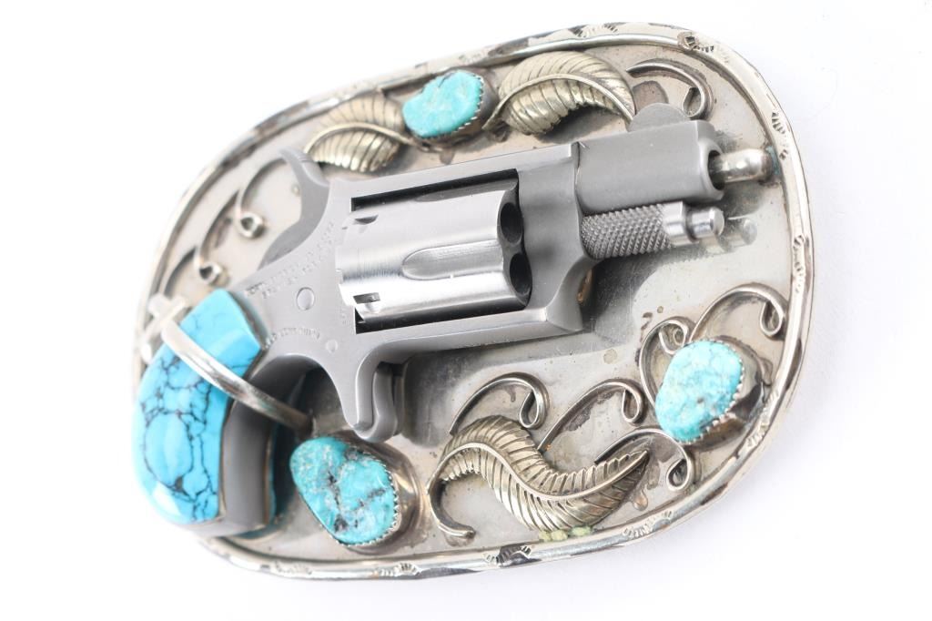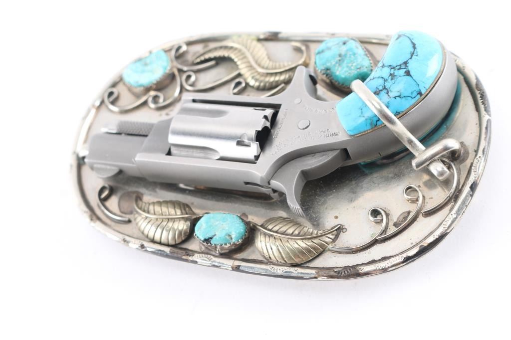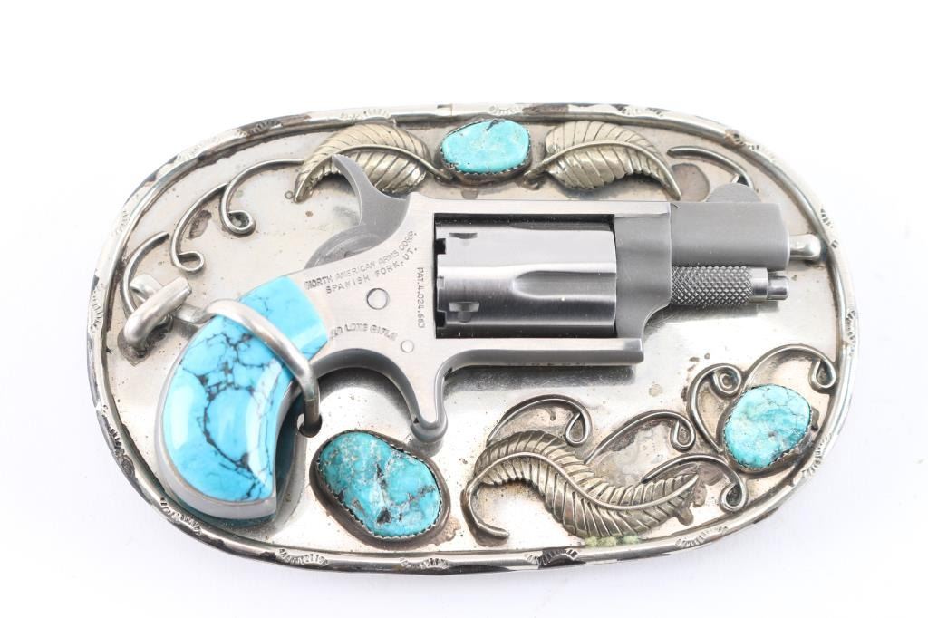 North American Arms revolver chambered in .22 long rifle with accompanied sterling silver and turquoise belt buckle. The revolver features a 1 1/8" long barrel, five shot cylinder, spur trigger, turquoise grips that fits into the belt buckle. The revolver is marked across the right side of the frame reading "NORTH AMERICAN ARMS CORP. SPANISH FORK, UT .22 LONG RIFLE" along with the patent date. The revolver shows wonderful mechanical condition with well timed cylinder rotation and crisp trigger. The piece comes with a sterling silver and turquoise belt buckle showing sterling silver leaf and vine accents and tooling across the edge. The buckle shows three pieces of faux turquoise set along the face. The buckle features indents and barrel brace to seat the pistol in the buckle along with a lever lock for the pistol. The piece shows good condition overall. Comes with soft case and holster.