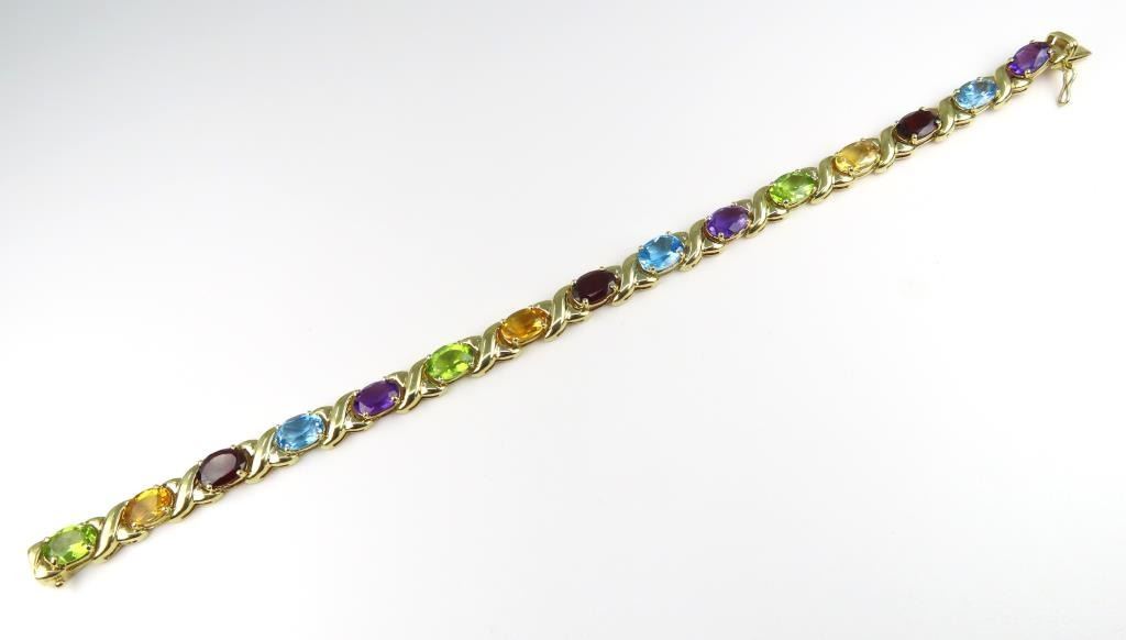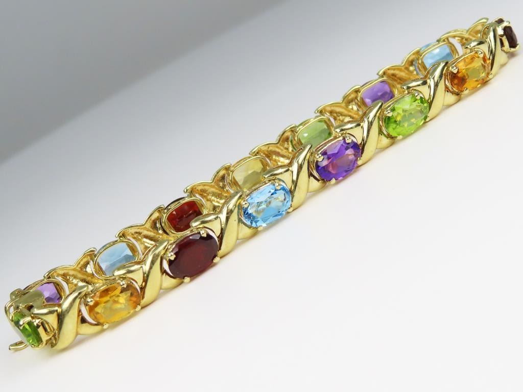 featuring 15 oval cut gems Blue Topaz, Amethyst, Peridot and Citrines weighing approx. 15.00 carats total creating a full color spectrum, set a criss-cross design setting crafted in heavy 14 karat yellow gold.
