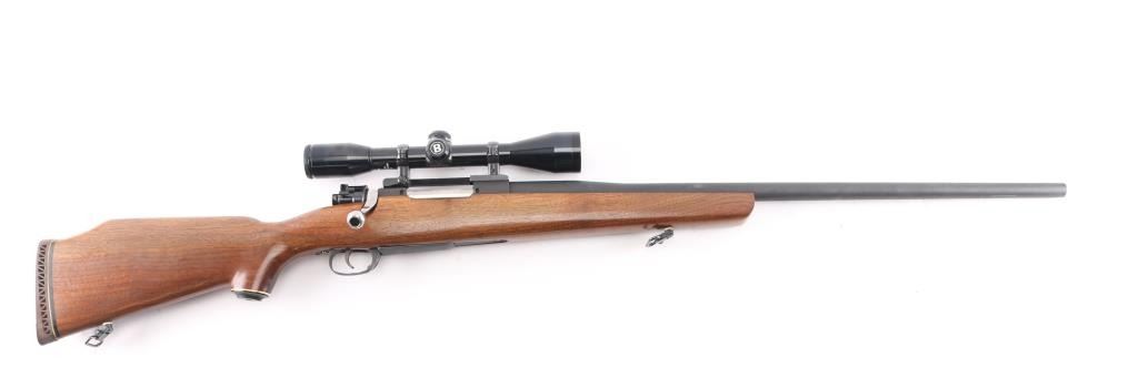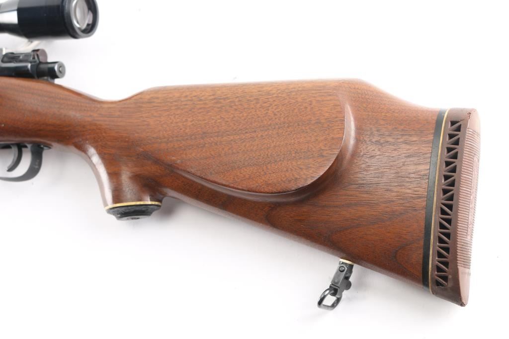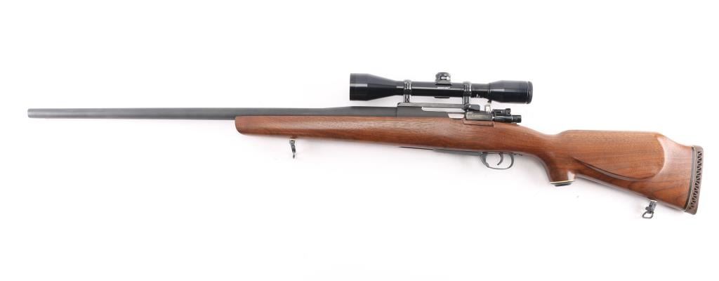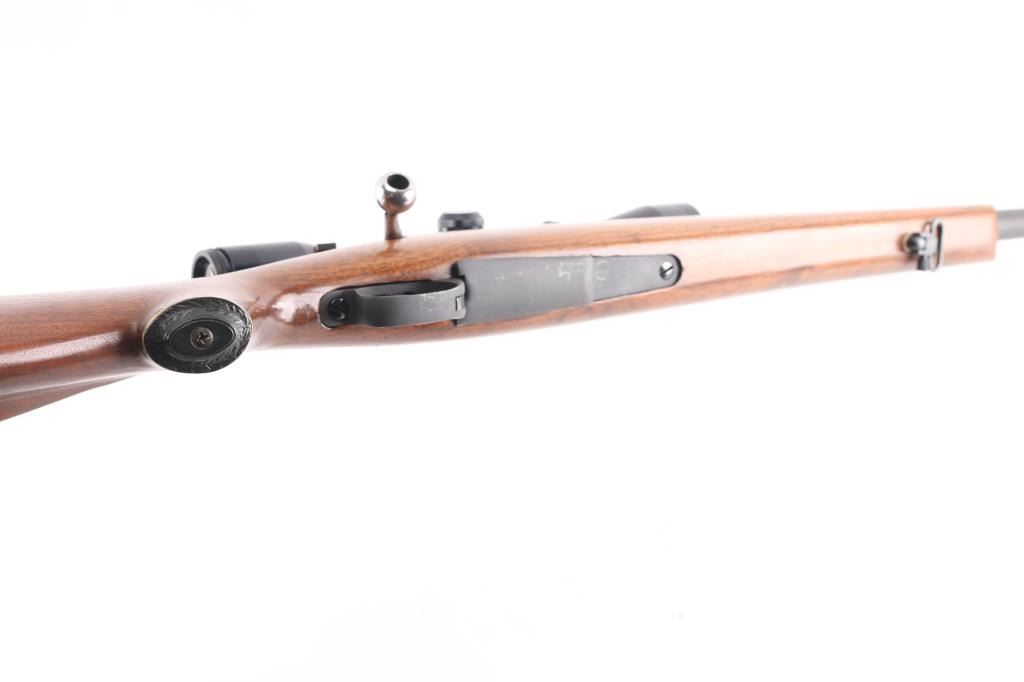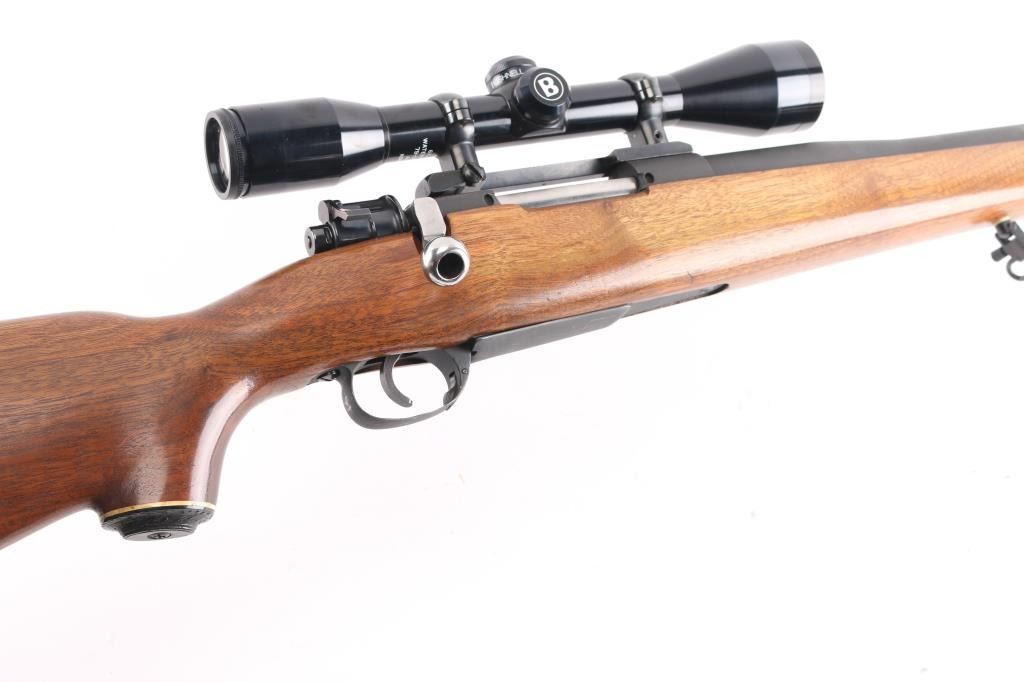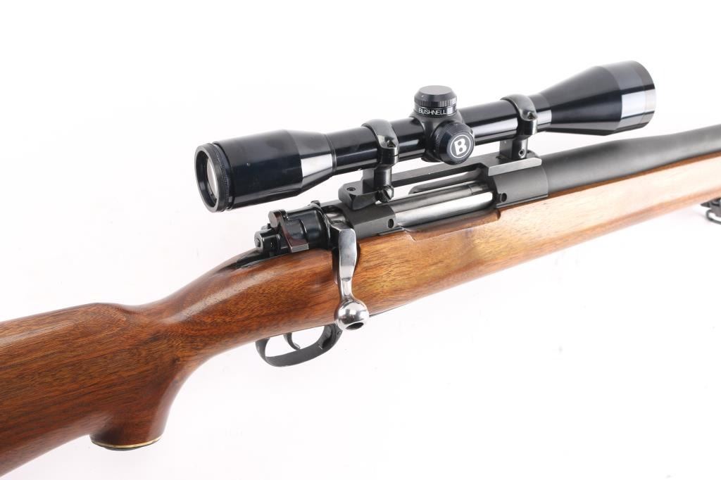 NVSN Customized sporter rifle built on a Japanese made Mauser pattern rifle. No barrel markings. Features a custom 26" heavy barrel, matte blued or parkerized finish. floorplate release button in trigger guard, two position low-swing aftermarket safety on bolt, Korean made Redfield base mounting a Bushnell Sportview 6x40mm scope with duplex reticle. Custom smooth walnut sporter stock features sling studs (with detachable swivels), right hand cheekpiece, ventilated rubber recoil pad. Bore is pristine. Retains 95% finish with handling marks. Wood is very good.