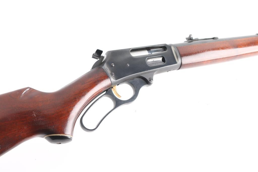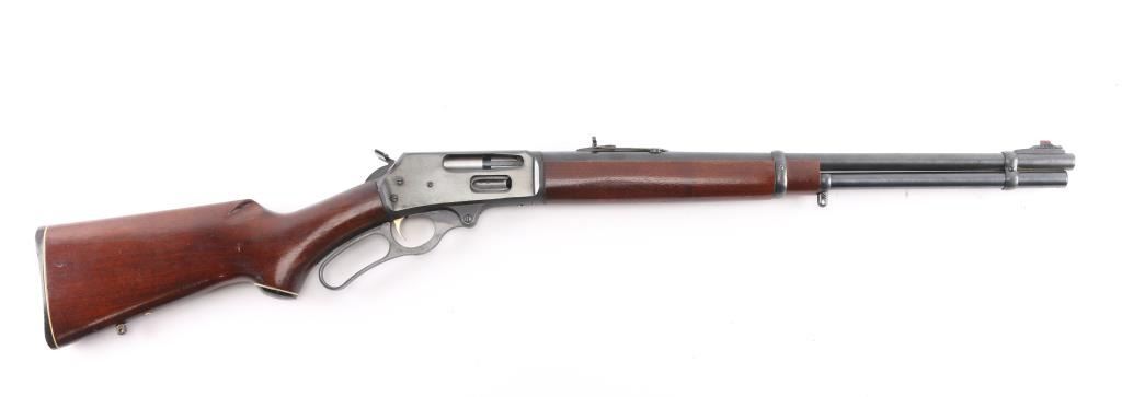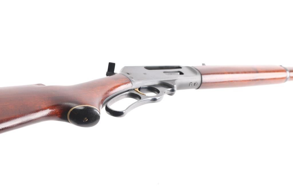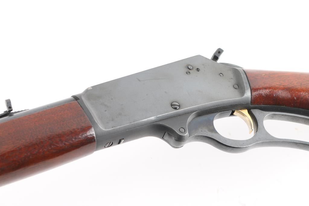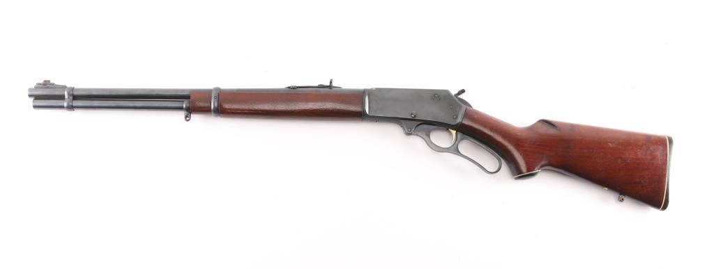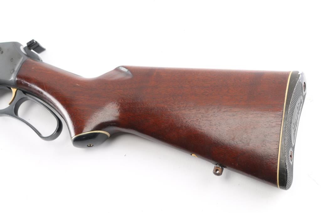 Lever action rifle manufactured circa 1976. Features 20" barrel, beaded blade front sight in dovetailed base, folding buckhorn rear sight, full length tube magazine under barrel, black plastic grip cap & buttplate with white line spacers, smooth trigger, serrated hammer spur with offset extension, curved finger lever, sling studs. Bore is very good condition. Retains 90% blued finish, with scratches and scrapes, edge losses. Small amount of rust on rear sling stud. Wood is very good condition, varnished. with scratches and small dents.