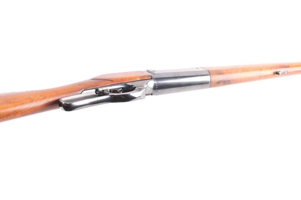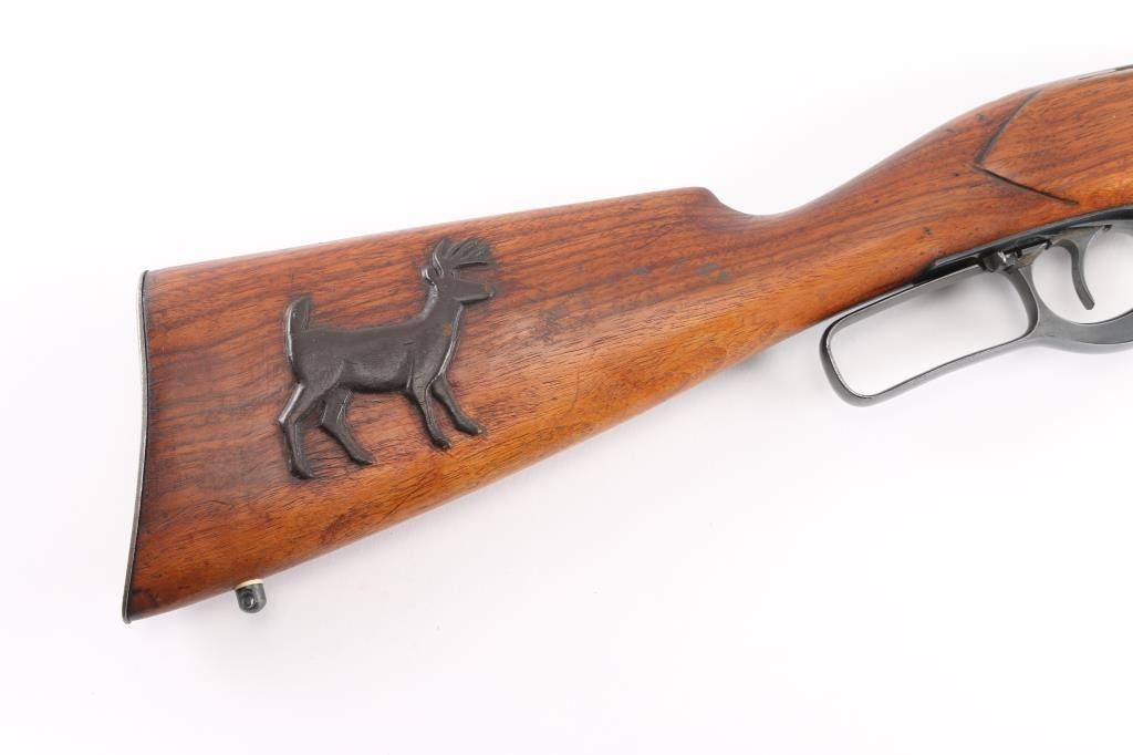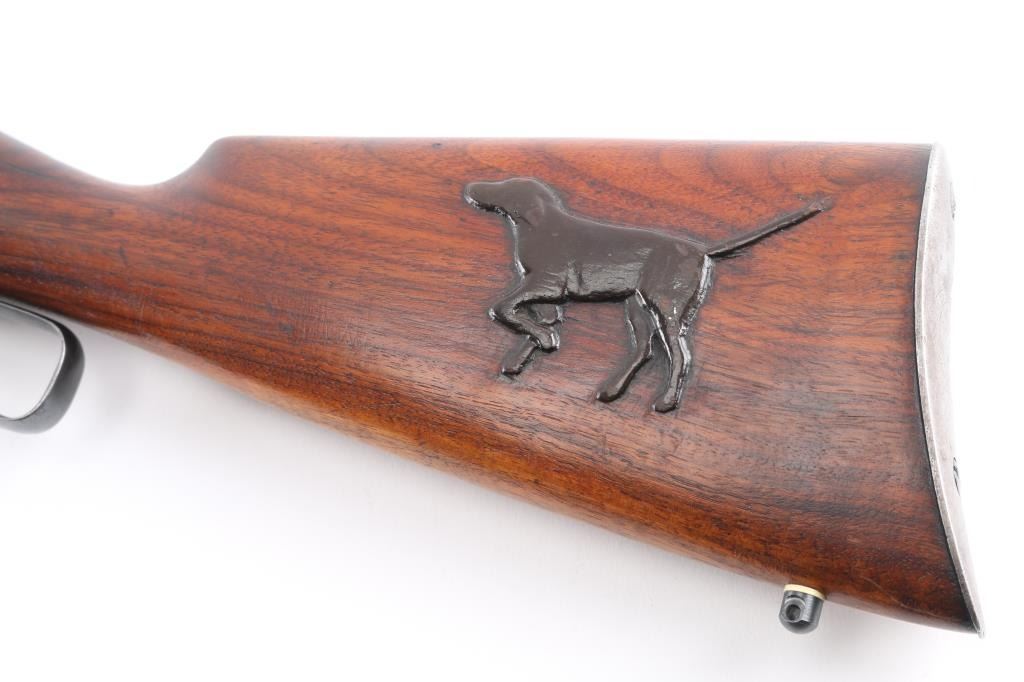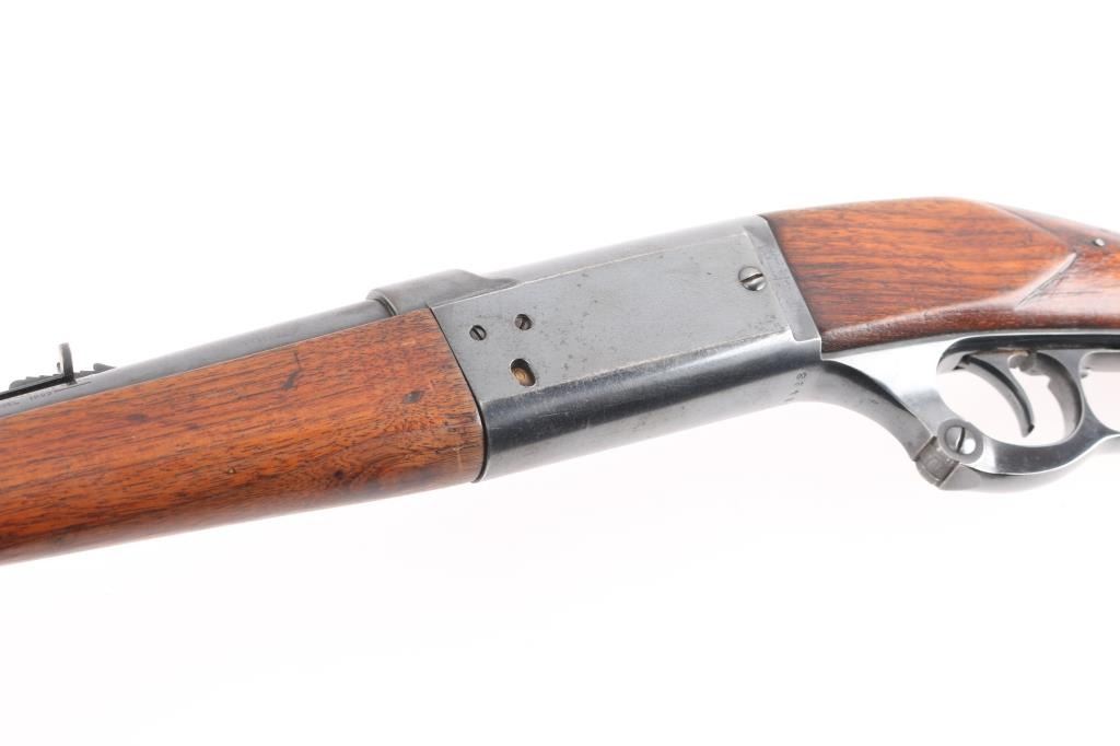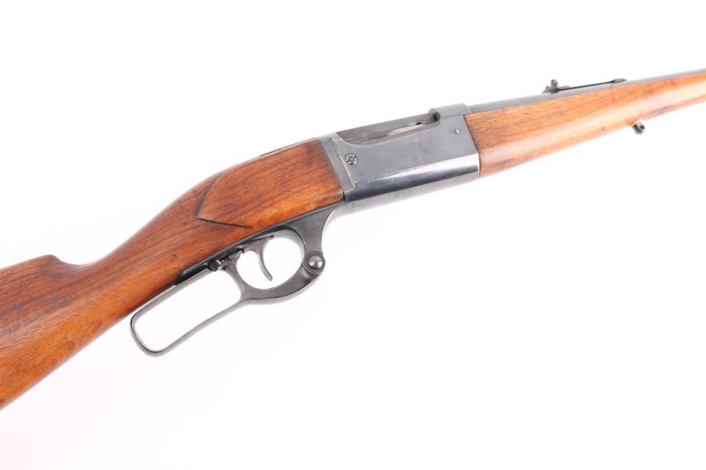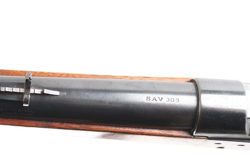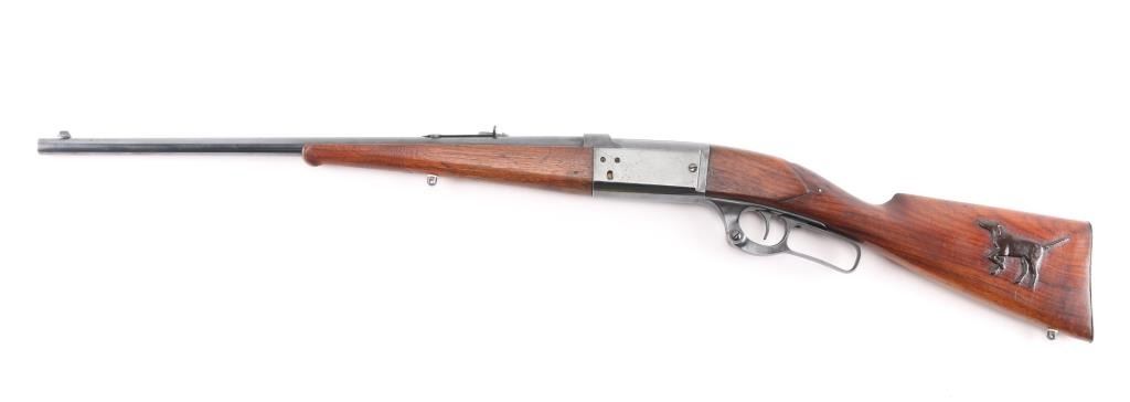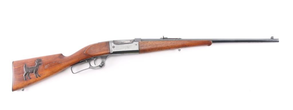 Vintage lever action repeating rifle chambered in .303 Savage caliber, manufactured circa 1911. Features a dark re-blued finish, approx 22" barrel, beaded blade front sight in dovetail, sporting rear sight, internal rotary magazine with brass spool/round counter, cocked indicator on the upper tang, smooth trigger, straight finger lever, sliding safety (and lever lock) on the lower tang, smooth walnut forend with schnabel tip, smooth walnut straight wrist shoulder stock with added carved decorations, swivel studs, smooth steel buttplate. Bore is good condition, frosted, a bit dark, steady strong rifling. Retains 85% re-finish, including receiver and lever, showing edge losses, some fading, discoloration on lever boss, cleaned spots and a bit of patina on barrel. Wood is fair to good with repaired break at wrist, chip missing near receiver, many scrapes and scratches. Left side of butt features a large hunting dog, large deer on right, appear possibly added material, or relief carved in original stock, stand about 1/8" proud, darkened to a deep brown color. Buttplate has good fit, thick side edges may indicate trimming to fit the new stock dimensions. Forward part of wrist shows points, appear a later addition with only fair workmanship. Wrist repair shows pins or screws, two holes in tang area.