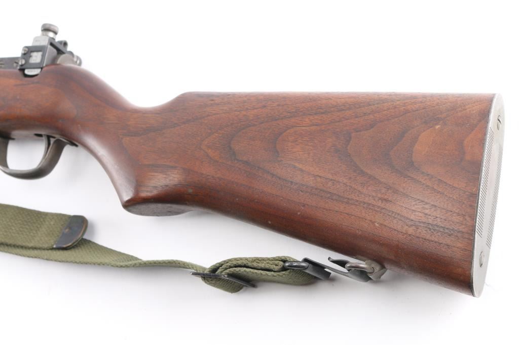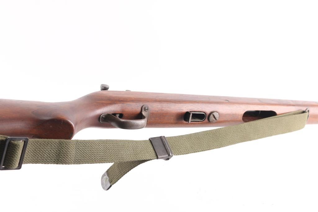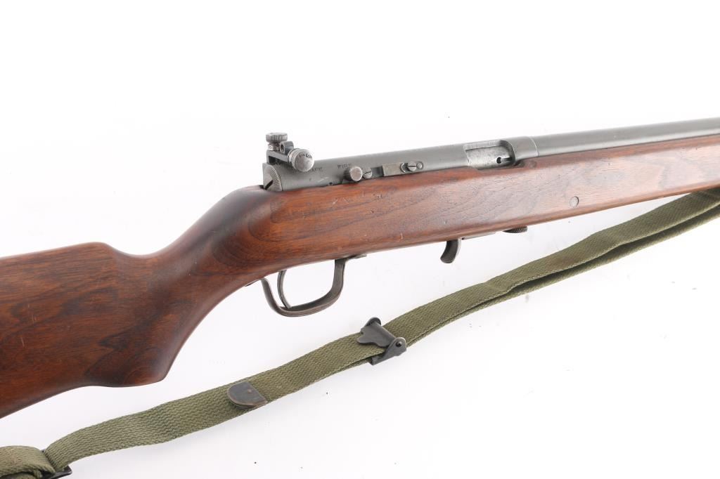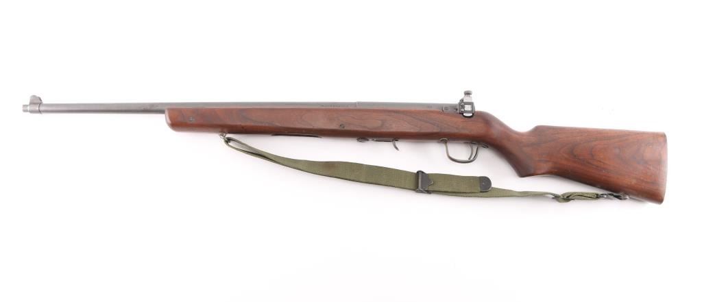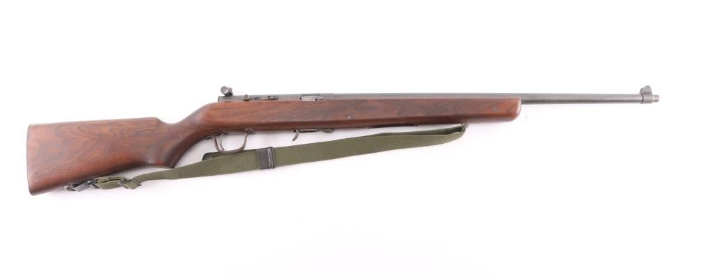 Manufactured c. 1944-46. Semi auto magazine fed rimfire rifle features blued finish, plain pistol grip walnut stock with serrated steel buttplate, , 23" barrel ,with protected front blade and receiver mounted adjustable Redfield rear peep sights. Sling swivels, manual safety, accepts detachable 10-rd magazines. The action is cocked and first round chambered via a charging lever that is accessed via a port in the underside of stock. Bore is excellent/bright, action is smooth, wood is very good with some minor scratches, small chipout of the top left fore stock, metal finish is a dull gray with some brown patina on the triggerguard. No Magazine.