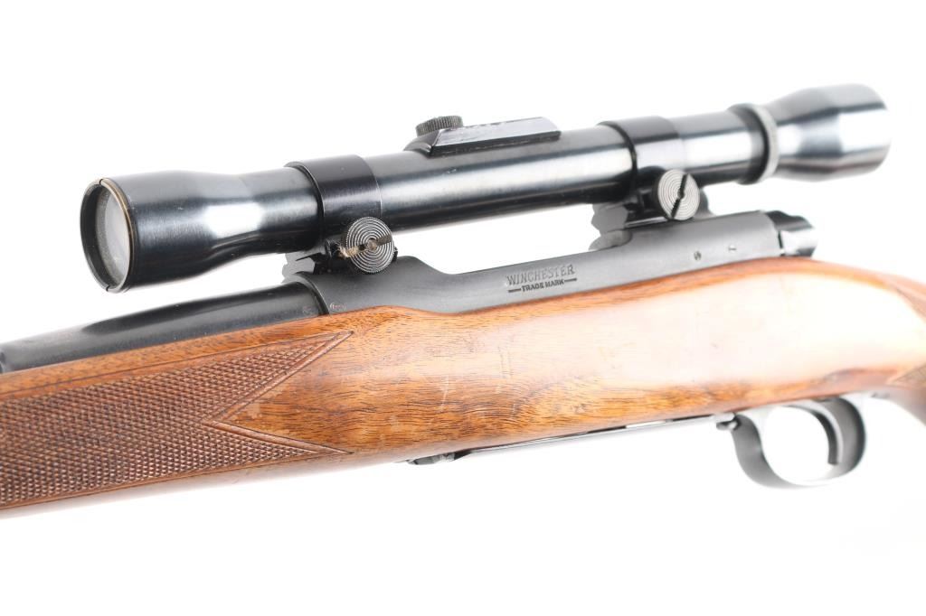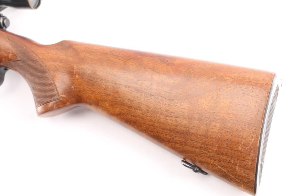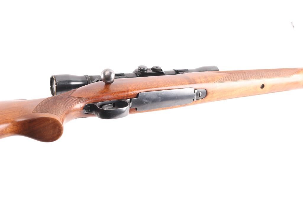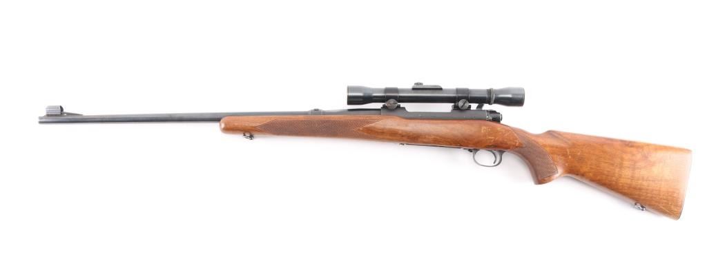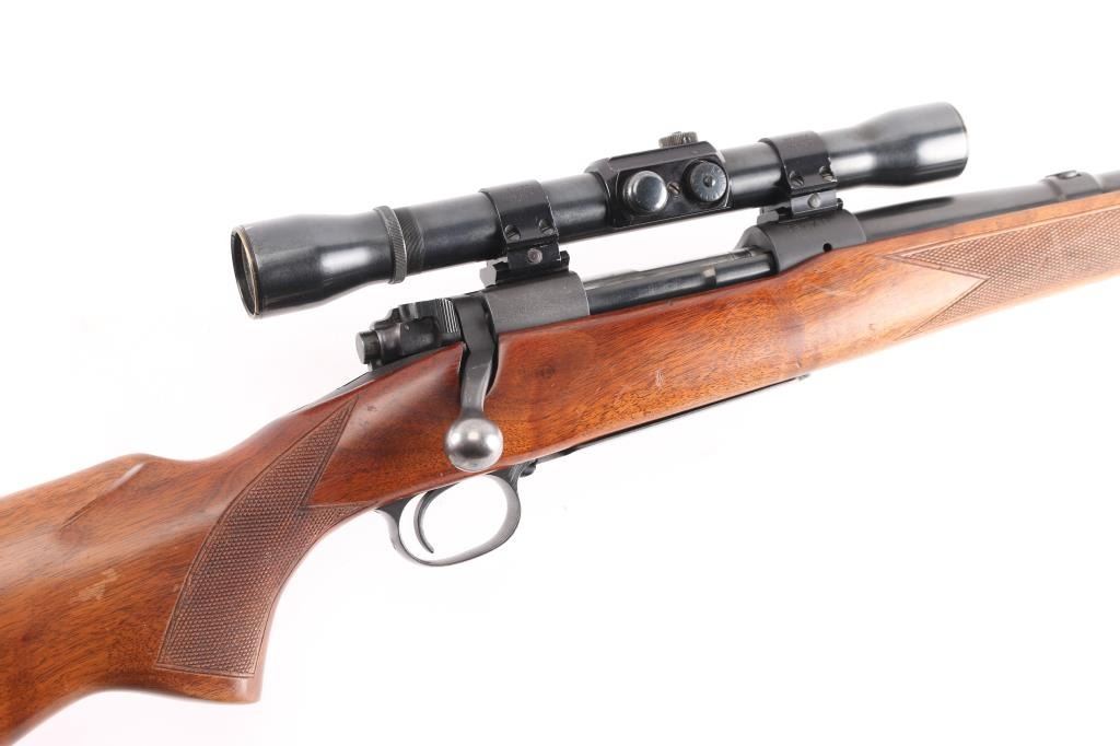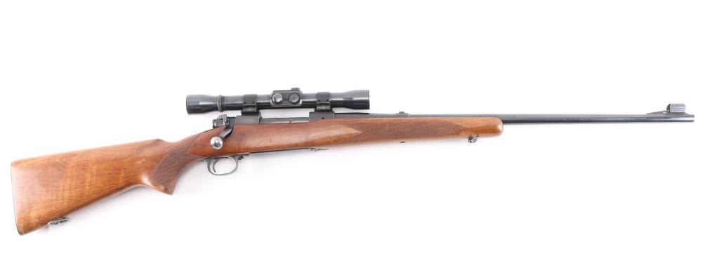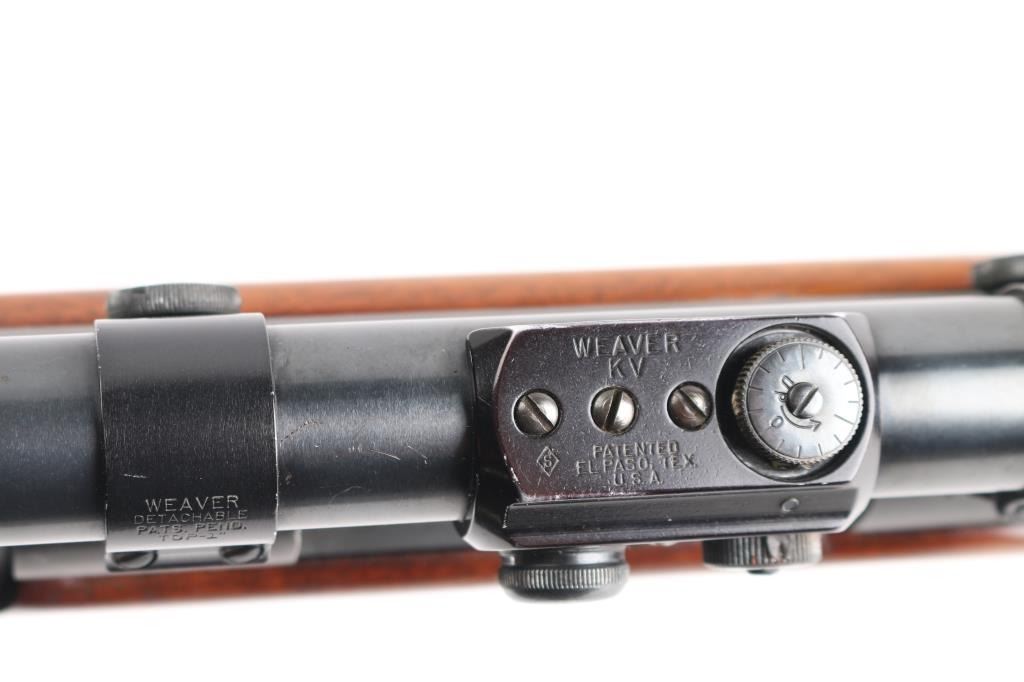 "Pre '64" Vintage bolt action rifle, factory chambered for 257 Roberts, circa 1951. Features blued finish, 24" barrel, ramped and hooded blade front sight, rear sight dovetail filled with blank, three position safety, hinged floorplate, two piece Weaver bases located on factory tapped holes. Mounts a Weaver KV 2-3/4-5x scope (third turret has magnification adjustment) with dot & superfine crosshair reticle. Checkered walnut stock without cheek piece, sling swivels, checkered steel buttplate. Bore is bright. Rifle shows very good plus used condition, minor wear. Wood is very good with minor marks and wear. Mechanically sound. Scope has clear view.