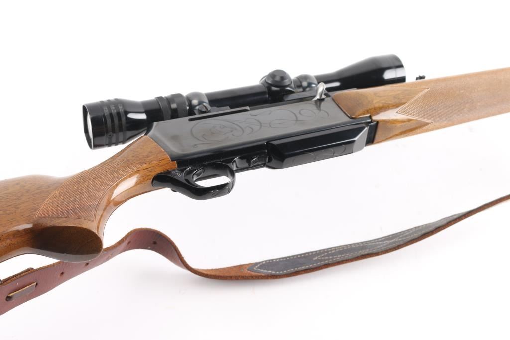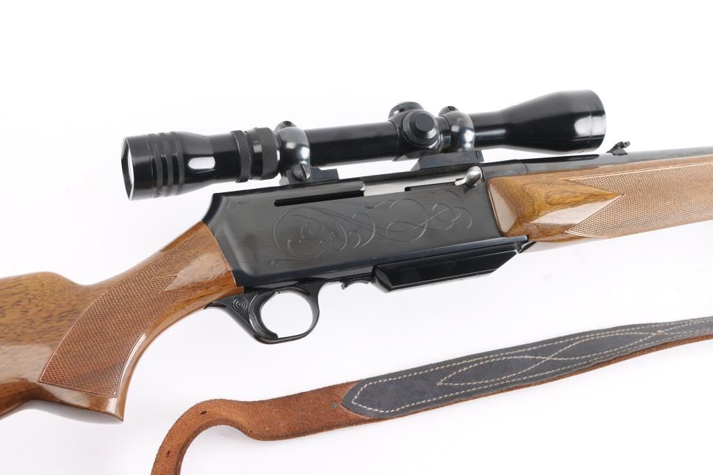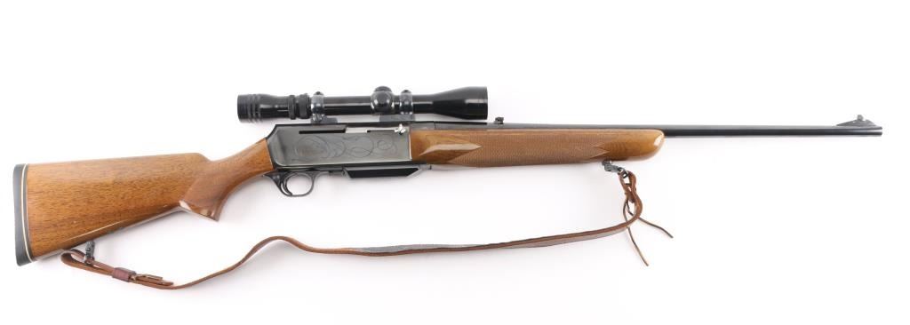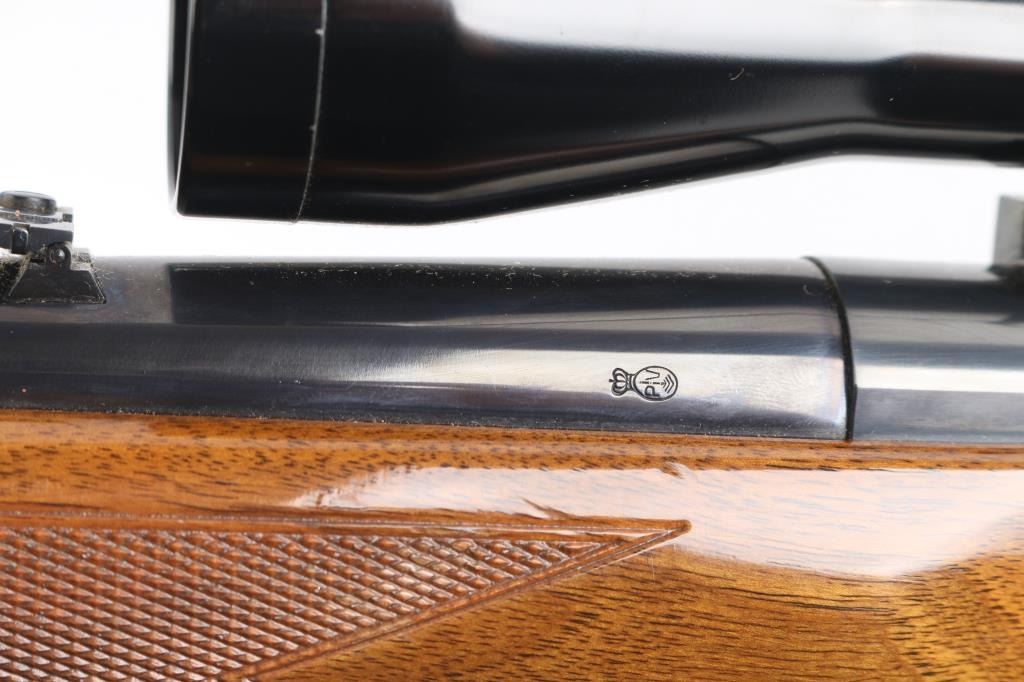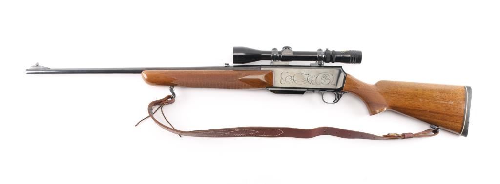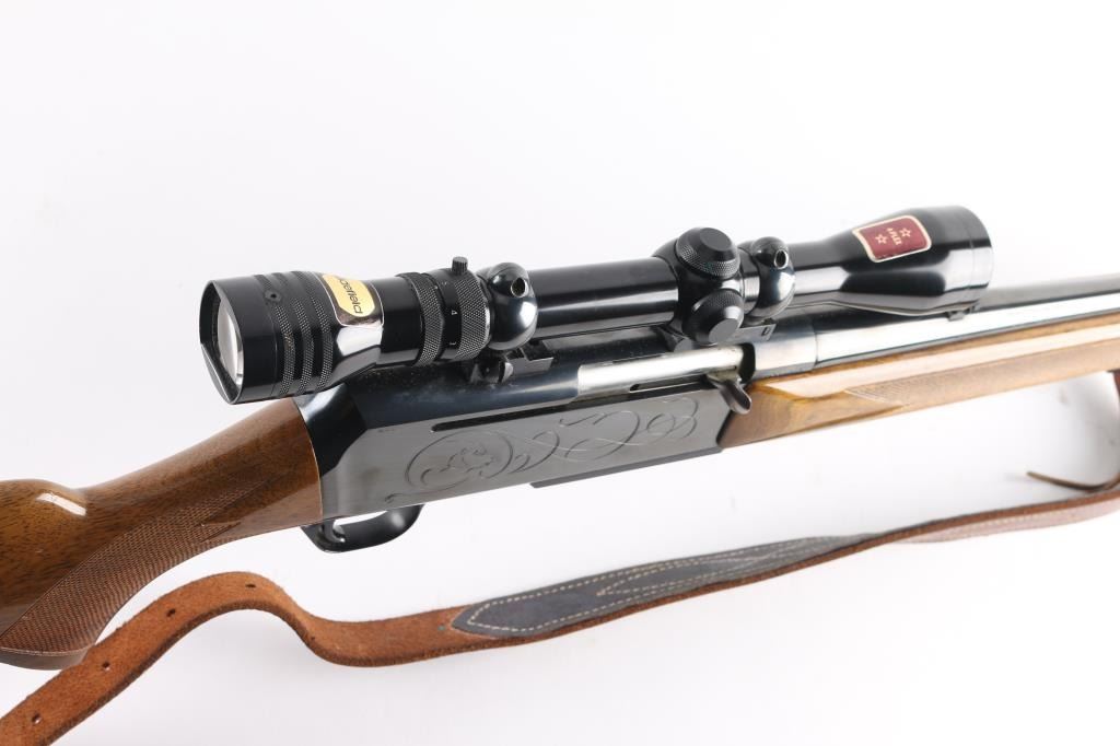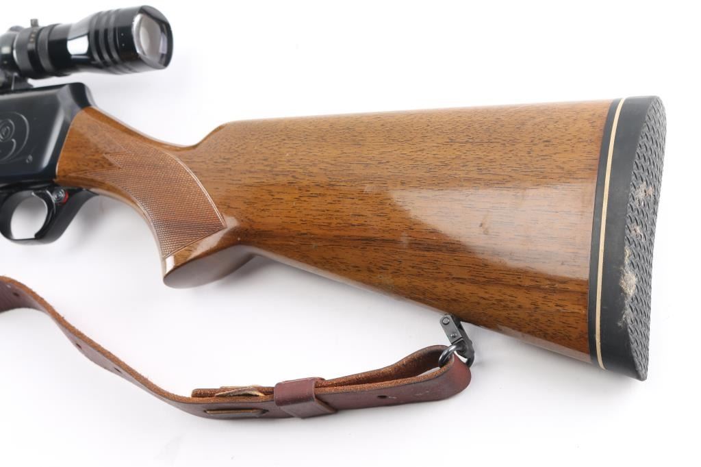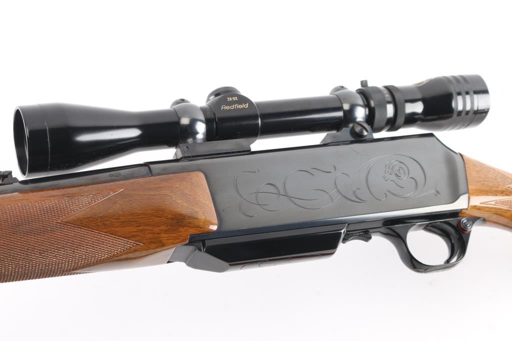 SN: 85283M71. Gas operated semi-automatic sporting rifle chambered in .7mm Rem. Mag., manufactured in Belgium by Fabrique Nationale circa 1971. Features a lustrous blued finish, 24" tapered barrel, ramped blade front sight with brass bead, adjustable folding leaf rear sight, Redfield 3X-9X scope installed on a two-piece Buehler bases, smooth trigger, alloy trigger guard with cross-bolt safety, hinged floorplate, steel receiver with light scroll engraving with images of bear, & big horn sheep, point checkered walnut forend, and semi-pistol grip shoulder stock with factory recoil pad. Rifle retains approximately 95% of its original blued finish showing some light scratches, mostly on the left receiver. Action is smooth, the bore is excellent/bright, the optics are clear with fine crosshair reticle and the wood stocks are very good with minor scratches. Nice brown leather sling attached.