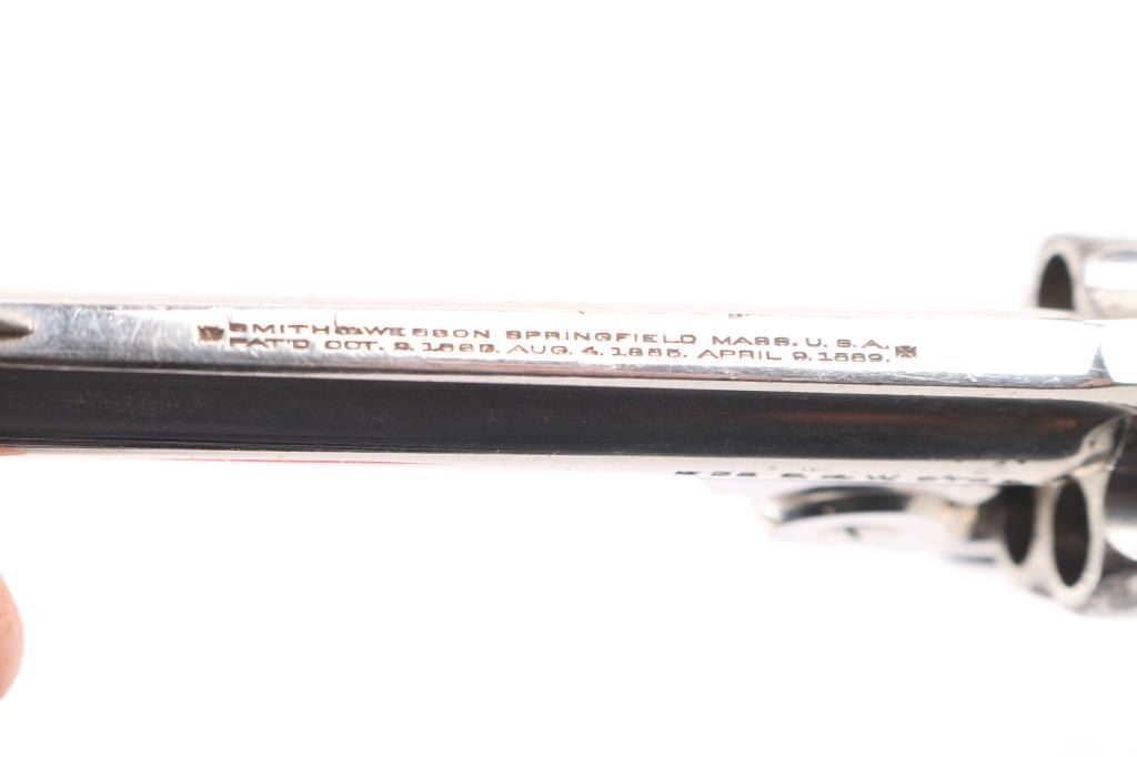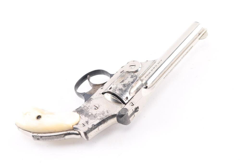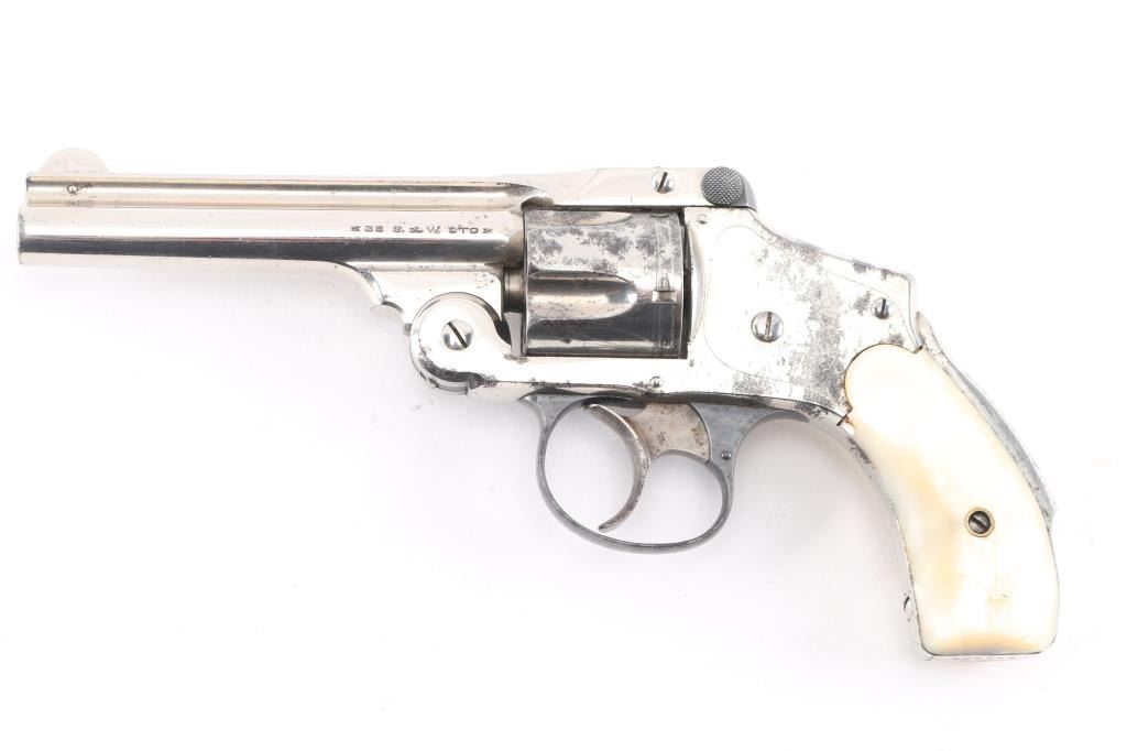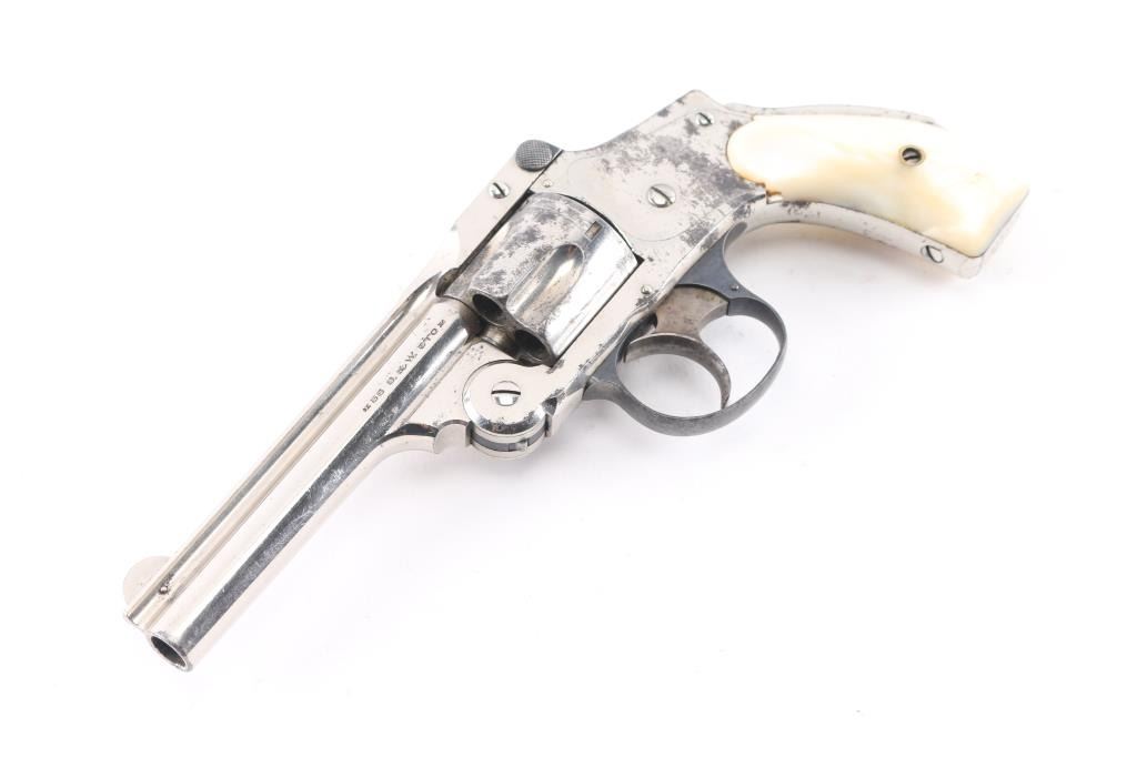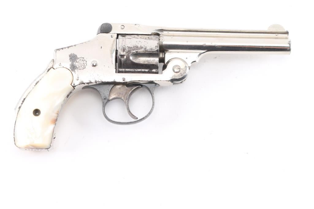 SN: 201890 '4th Model' Vintage top break revolver chambered in .38 S&W, circa 1898-1907. 'Lemon squeezer'. Features a nickel plated finish, blued triggerguard, 4" ribbed barrel, forged round blade front sight, 'u' notched rear sight, fluted five shot cylinder, smooth trigger, backstrap safety and Mother of pearl grips. All serial numbers are matching. Revolver exhibits approximately about 70% of it's original nickel plated finish showing edge wear, scattered losses and patches of pitting. Action is smooth with very good lock-up, bore is has good rifling with scattered light pitting. Mother of pearl grips are good with no chips, or cracks. NRA Condition is good. C&R Firearm.