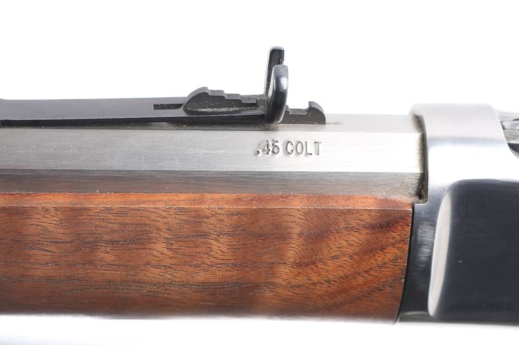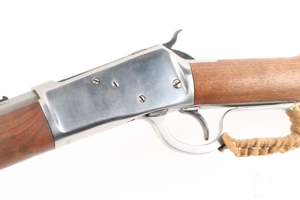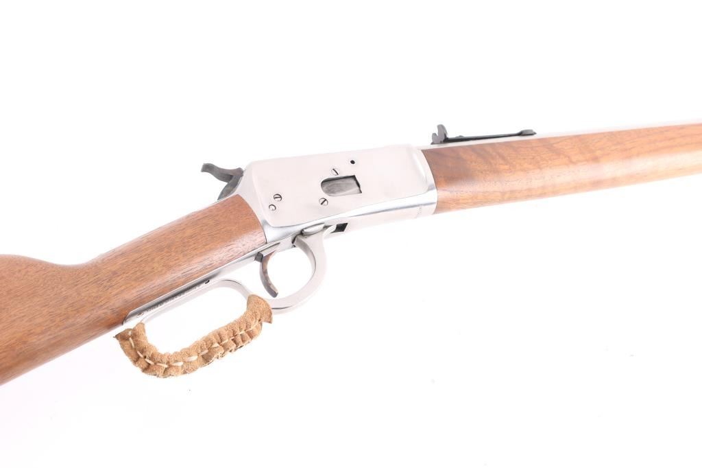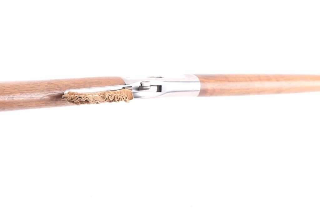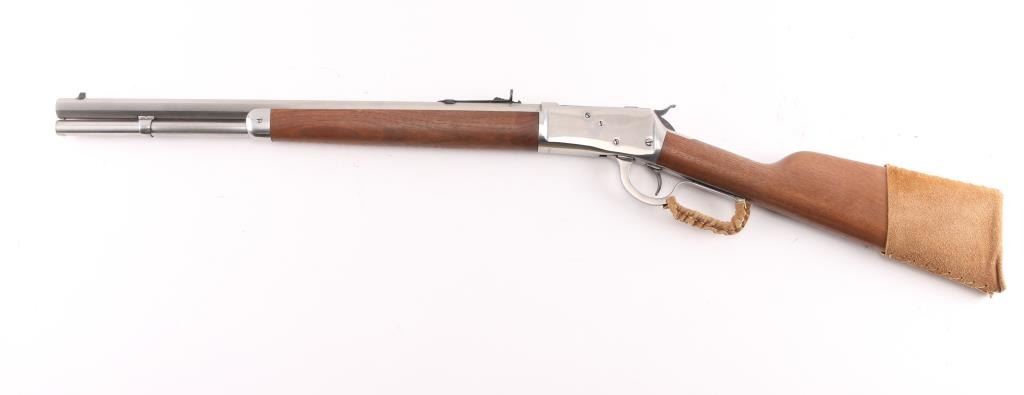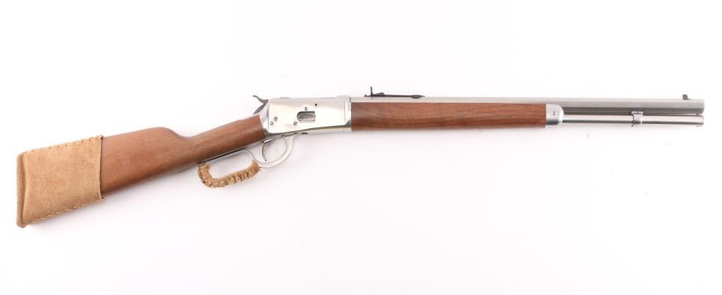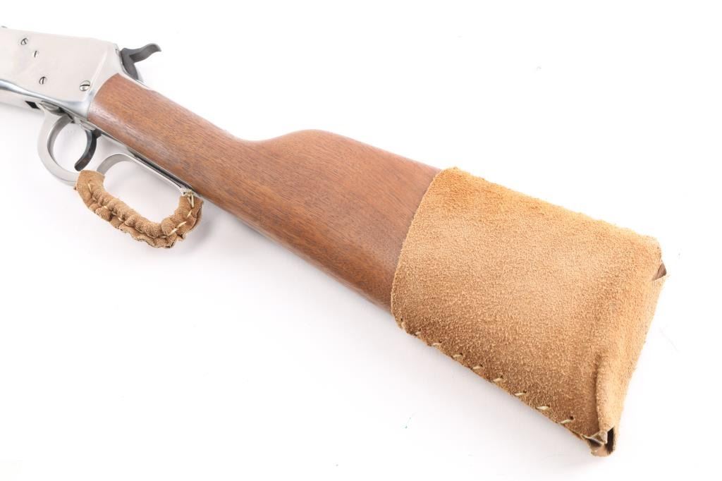 Lever action repeating rifle modeled after the Winchester 1892, manufactured in Brazil by CBC, imported by Navy Arms, Ridgefield, NJ. Features stainless steel construction, 20" octagonal barrel, full length tube magazine, dovetailed blade front sight with brass bead, adjustable semi-buckhorn rear sight, smooth trigger, serrated hammer spur, smooth hardwood forend and straight grip shoulder stock with curved metal carbine buttplate. Bore is pristine. Overall like new condition with minor handling marks, few scratches to receiver.