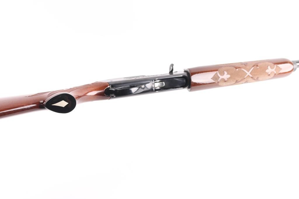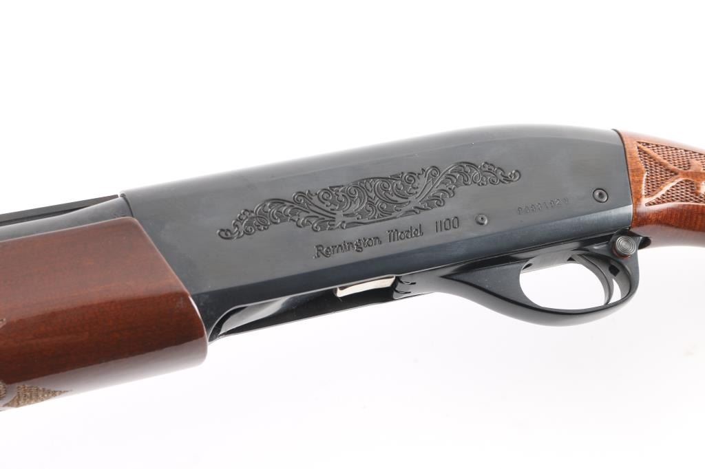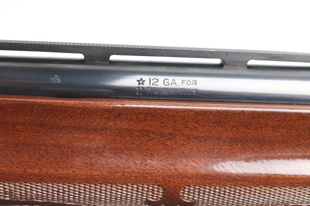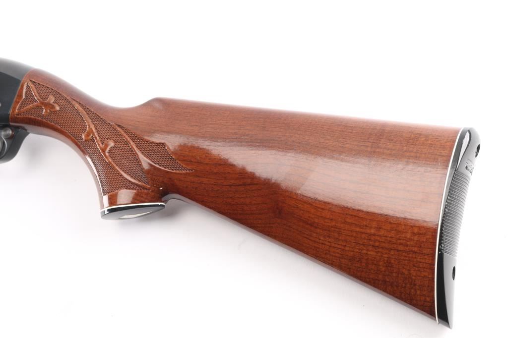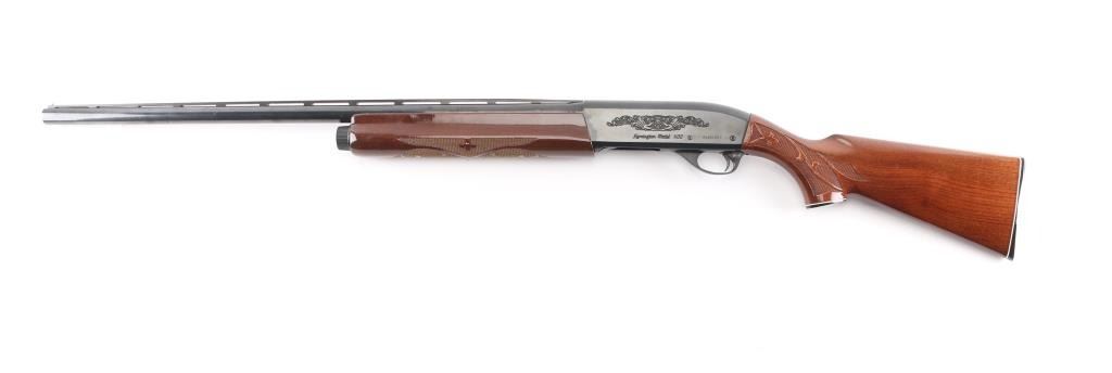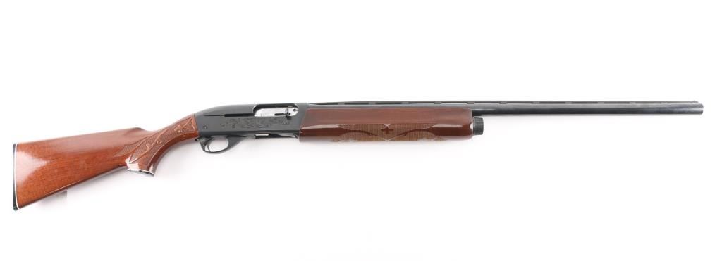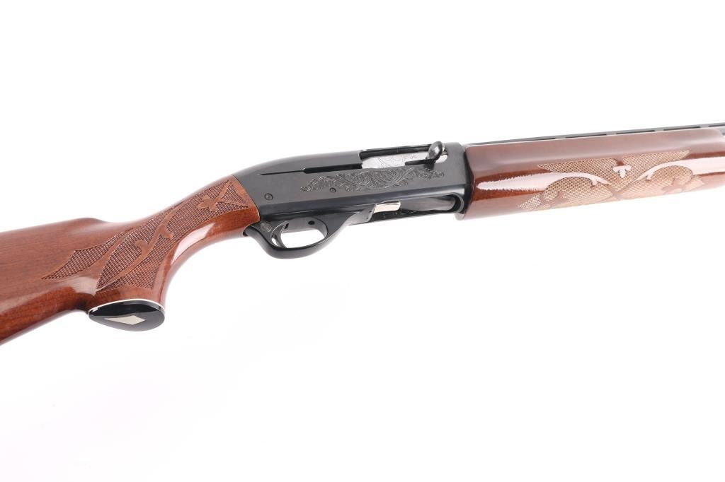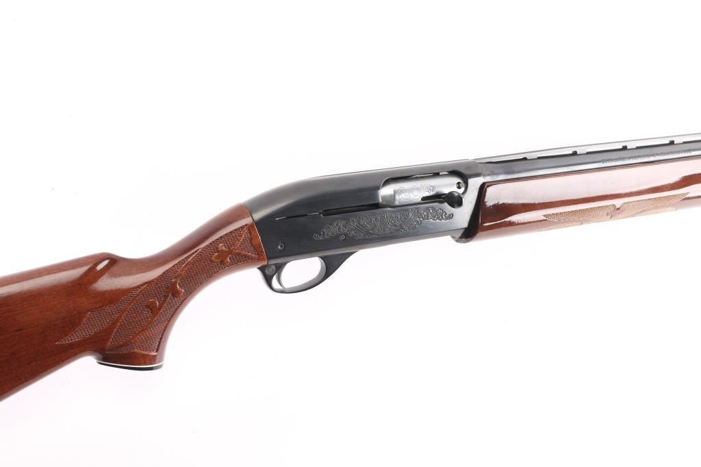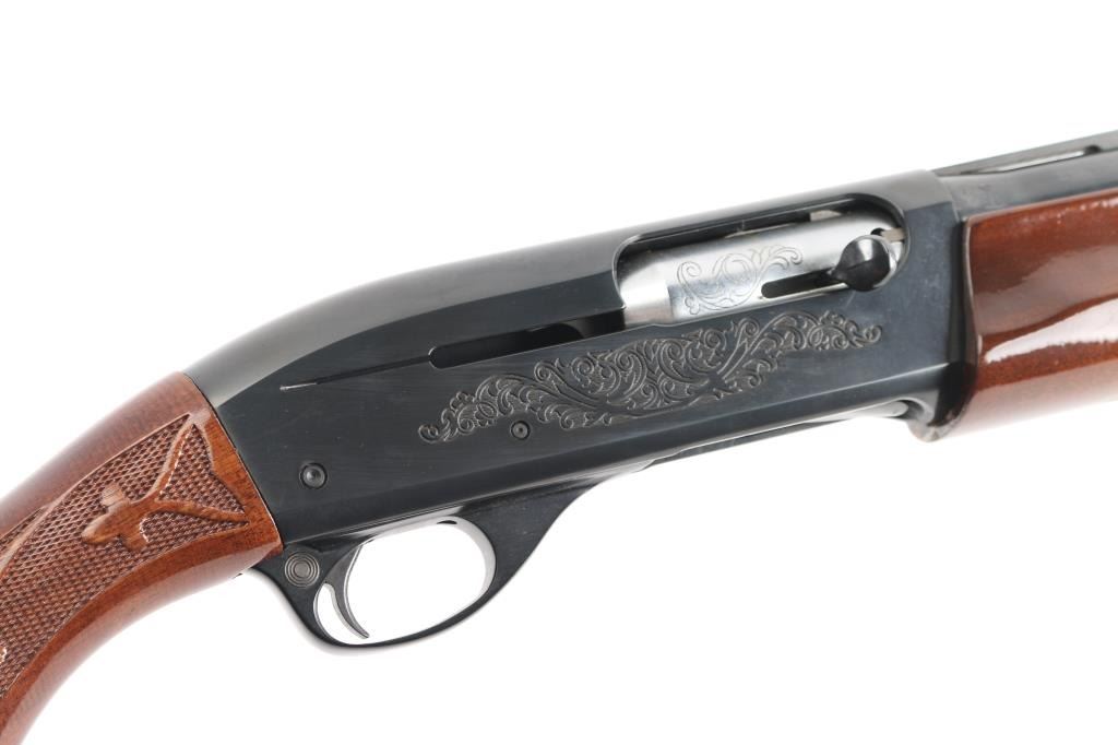 12 Ga. Shotgun. Semi-Automatic. Gas-Operated. Produced 1963-Present. 28" barrel with vented rib. sighting bead. 2 3/4" chamber. Mod. choke. 4-rd tube magazine. Push button safety. Bottom loading, side ejecting. Floral scroll designs on receiver. Bore is excellent. Action is crisp/tight. Blued finish is excellent. Checkered walnut stock and forearm are very good with very minor scratches. Black plastic Remington buttplate. LOP is 14".