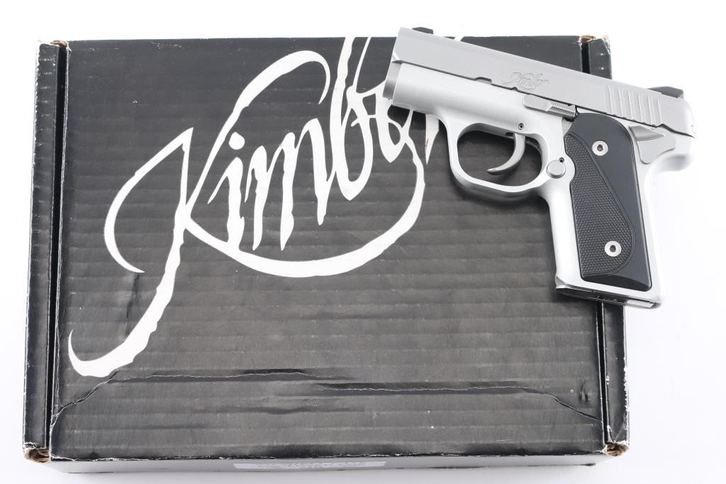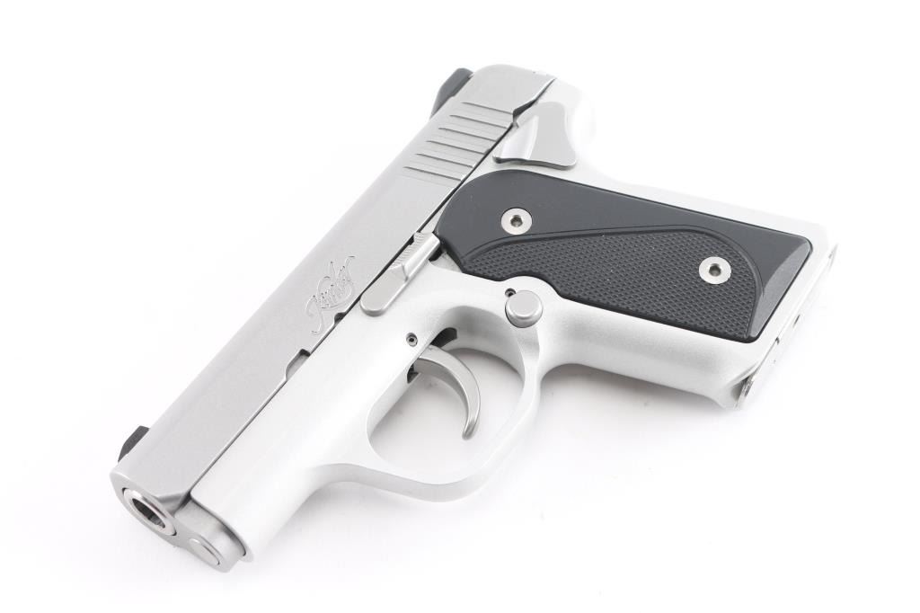 This micro-compact Kimber Solo Carry 9MM pistol features a high-grade aluminum frame with KimPro II finish, satin silver stainless steel slide, 2.7" stainless steel barrel, ambidextrous magazine release button, ambidextrous thumb safety, dovetail mounted low-profile white dot sights, checkered and smooth black synthetic grips, and a striker-fired trigger. Comes with original box, soft case, manual and one mag. Pistol appears to be like like new.