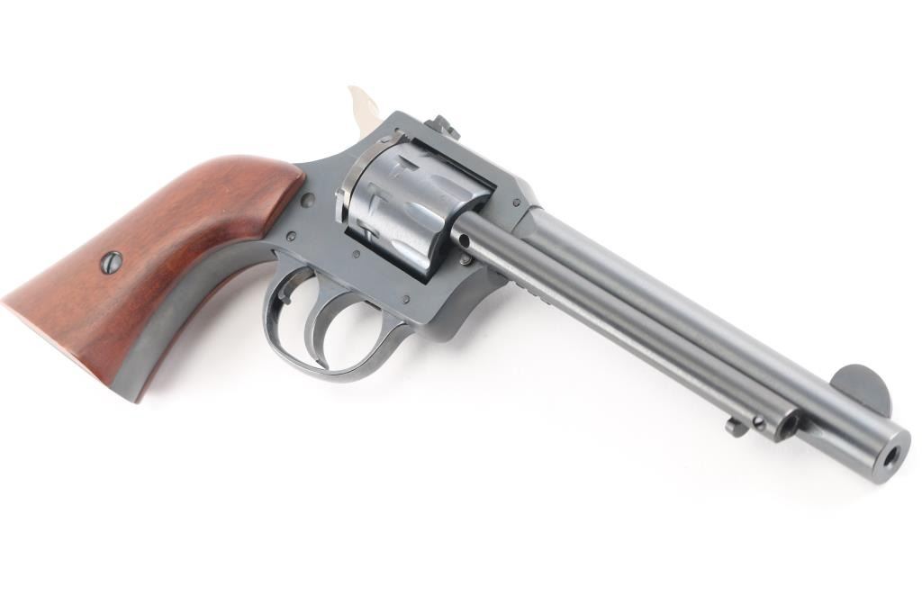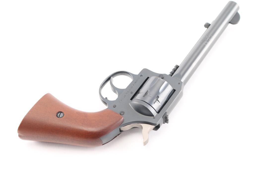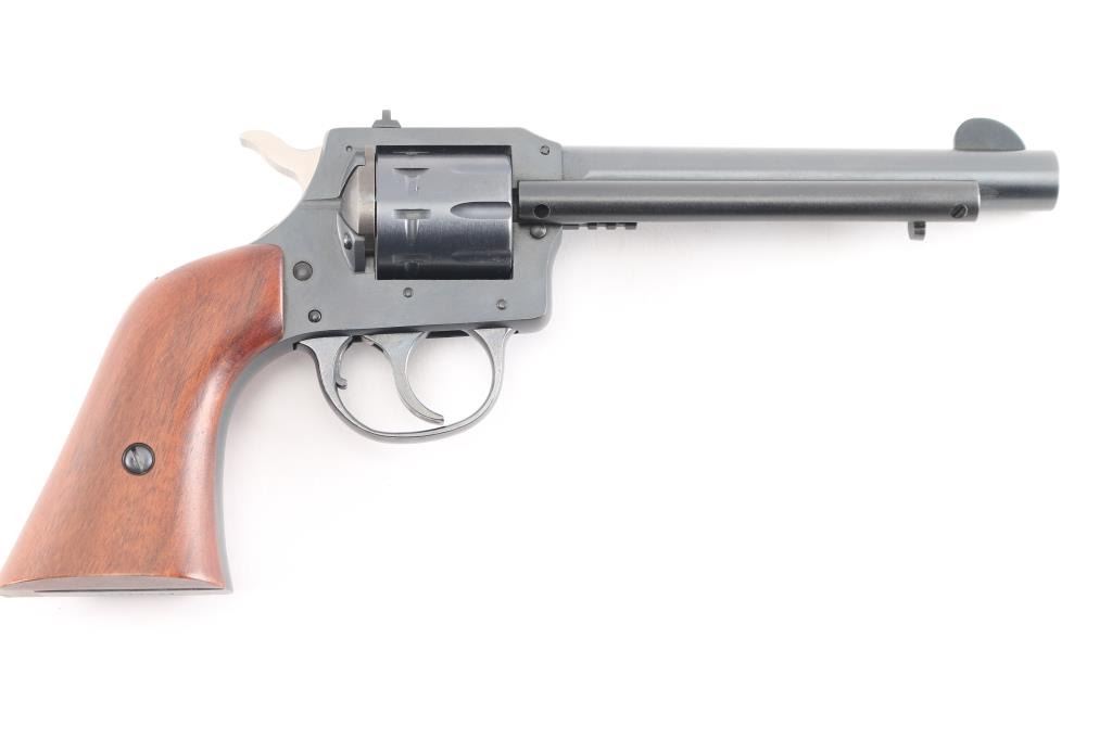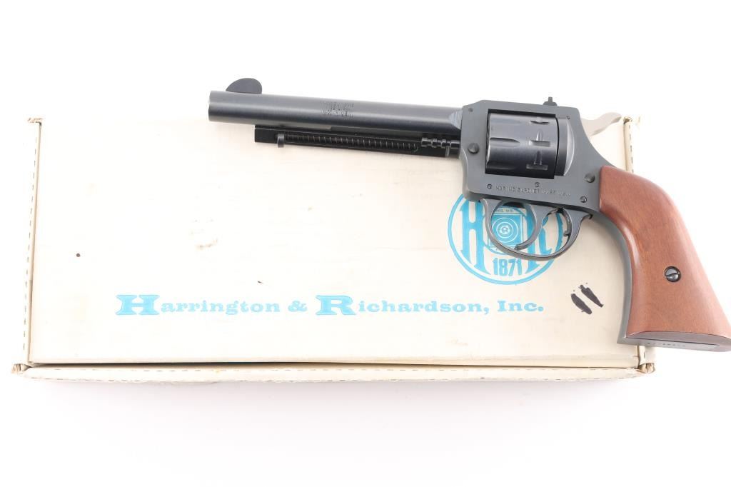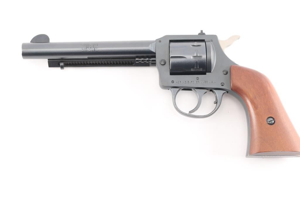 The Harrington & Richardson Model 949 "Forty Niner". The 9-shot DA/SA revolvers were fitted with a 5 1/2 inch barrel, notched rear sight, front blade sight smooth walnut grip that has a mark on the heal of grip, side load and western style ejection, full blue finished, and chambered in .22 LR. No drag marks on cylinder and blue is 100%. Comes with original box.