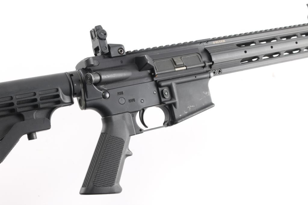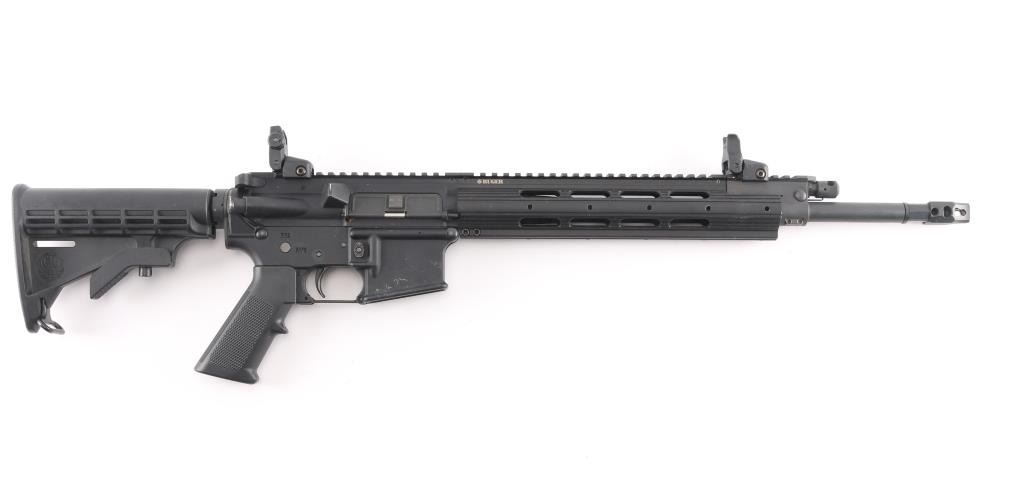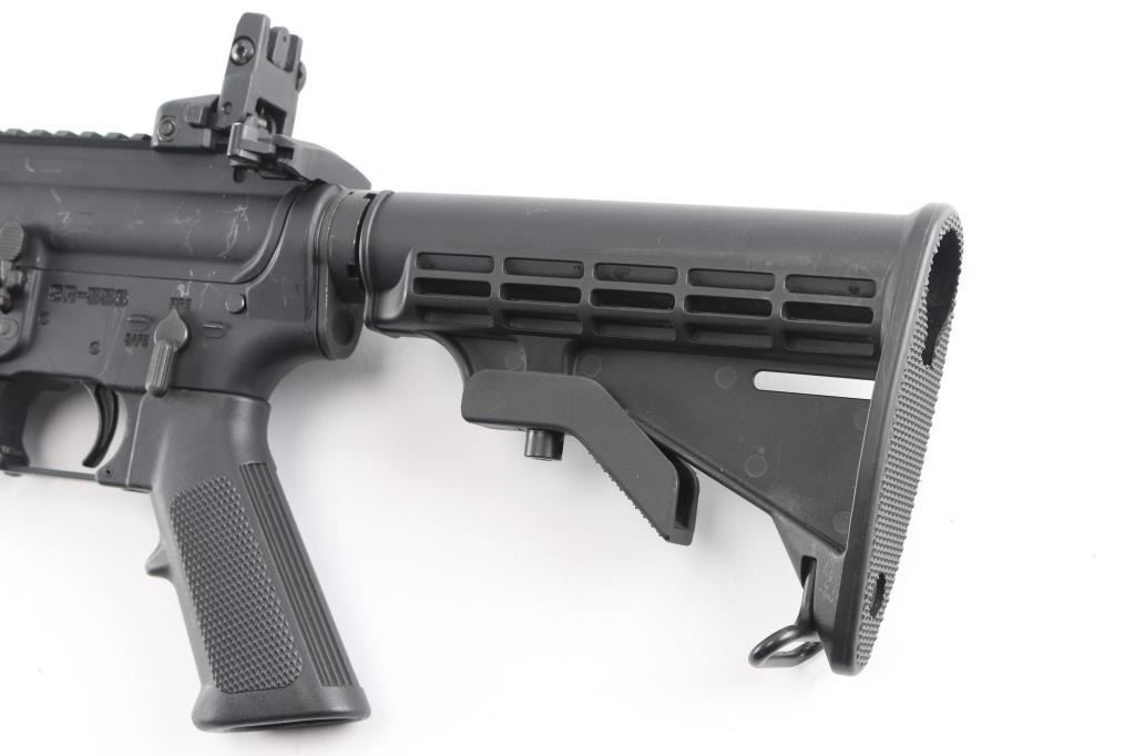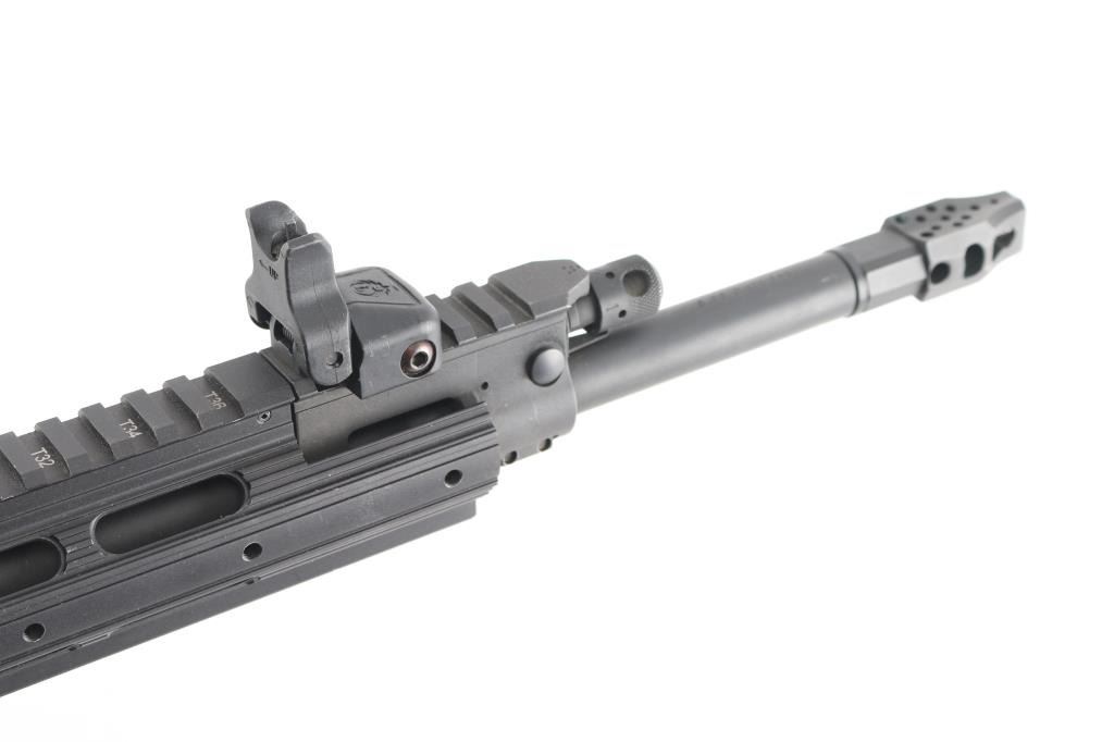 Semi auto AR15 style rifle. Matte black finish with handling marks on receiver.16 inch barrel with muzzle brake. Two stage piston driven operating system. Chrome lined gas block and piston. M4 adjustable buttstock with A2 pistol grip. Flattop receiver with rail and Ruger flip up sights. Barrel is in excellent condition. Rifle retains 90% of finish