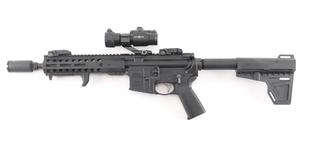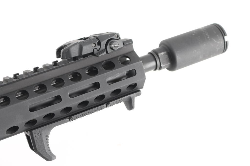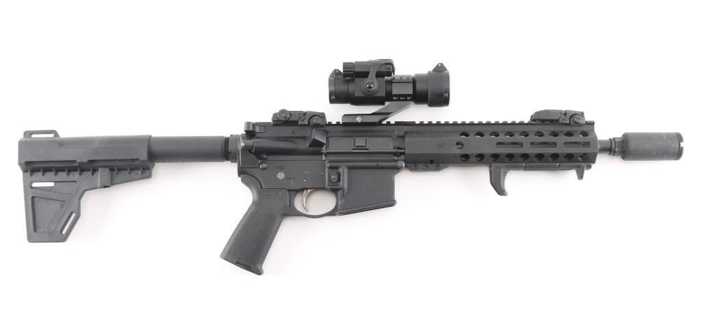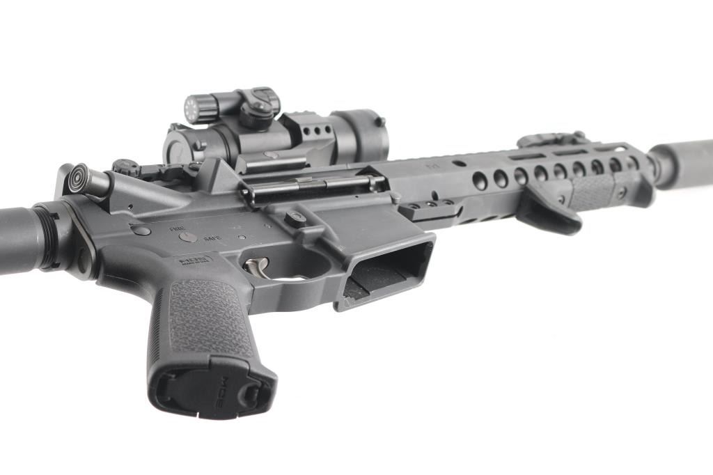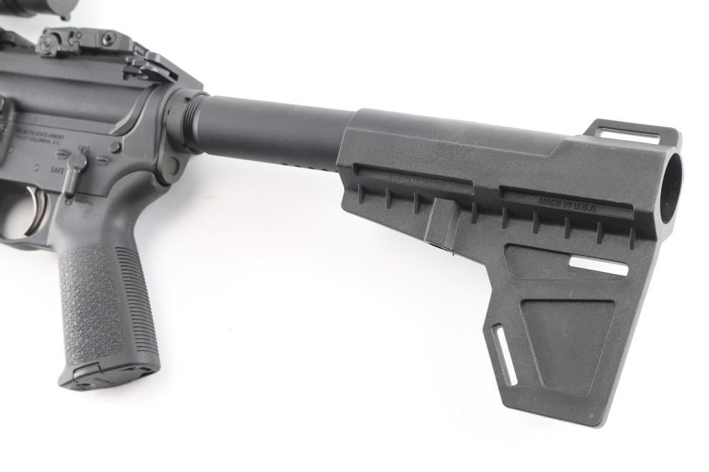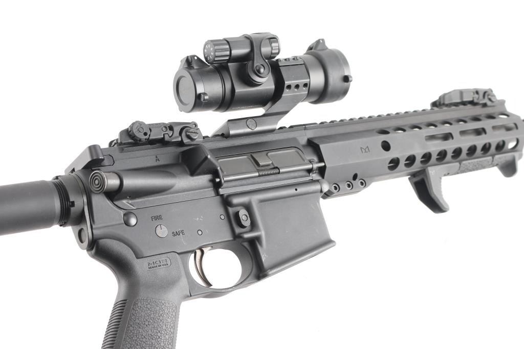 Muzzle device with 13 inch barrel, bore is very good. Pistol Length gas system. MagPul flip up sights with Sight Mark red dot in working order with mount. Manual flip safety, forward assist and shell deflector M-Lok hand guard with top rail and hand rest, MagPul MOE grip with storage. Shockwave Technologies blade pistol stabilizer. No mag included. Retains 95% of finish.