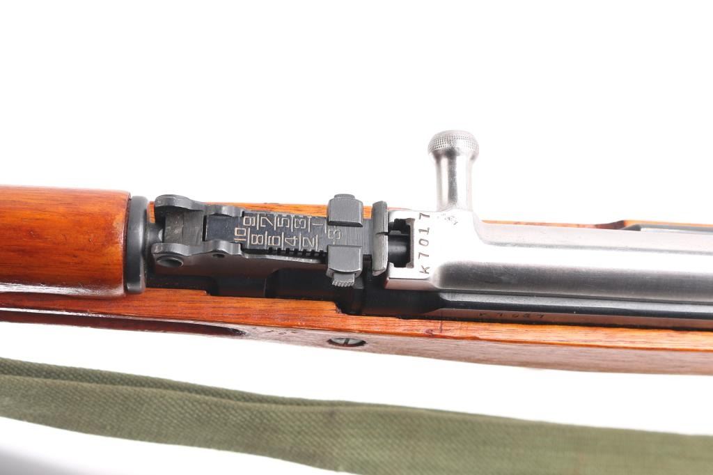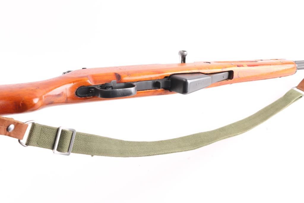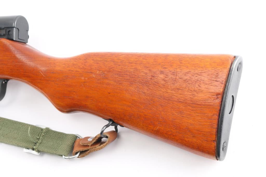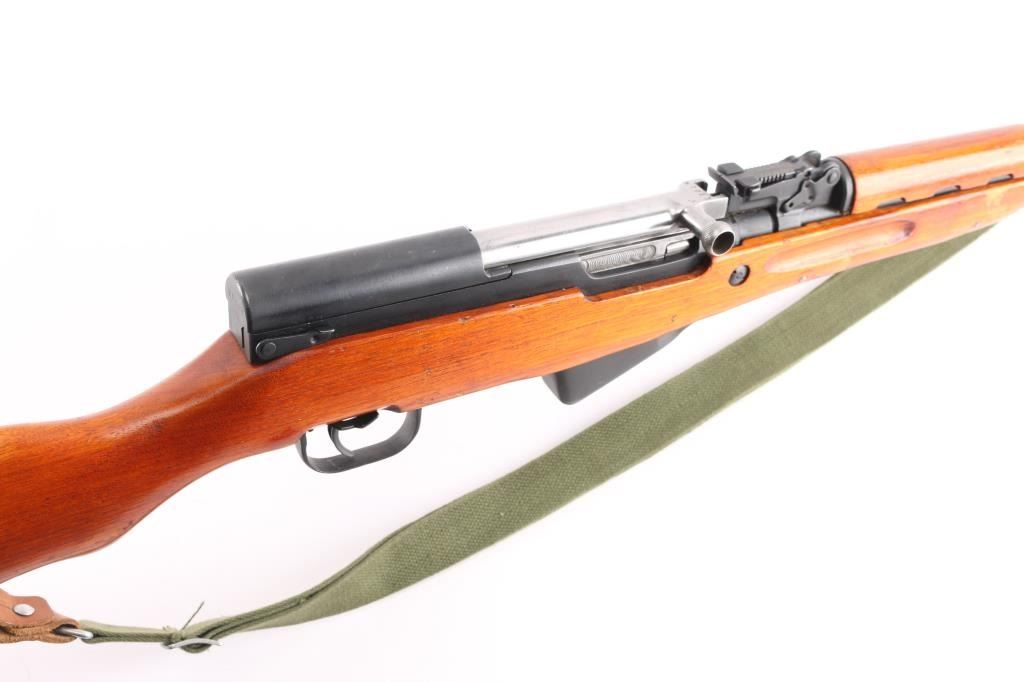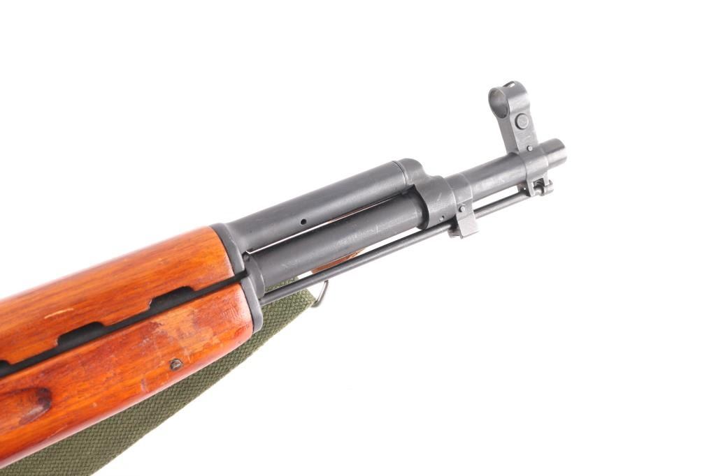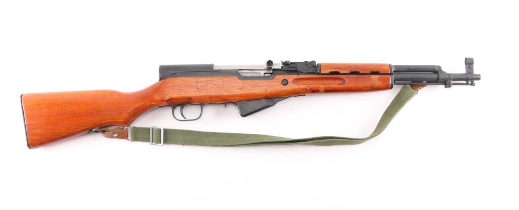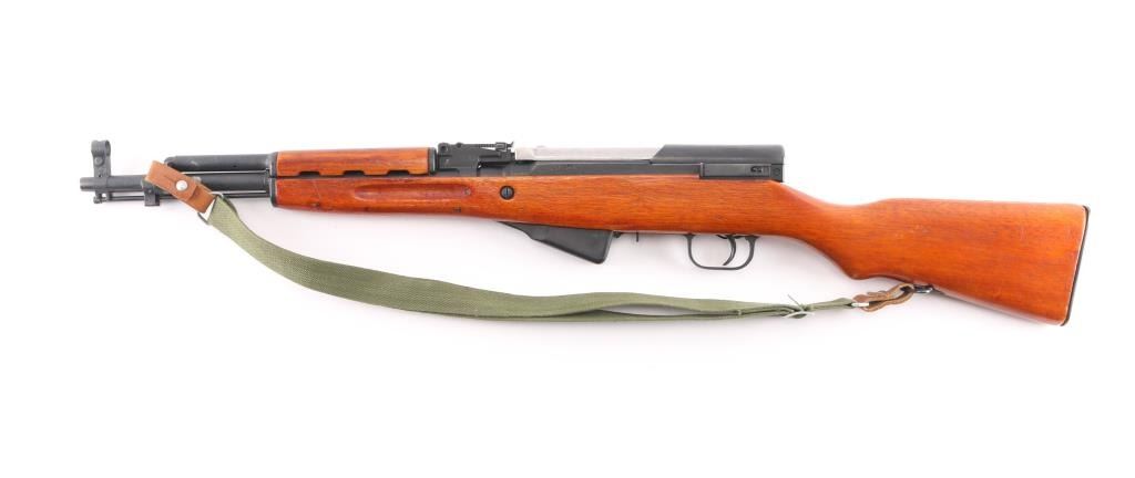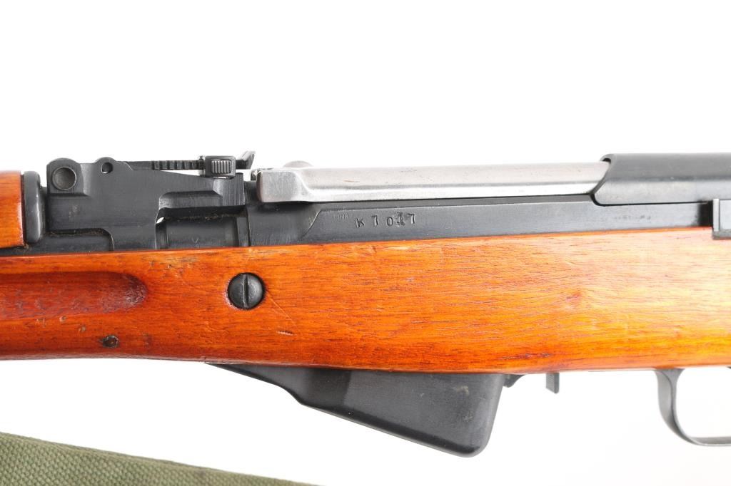 Semiauto rifle with 16 inch sporter barrel, stain shellac finish, stock has folding bayonet area filled with wood, minor handling marks on stock, green canvas sling, and cleaning rod. All major parts are matching numbers. Cleaning kit in rear stock with steel but plate. Scope mount on left side of receiver. Milled trigger group. Function of the rifle is good. Overall a very good SKS. Retains 95% of blued finish. Bolt is in the white.