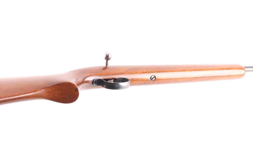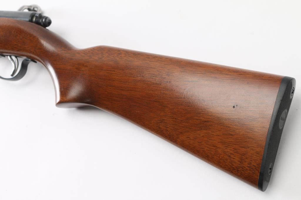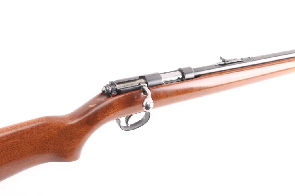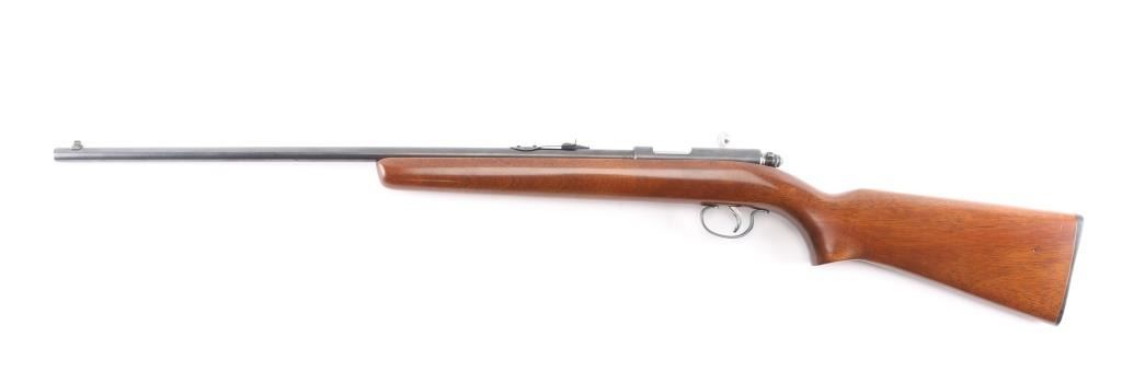 Vintage Bolt-Action Single-Shot rimfire rifle chambered for .22 Short, Long and Long Rifle cartridges, manufactured1948-1970. Blued steel finish. One piece walnut stock. Chrome bolt, & trigger. 24" round barrel with dovetailed blade/bead front sight, adjustable notch rear sight, metal trigger guard, smooth trigger and a thumb safety on the rear of the bolt. Metal finish is 99%, wood is excellent, factory black plastic butt plate. Wood stock is excellent. Bore is excellent/bright. Looks new.