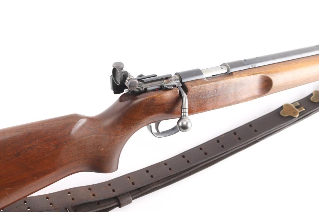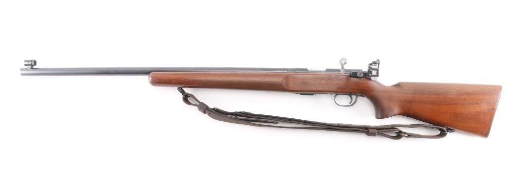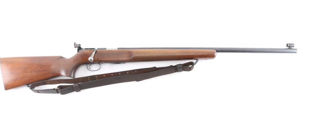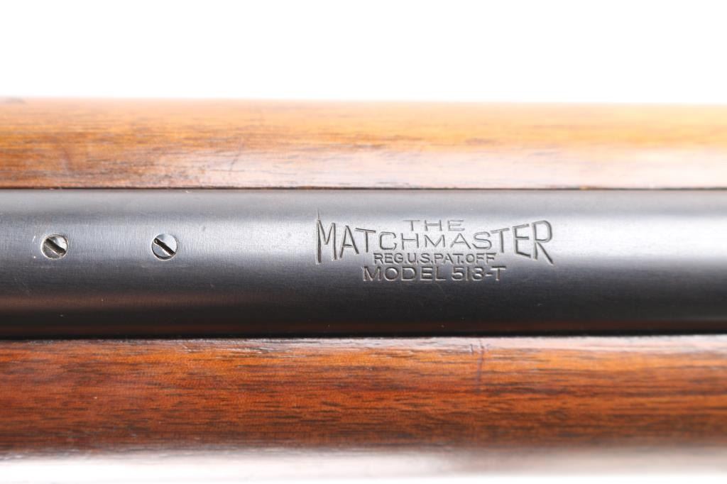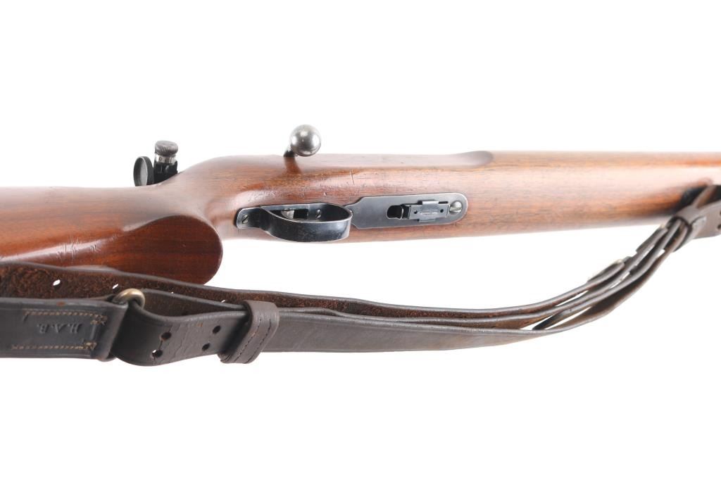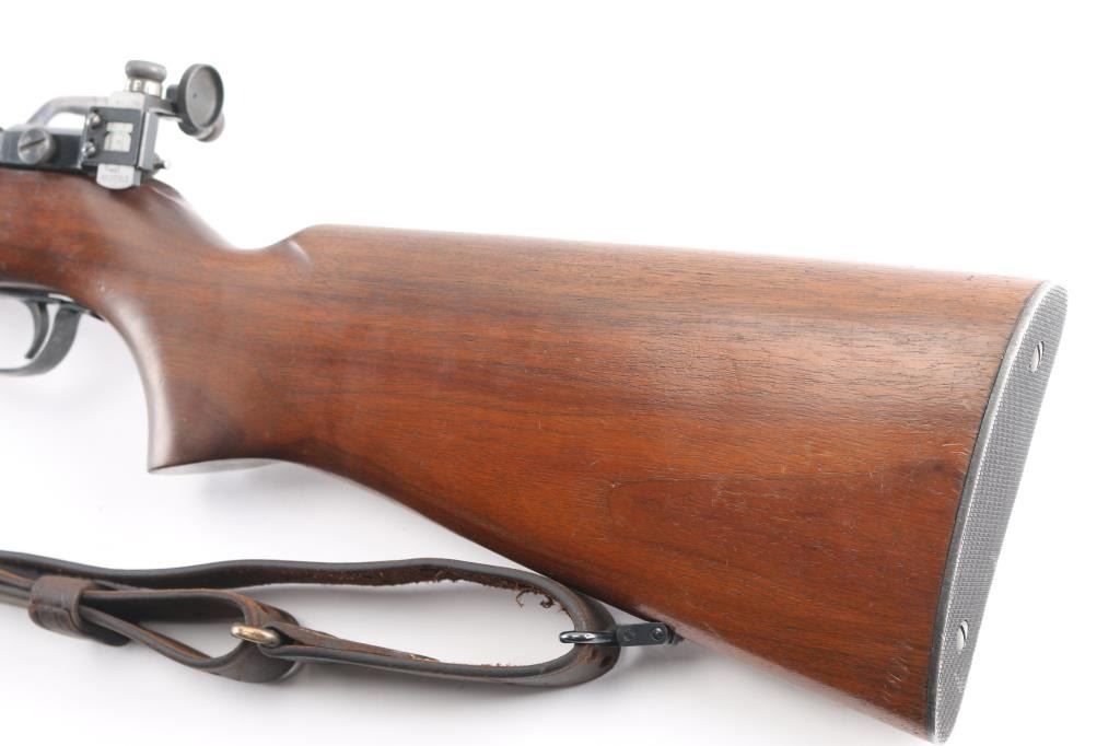 'The Matchmaster' rimfire bolt action target rifle manufactured thru 1968. Features 27" heavy barrel, target sights (Redfield rear peep, globe front), accepts detachable magazine, manual safety, sling swivels. Front swivel mounted in a track with multiple location options. Smooth wood stock has dark color stain & varnished finish. Checkered steel buttplate. Bore is excellent/bright. Retains 90% blued finish with scuffs, scratches. Wood is very good condition with scrapes & dents, a little handling loss. USGI M1907 sling attached.