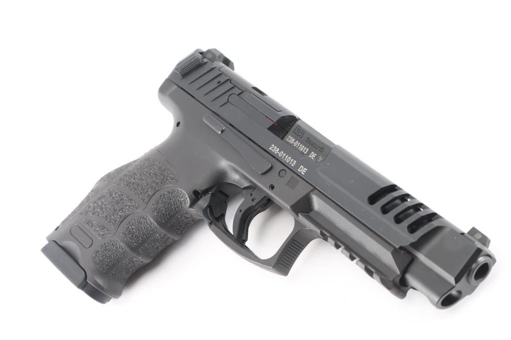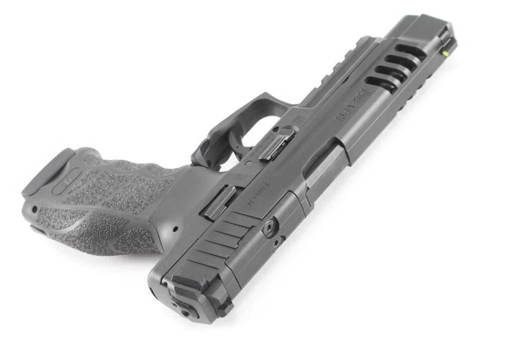 Optics Ready German semiautomatic target or competition pistol imported by HKI, Columbus GA. Features longer 5" barrel, lengthened slide with lightening cuts, sights in dovetails (XS green dot sight in front, plain window rear sight), striker fired with striker status indication, manual safety in trigger, accessory rail on dust cover, changeable grip panels and backstrap. Finish is black slide over black polymer frame. Slide has removable panel forward of rear sight, for mounting a red dot reflex sight. Bore is excellent condition. Overall external condition is like new, with little evidence of handling. Serial numbers match on frame, slide, barrel. Includes factory plastic case, manual, two additional backstraps, additional sets of grip panels, 2 spare extended (20 rd) magazines, mag loader.