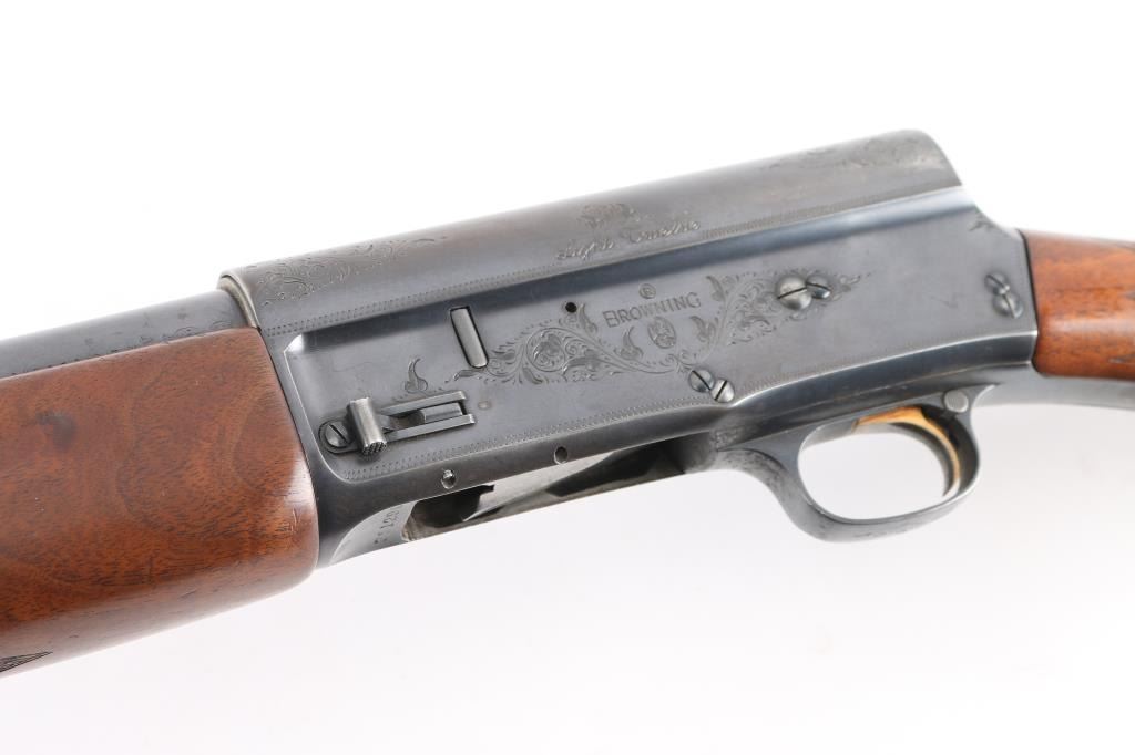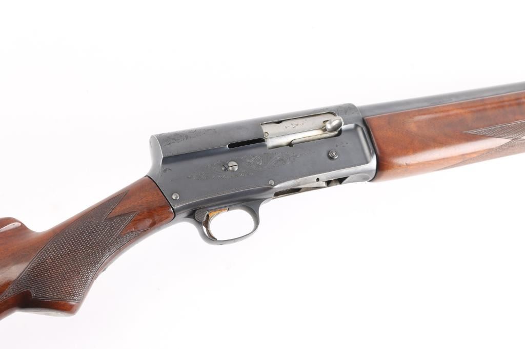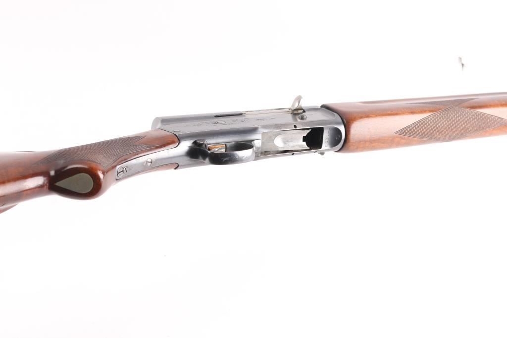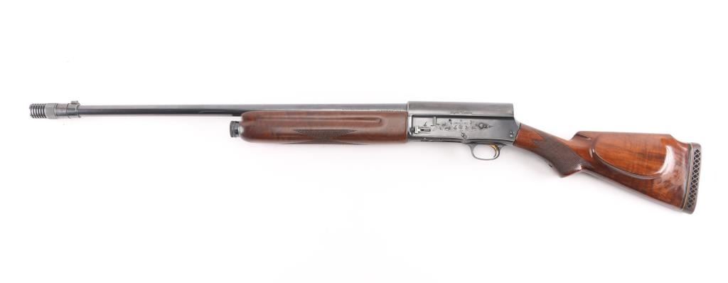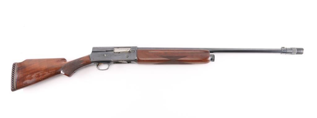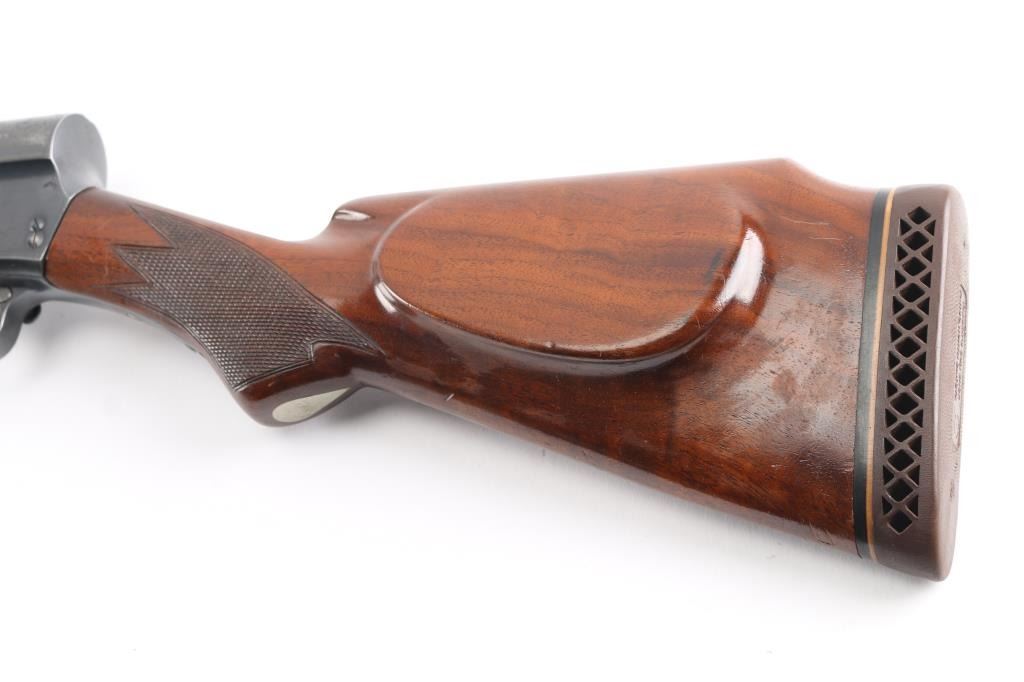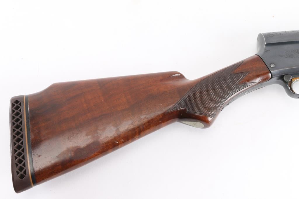 Vintage semiautomatic shotgun made in Belgium circa 1952. Featured blued finish, engraved receiver, plain barrel with matted anti-glare strip along top, added Polychoke measures 27" from muzzle to breech, push button safety at rear of triggerguard, magazine cut-off. Traces of gold wash remain on trigger. Replacement checkered walnut stocks include oversized forend & Monte Carlo type shoulder stock with right hand cheekpiece, high comb, ventilated rubber recoil pad. LoP 14", 13" to end of wood. Approx 2.5" drop at comb, 3.5" at heel. Stocks show good figure and wide checkering, well made in 1950's to 1960's style. Bright bore. Metal is very good plus with 80% to 90% original finish. Wood is very good with handling marks, a few dings. Mechanically sound.
