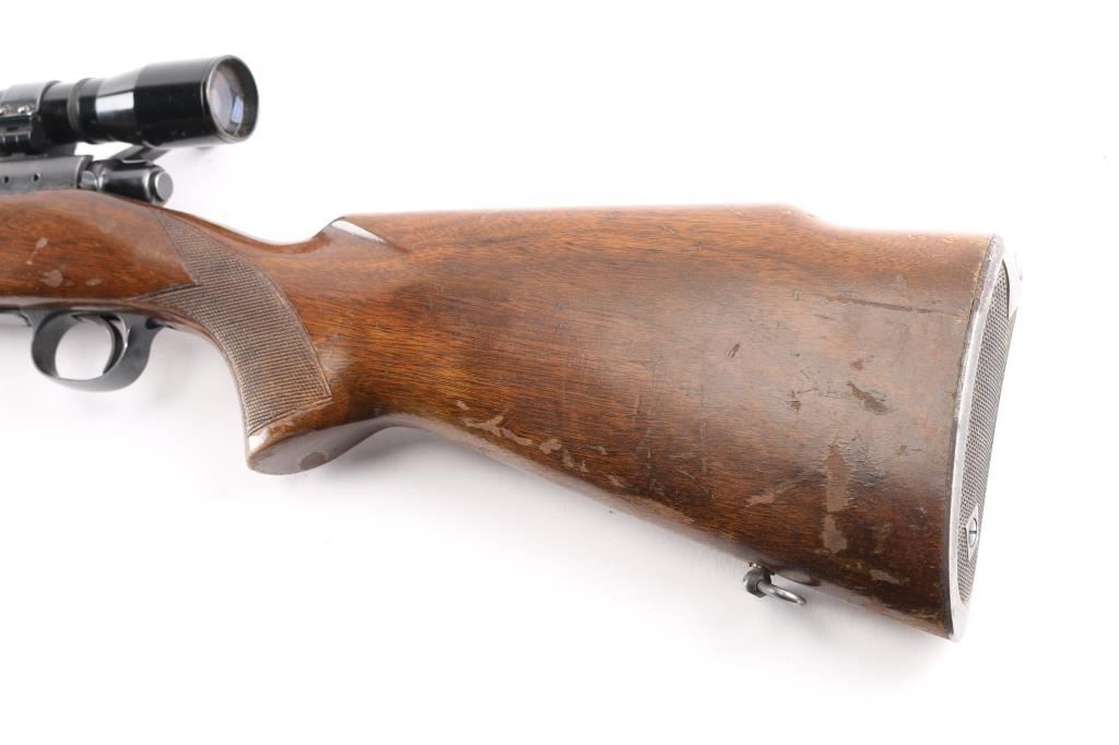 Vintage bolt action rifle has been carefully refinished. Manufactured circa 1954. Features satin blued finish, hinged floorplate, 26" barrel, blade front & folding adjustable rear sights, three position safety on bolt shroud, Weaver bases on receiver, Bushnell Scopemaster 4x scope with post & fine crosshair reticle. Walnut stock has sling swivels, checkered panels at sides of forend & curved wrist, checkered steel Niedner type butt plate. Bore is very good condition. Retains 90% medium gray colored finish, appears bead blasted & re-blued, with edge losses & handling marks, bare metal on bolt knob. Few small patina spots on barrel. Rear sight does not snap into up or down position, spring needs replacement. Stock is very good condition, finish losses throughout. with dents. Scope is good condition with clear view.